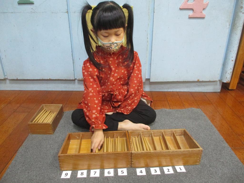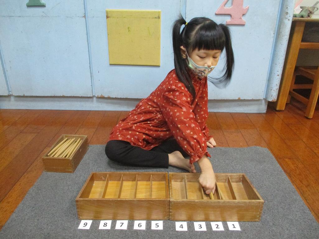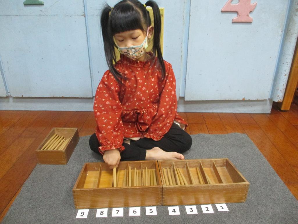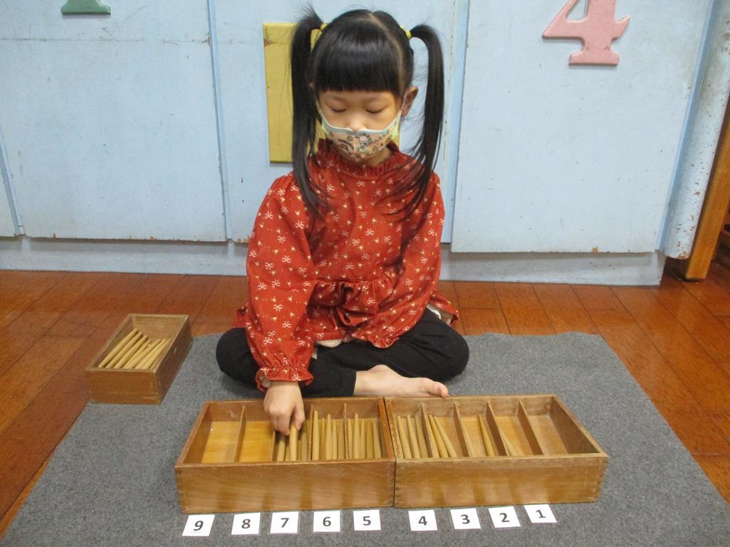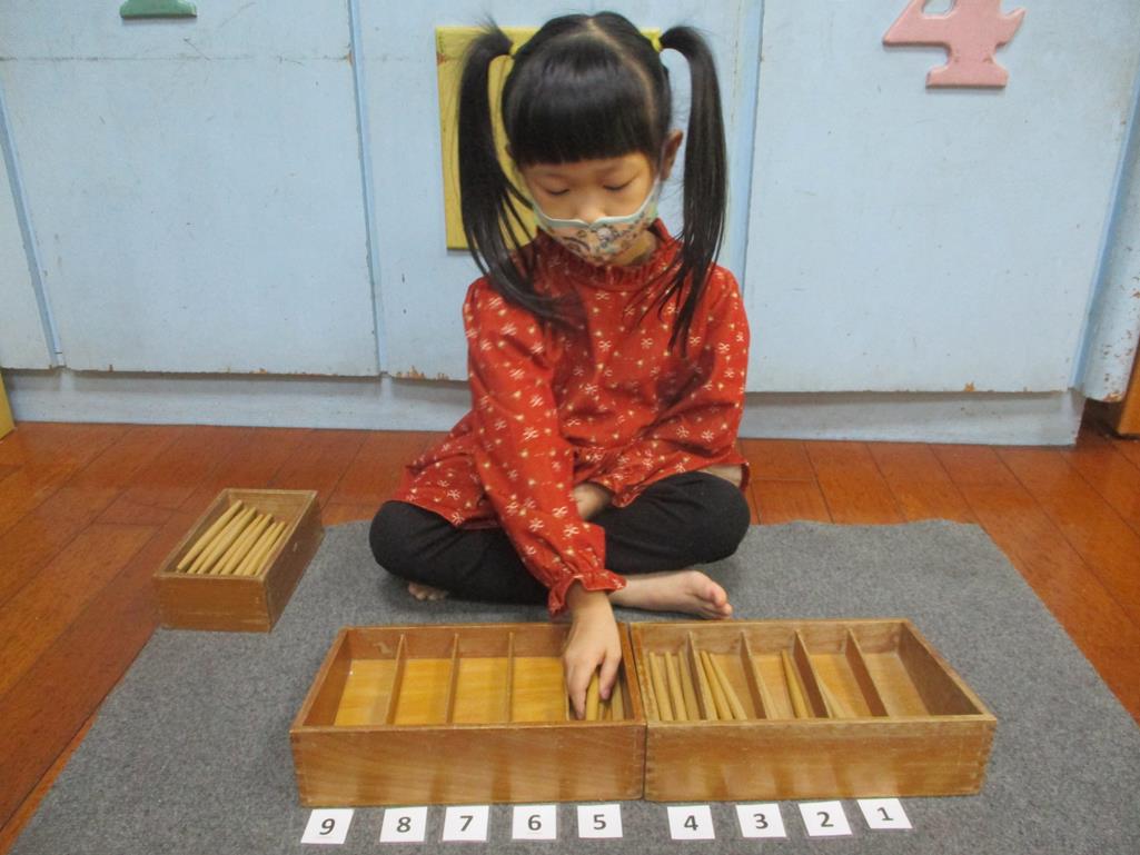 相簿名稱: 茉莉班-蒙特梭利教學(數學教育-紡錘棒箱 0~9)