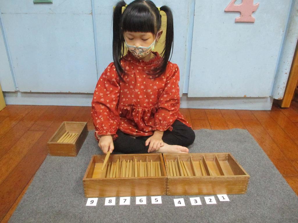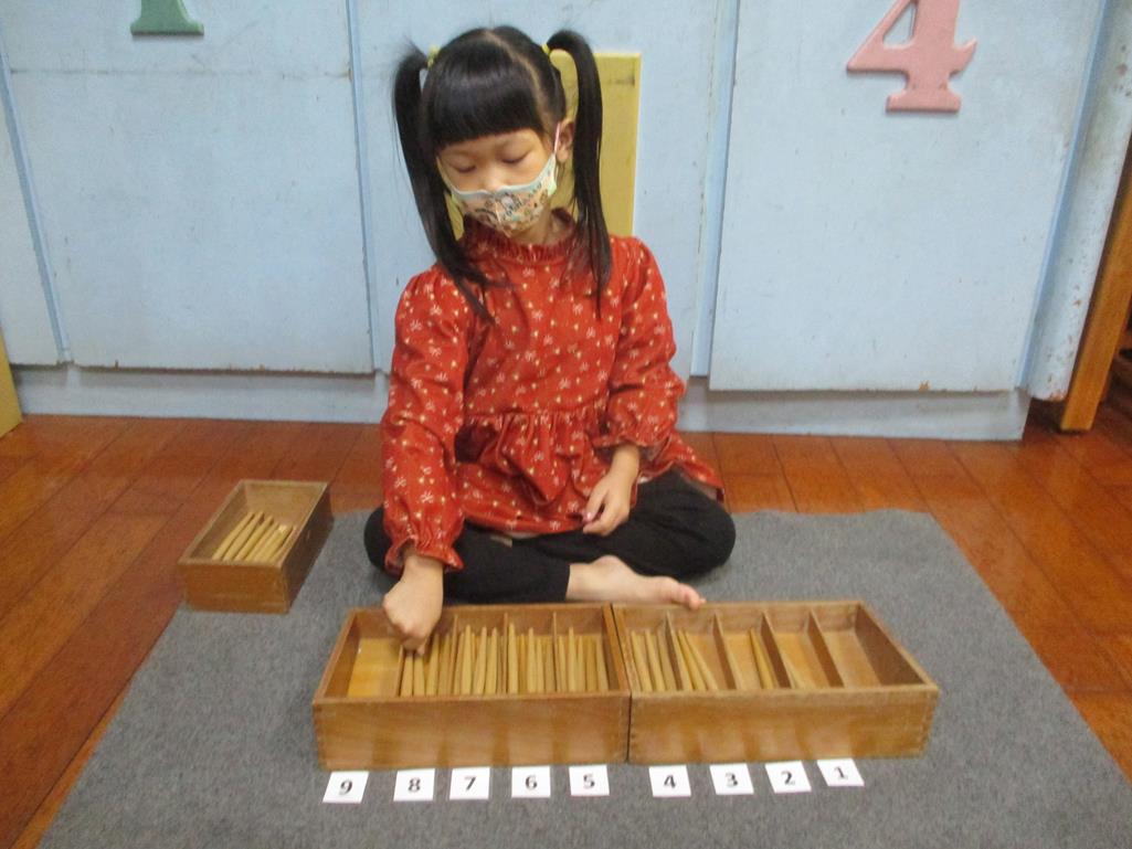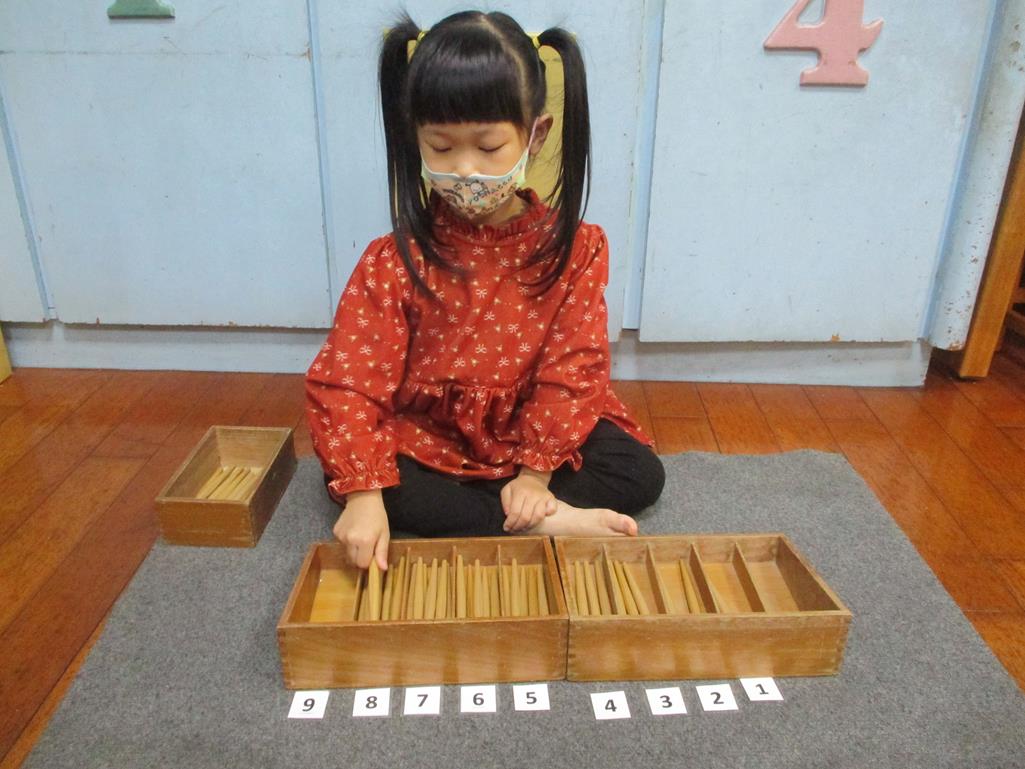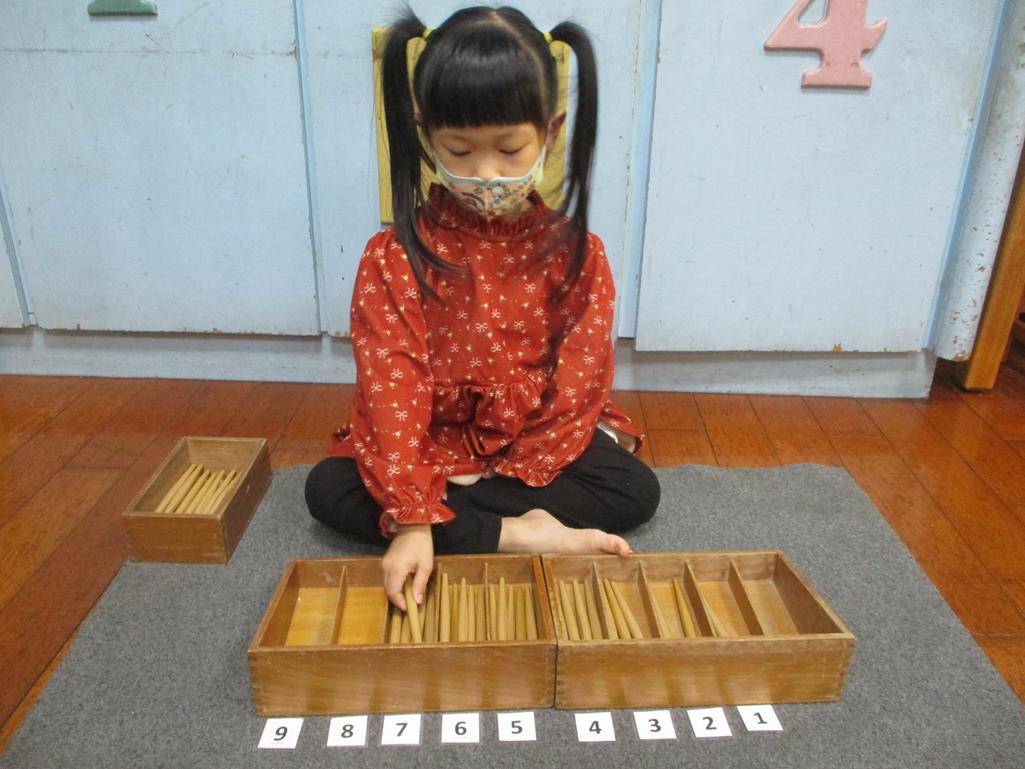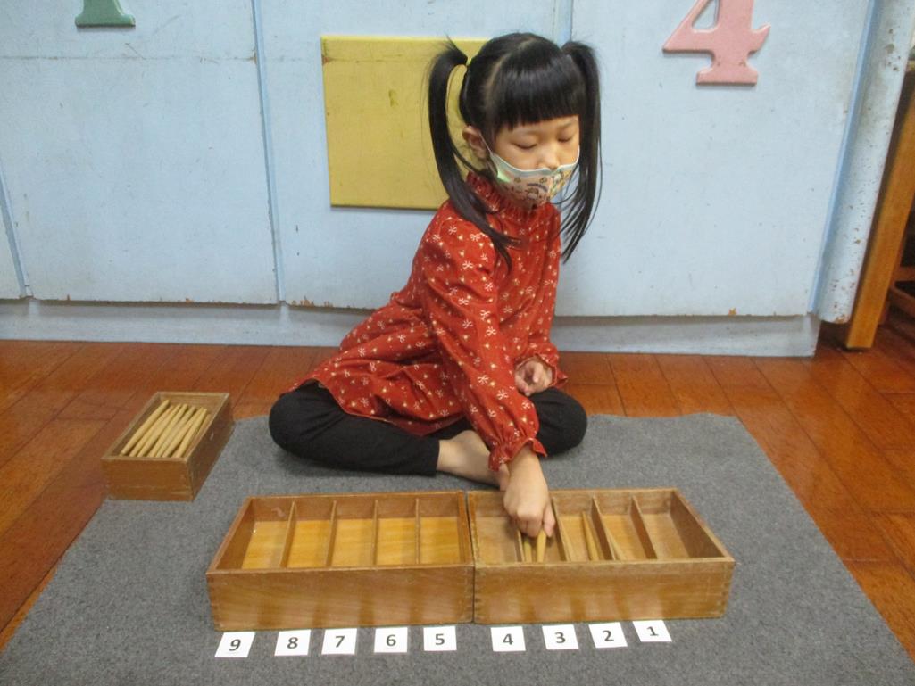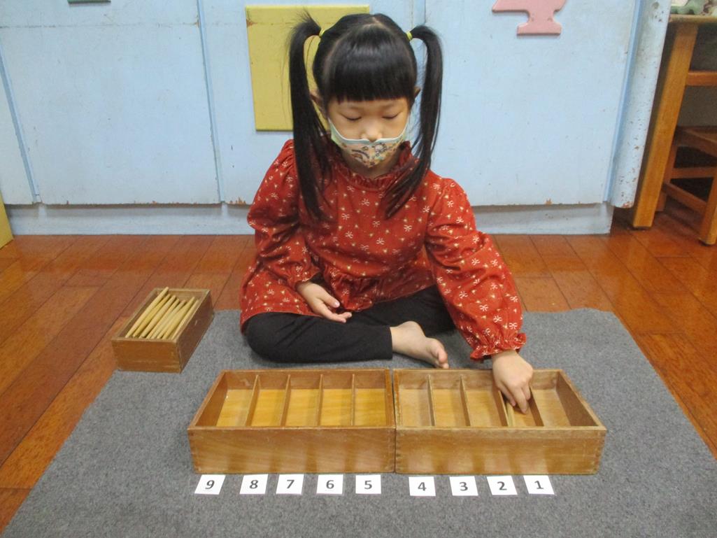 相簿名稱: 茉莉班-蒙特梭利教學(數學教育-紡錘棒箱 0~9)