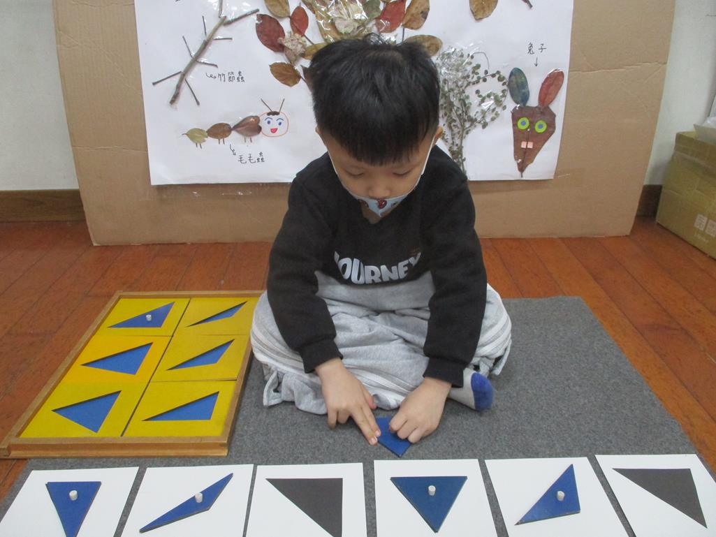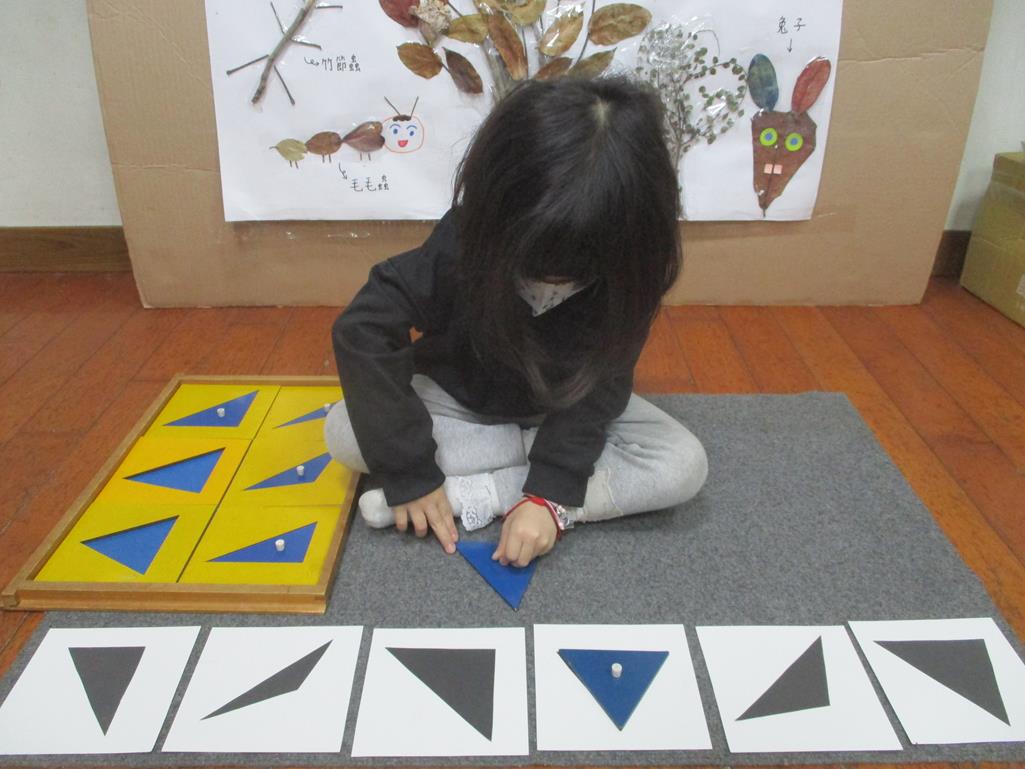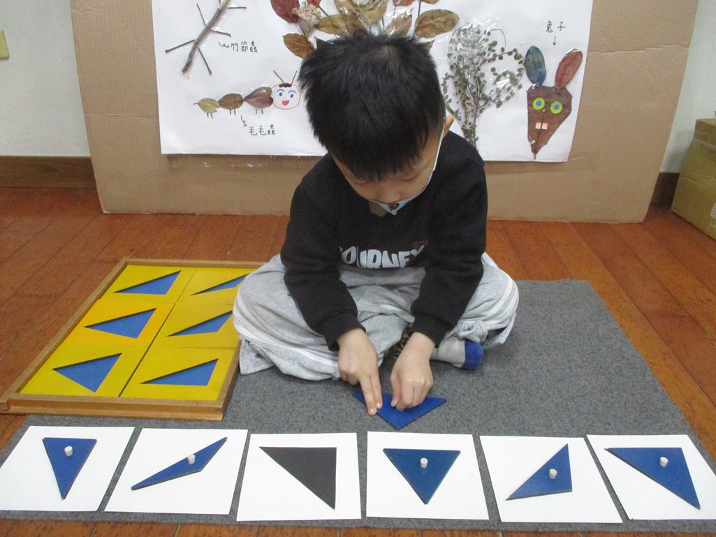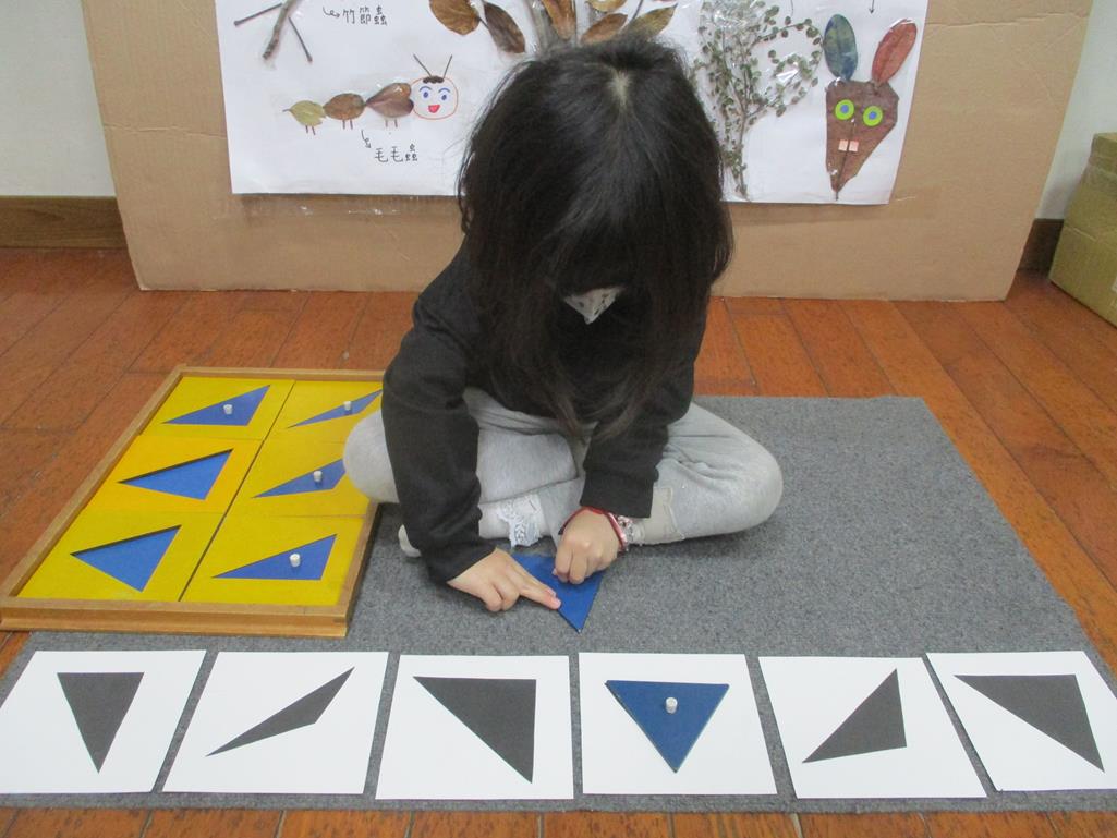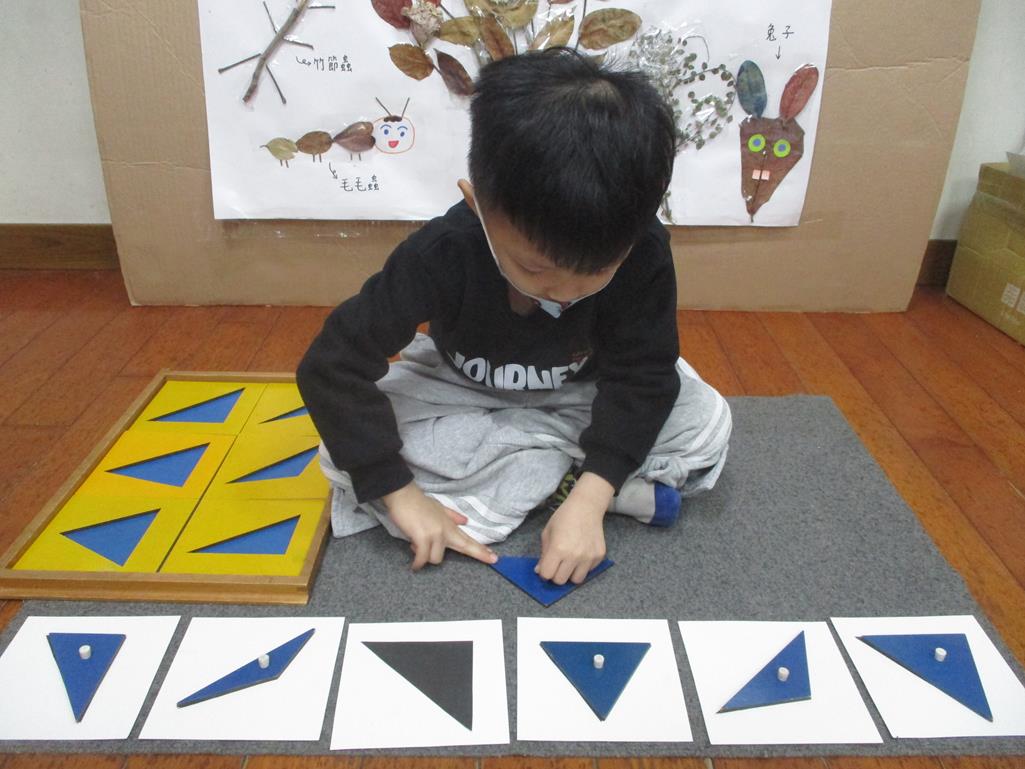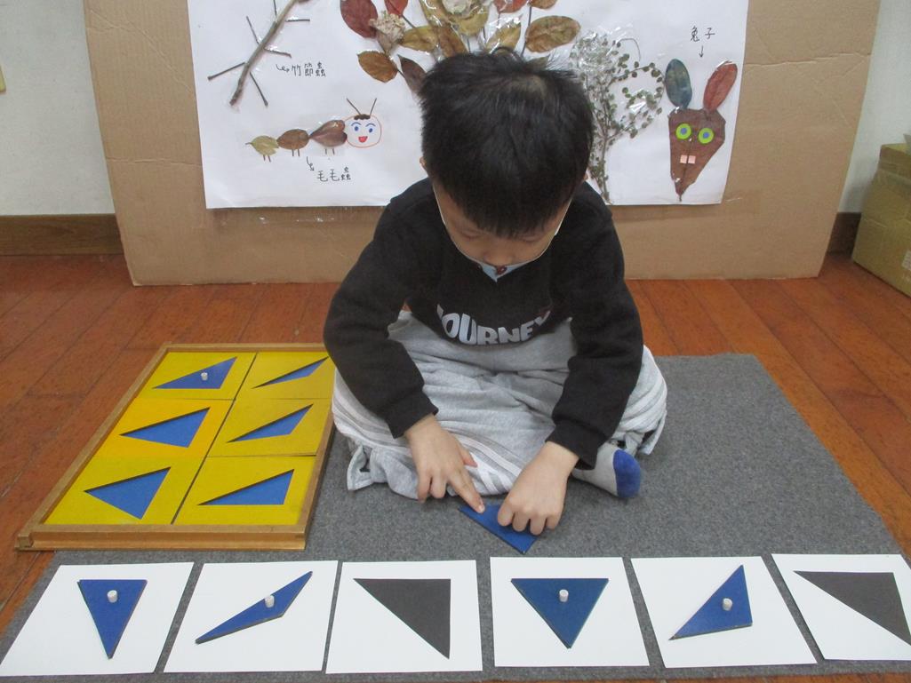 相簿名稱: 茉莉班-蒙特梭利教學(感官教育-幾何拼圖櫥(三角形)+實心卡)