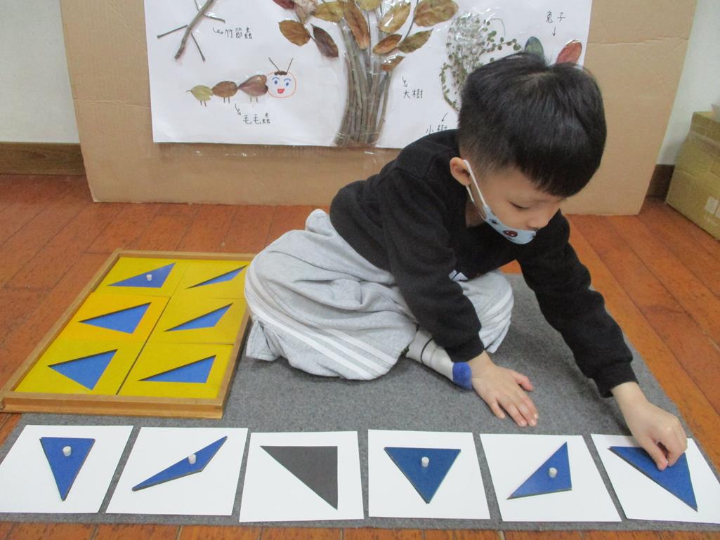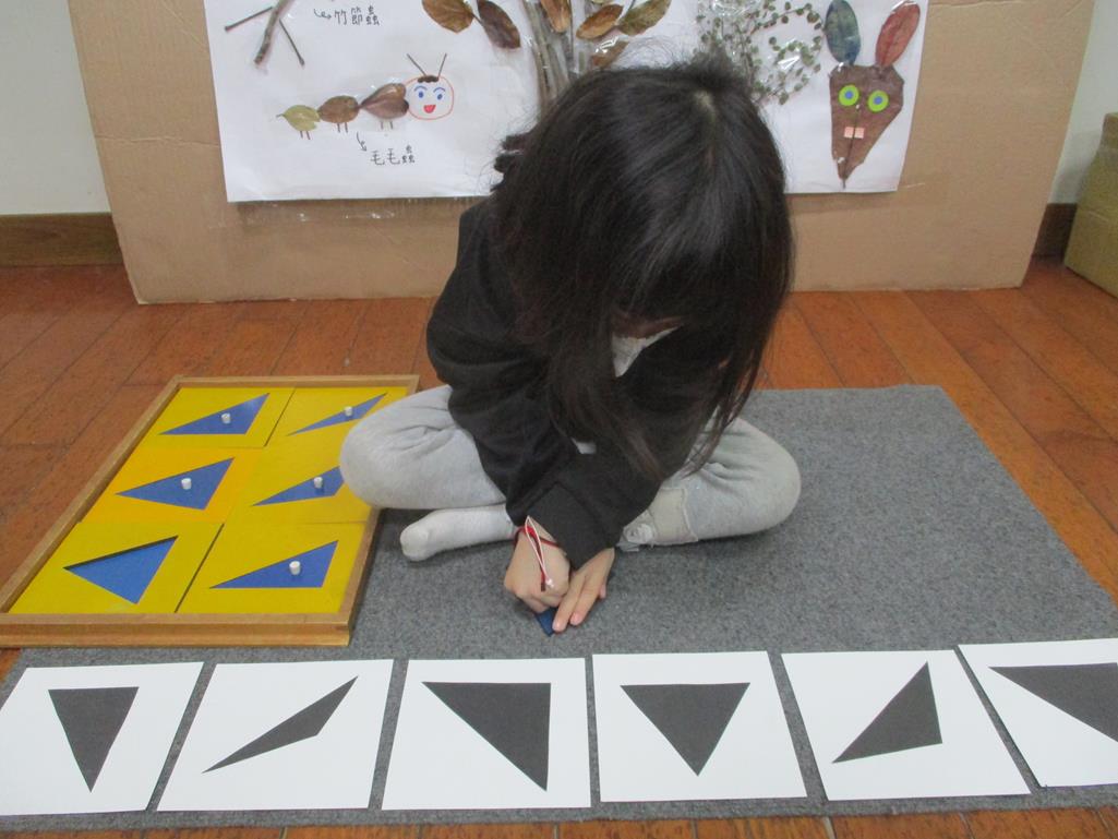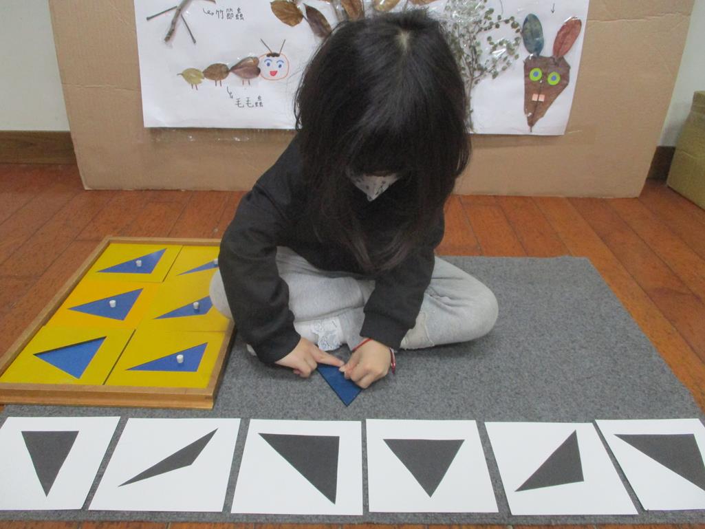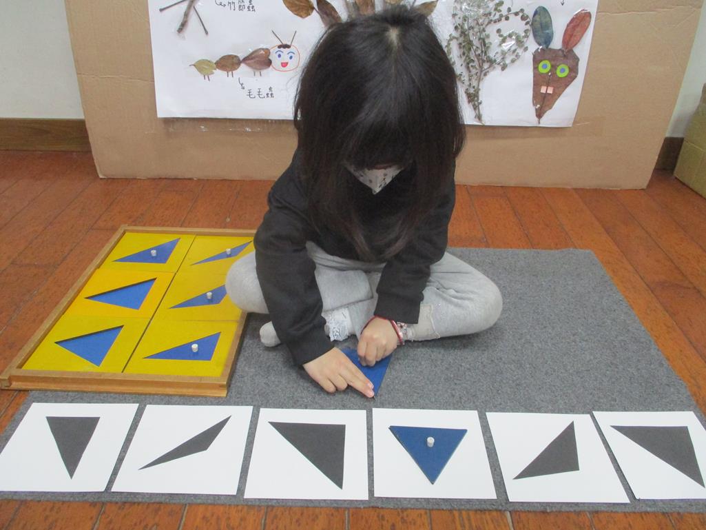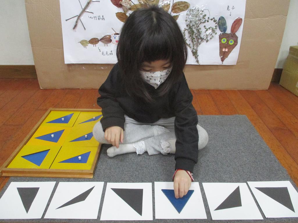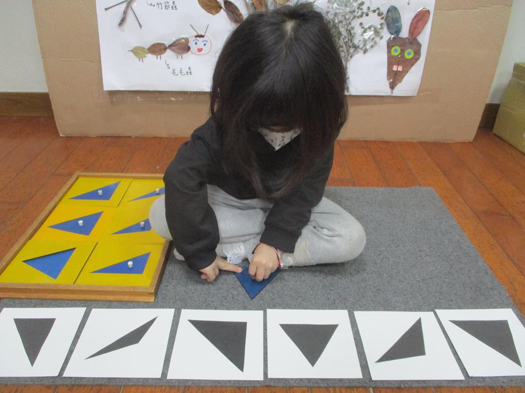 相簿名稱: 茉莉班-蒙特梭利教學(感官教育-幾何拼圖櫥(三角形)+實心卡)