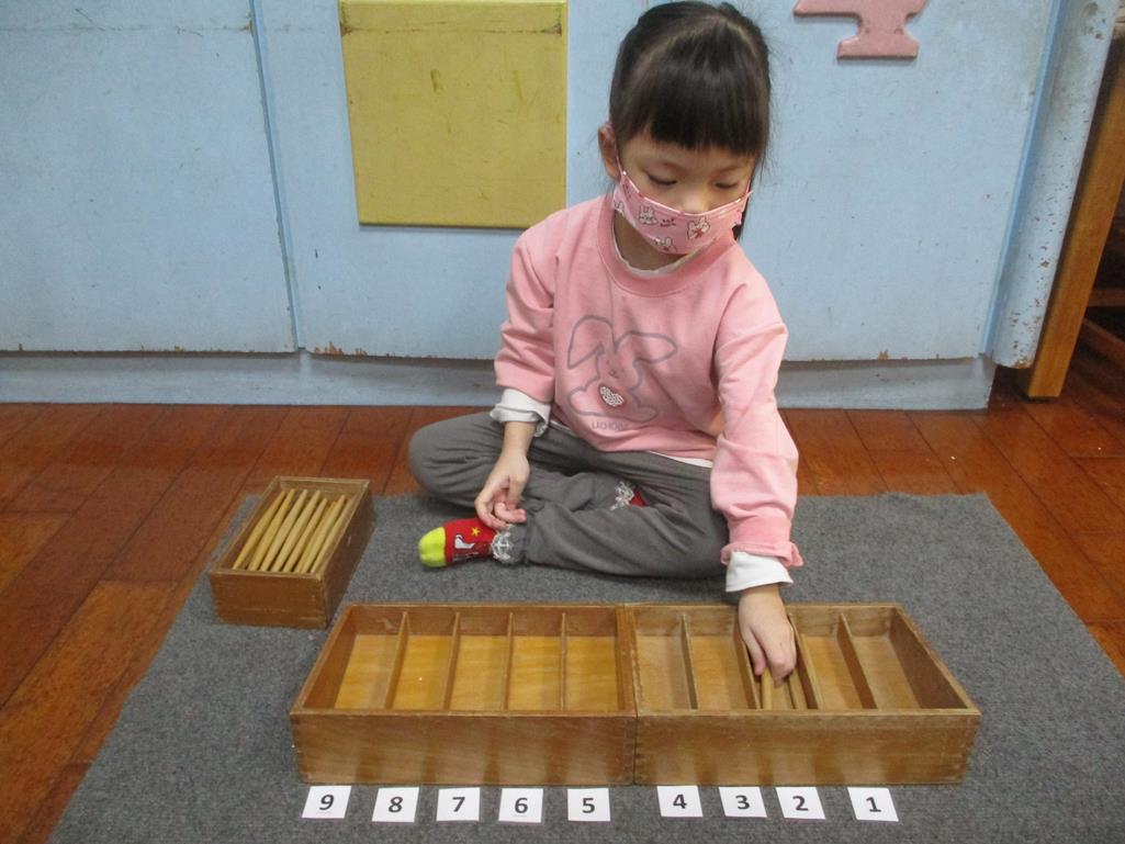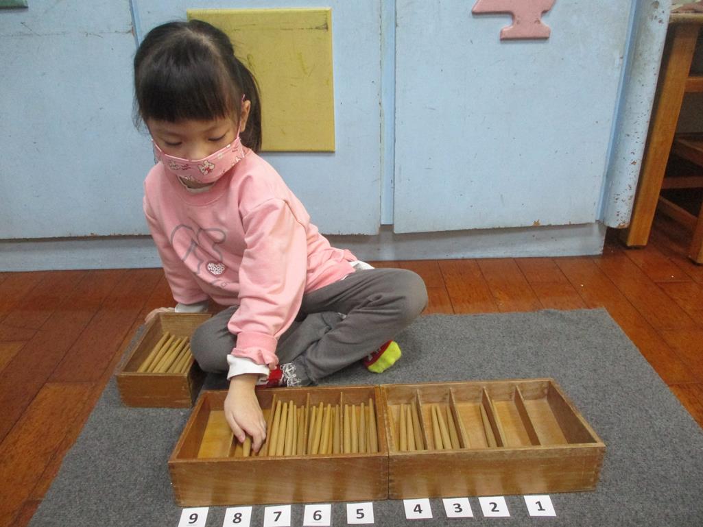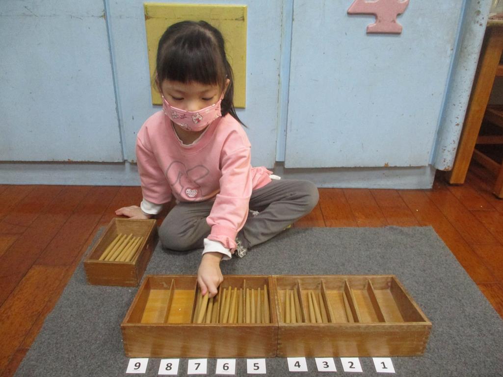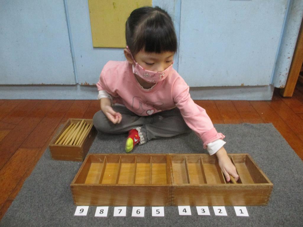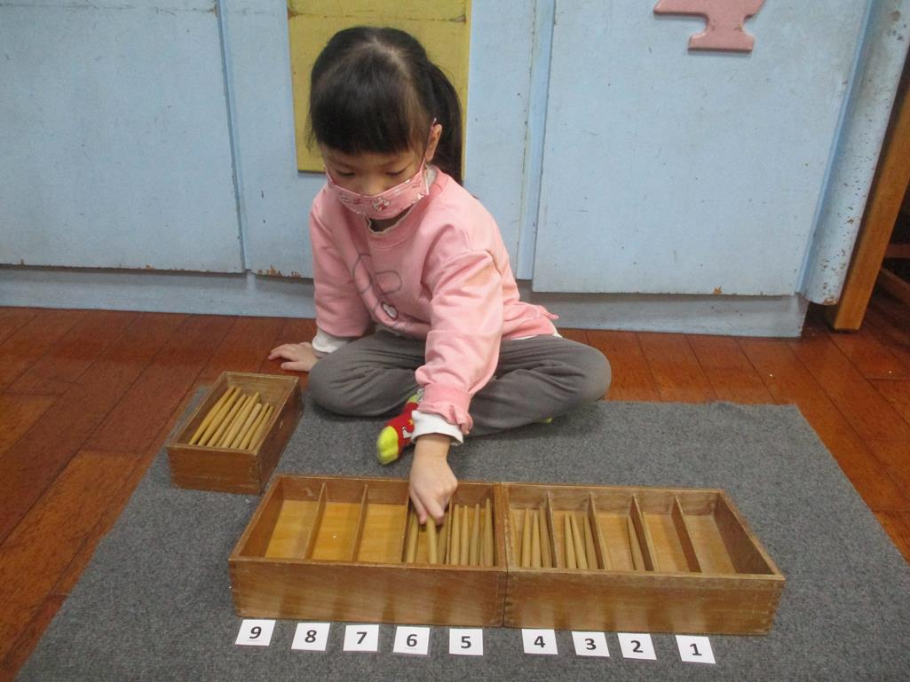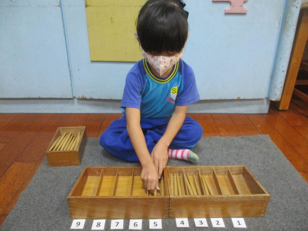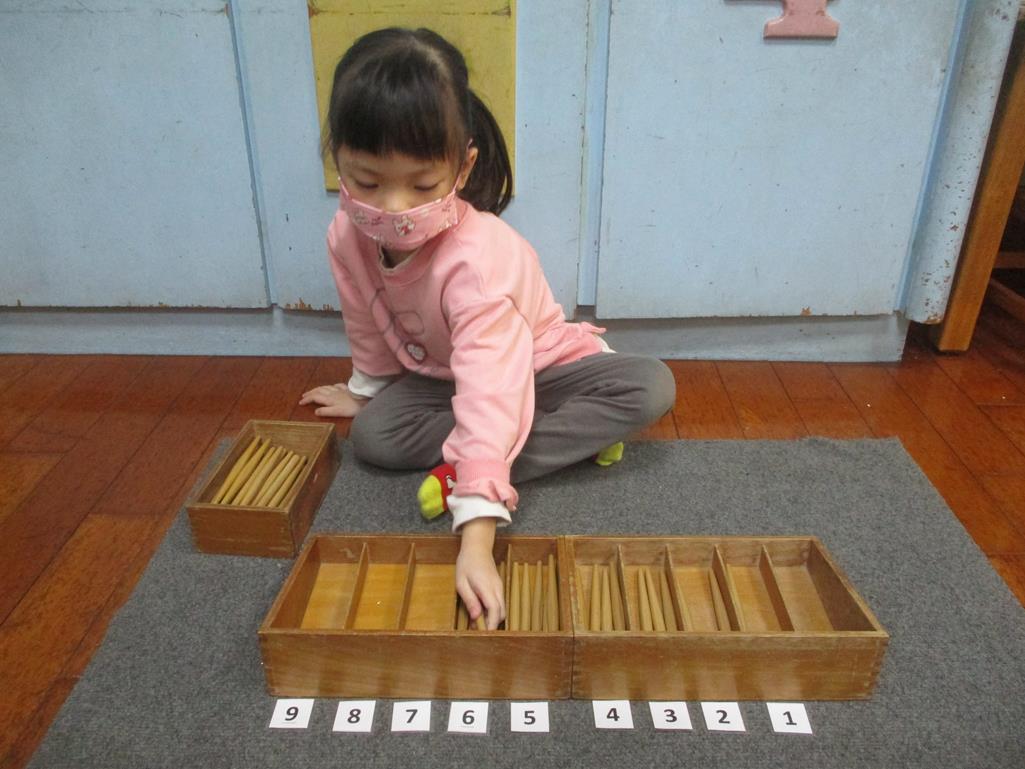 相簿名稱: 茉莉班-蒙特梭利教學(數學教育-紡錘棒箱 0~9)
