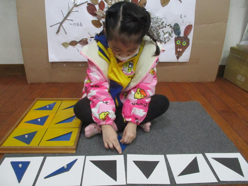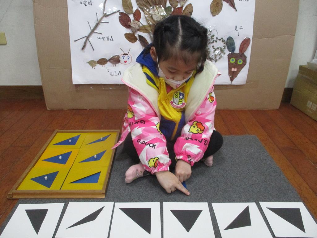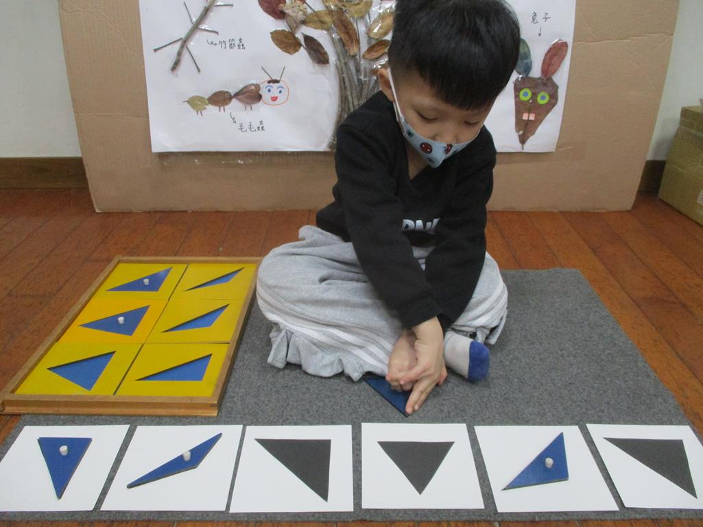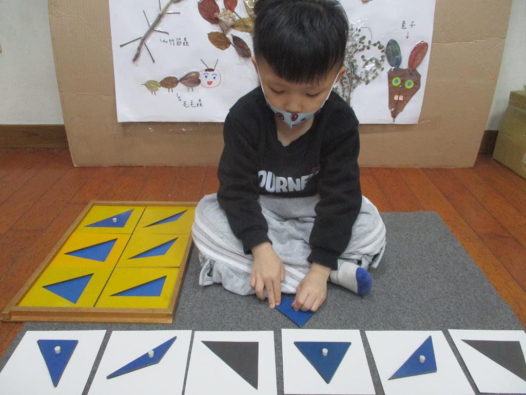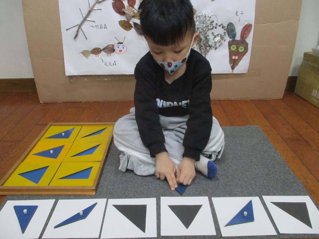 相簿名稱: 茉莉班-蒙特梭利教學(感官教育-幾何拼圖櫥(三角形)+實心卡)