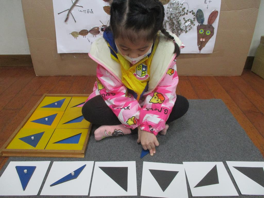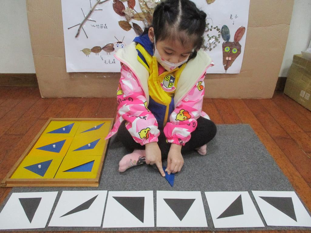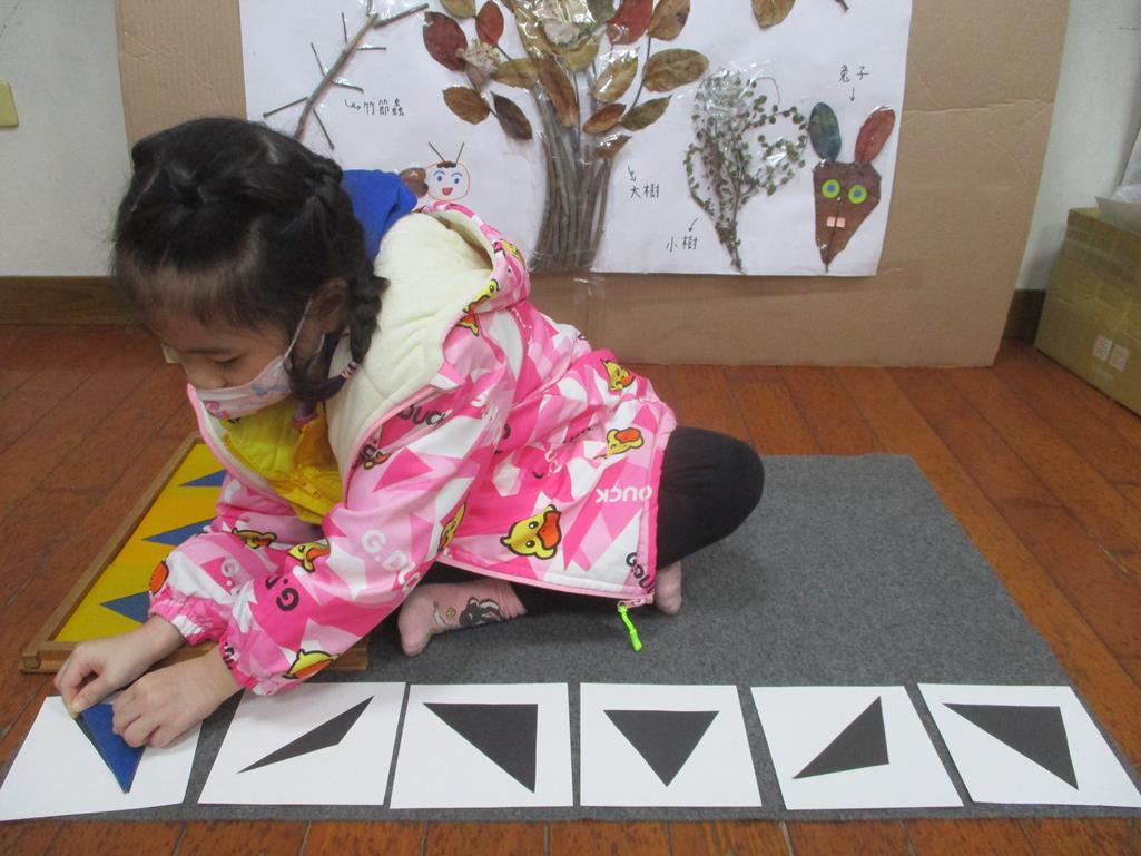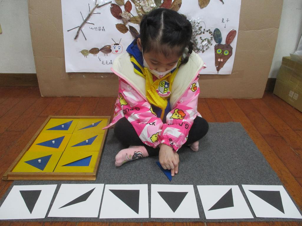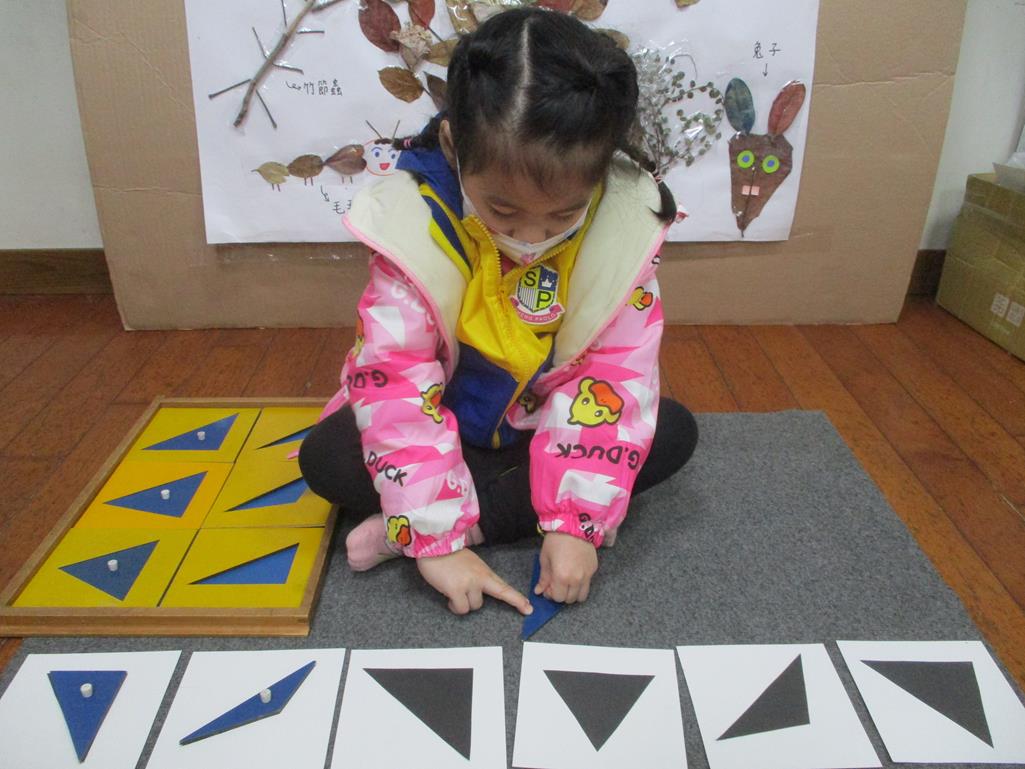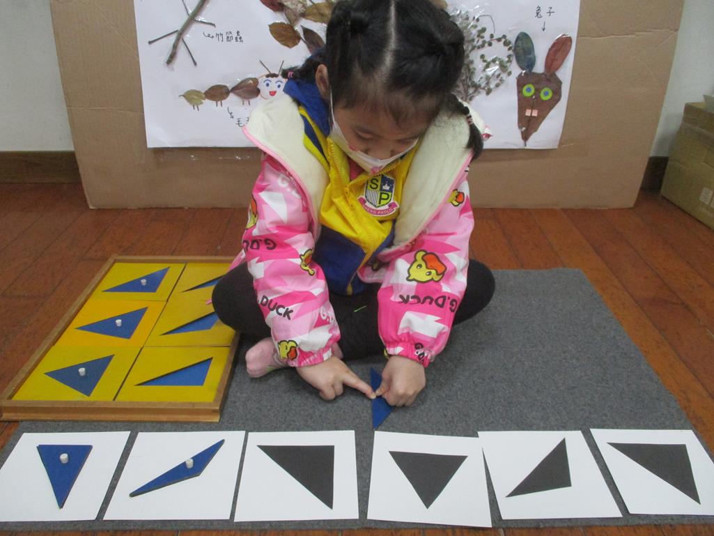 相簿名稱: 茉莉班-蒙特梭利教學(感官教育-幾何拼圖櫥(三角形)+實心卡)