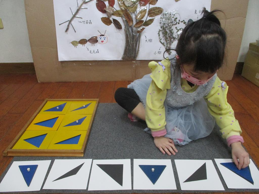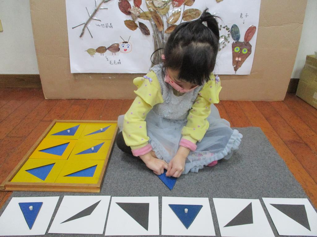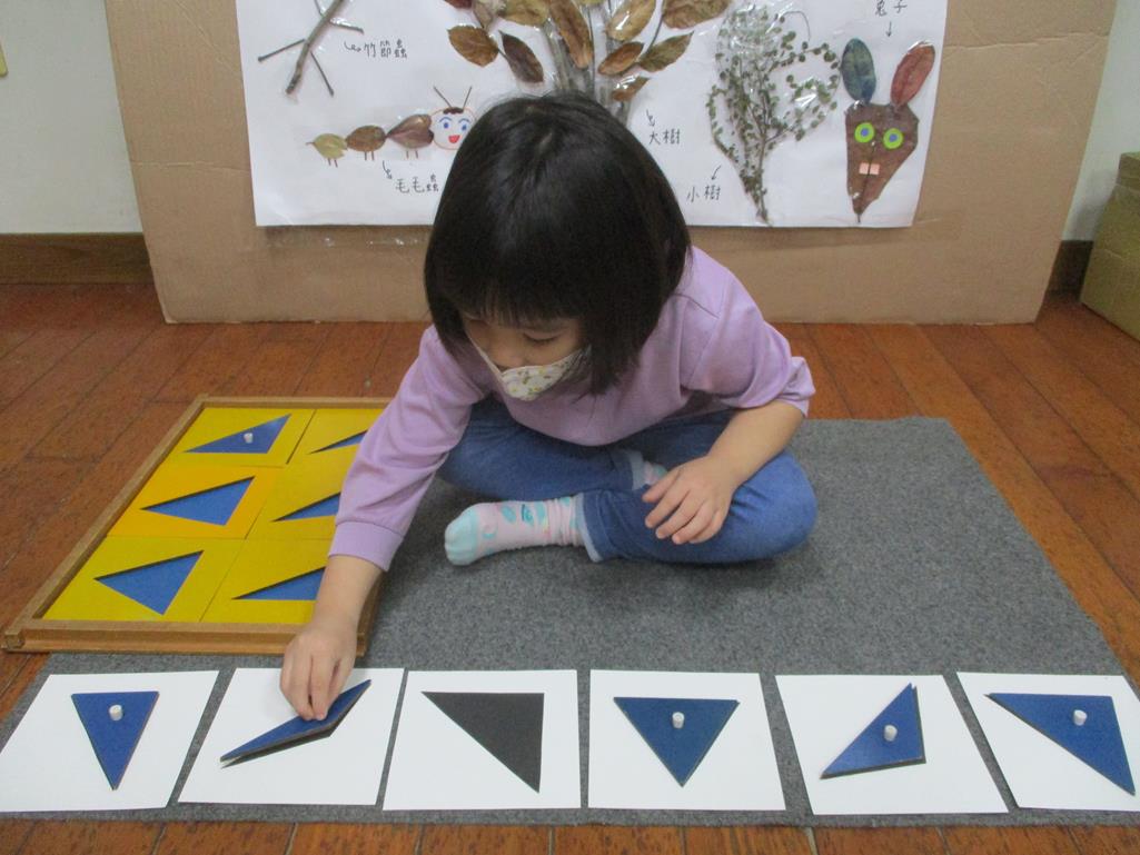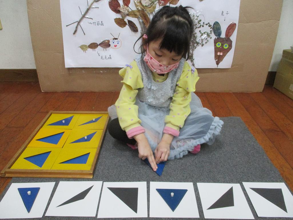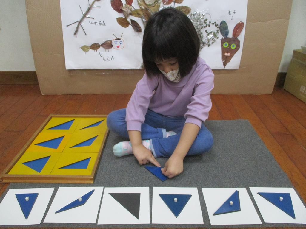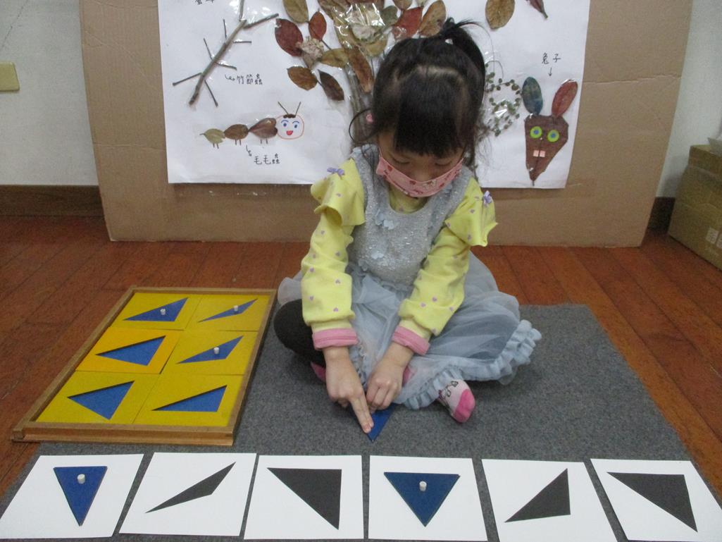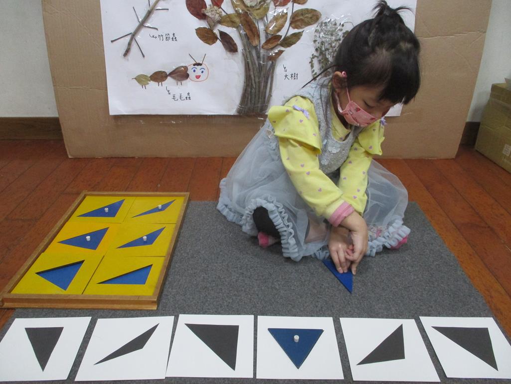相簿名稱: 茉莉班-蒙特梭利教學(感官教育-幾何拼圖櫥(三角形)+實心卡)