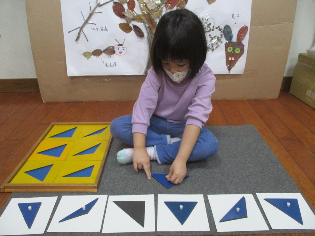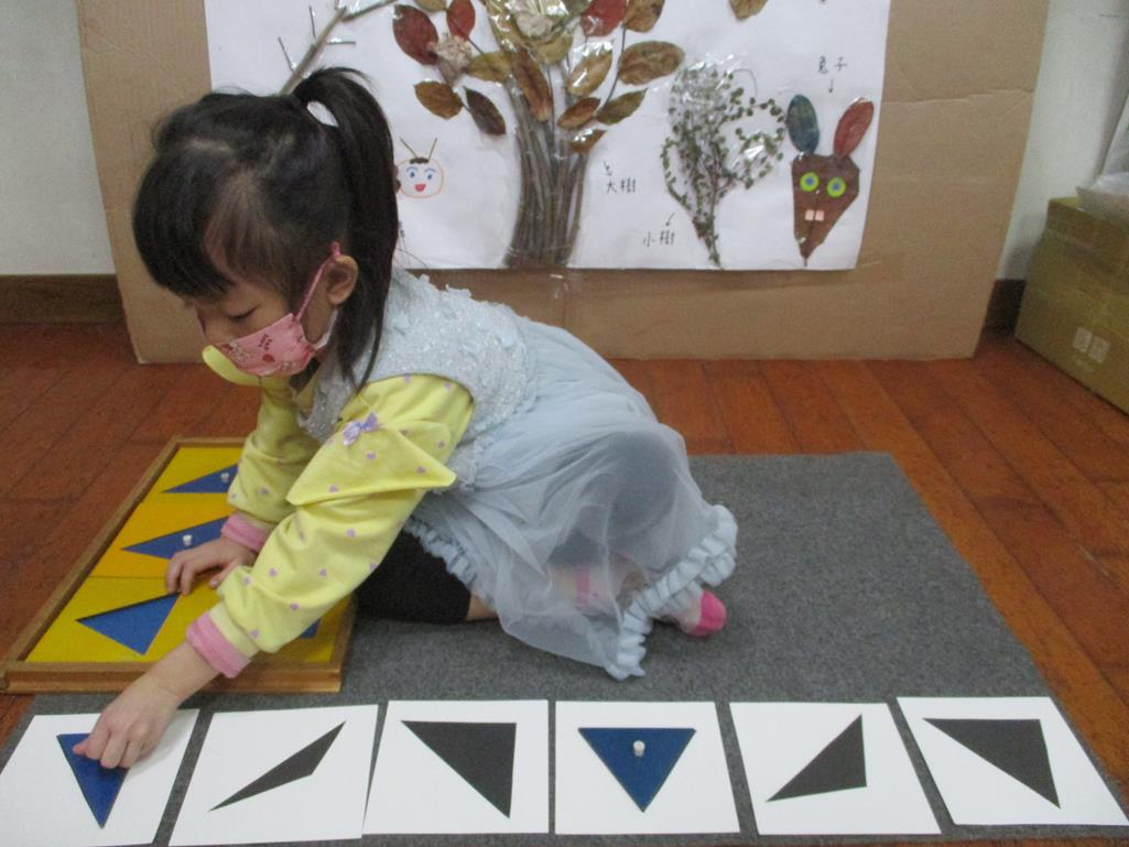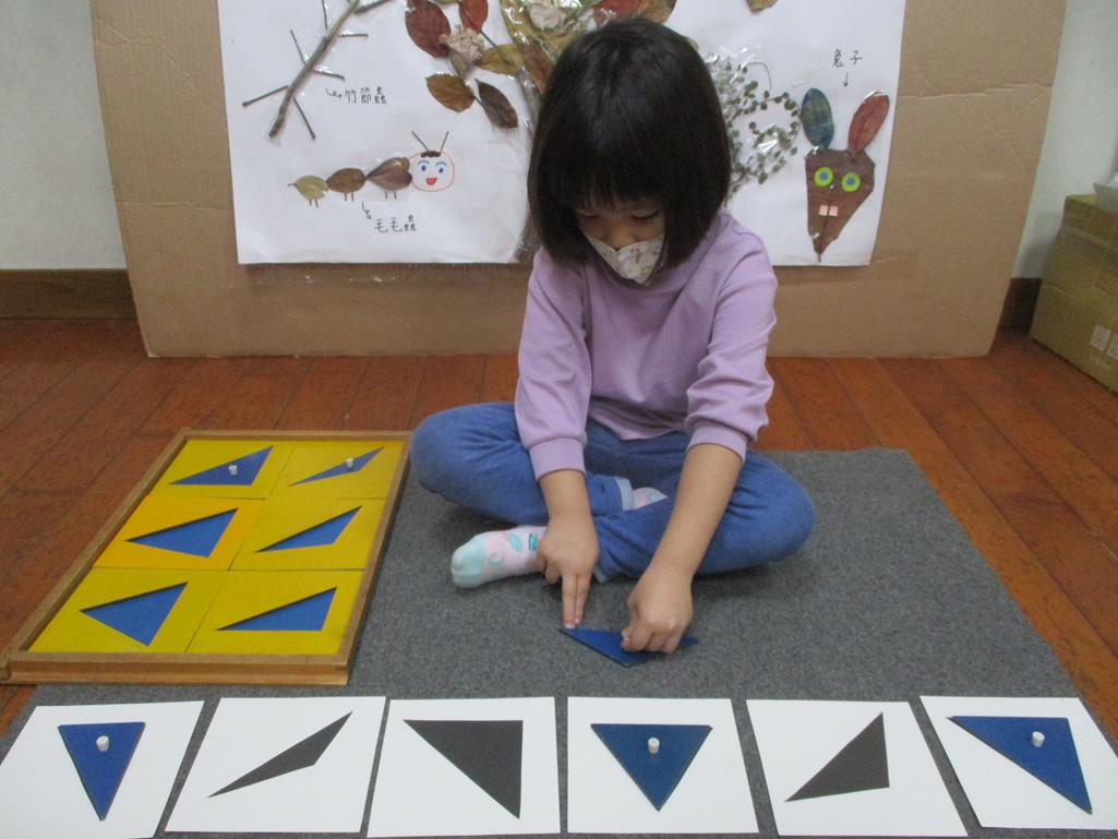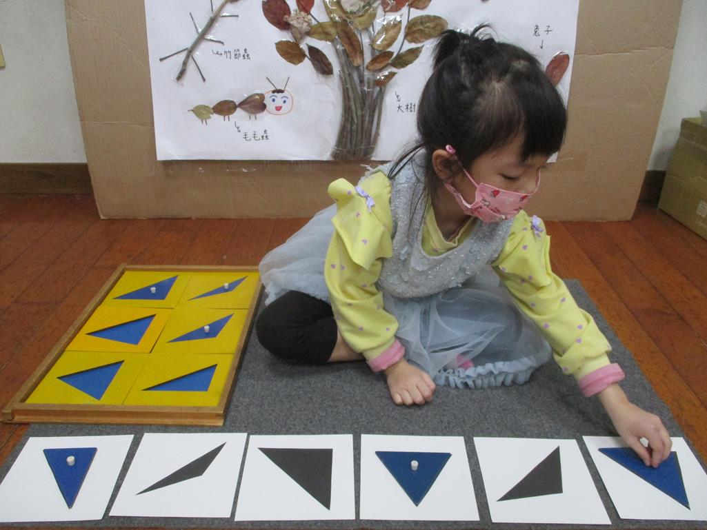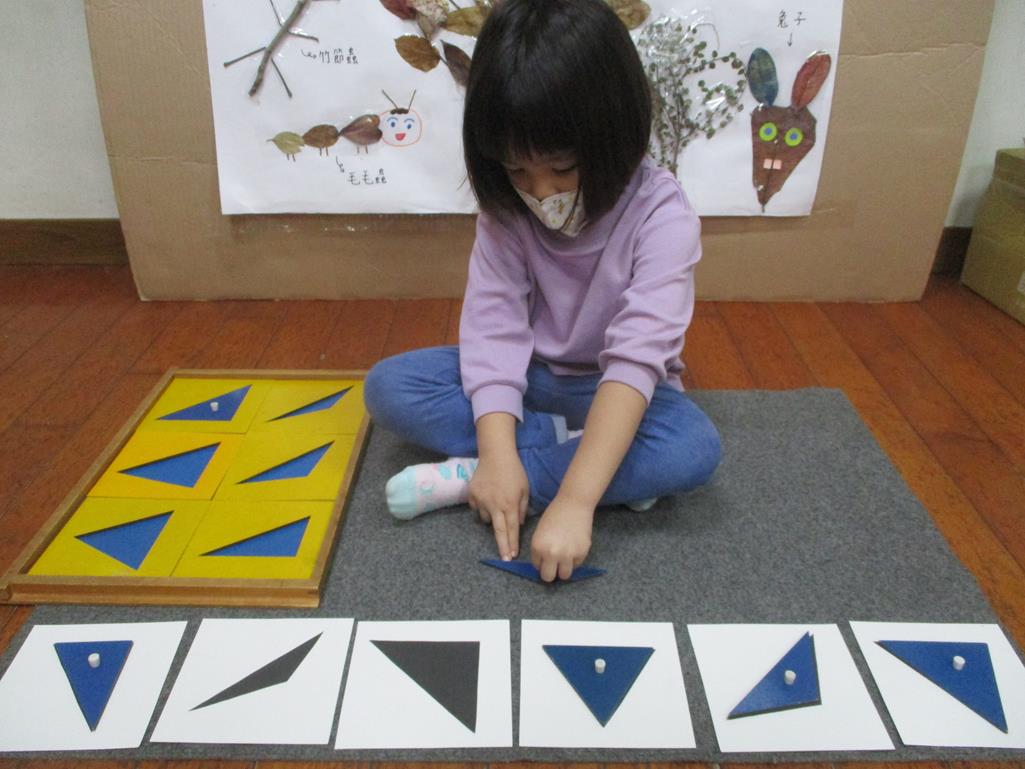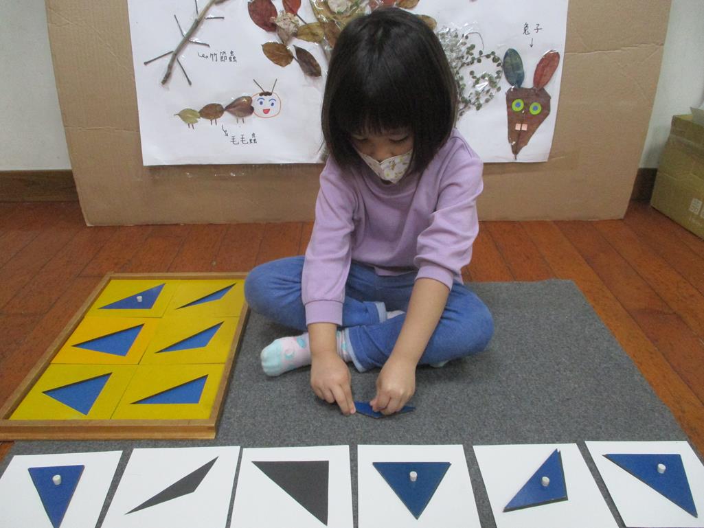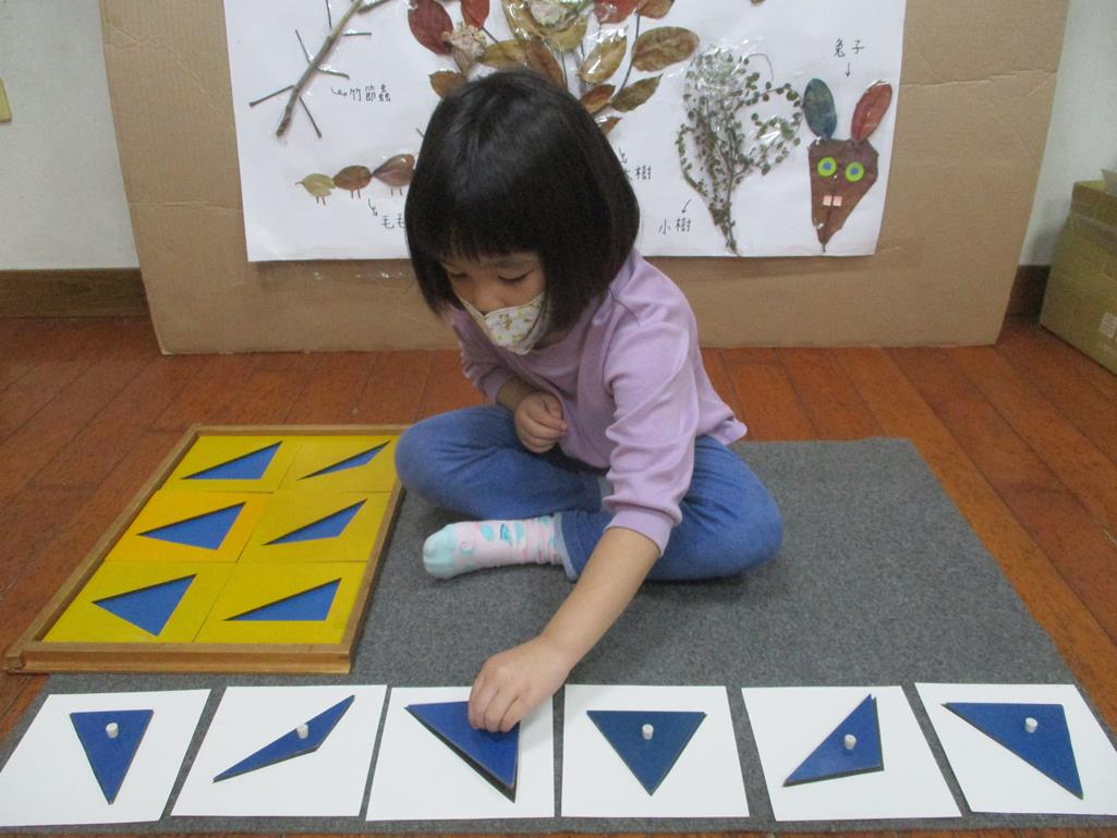 相簿名稱: 茉莉班-蒙特梭利教學(感官教育-幾何拼圖櫥(三角形)+實心卡)