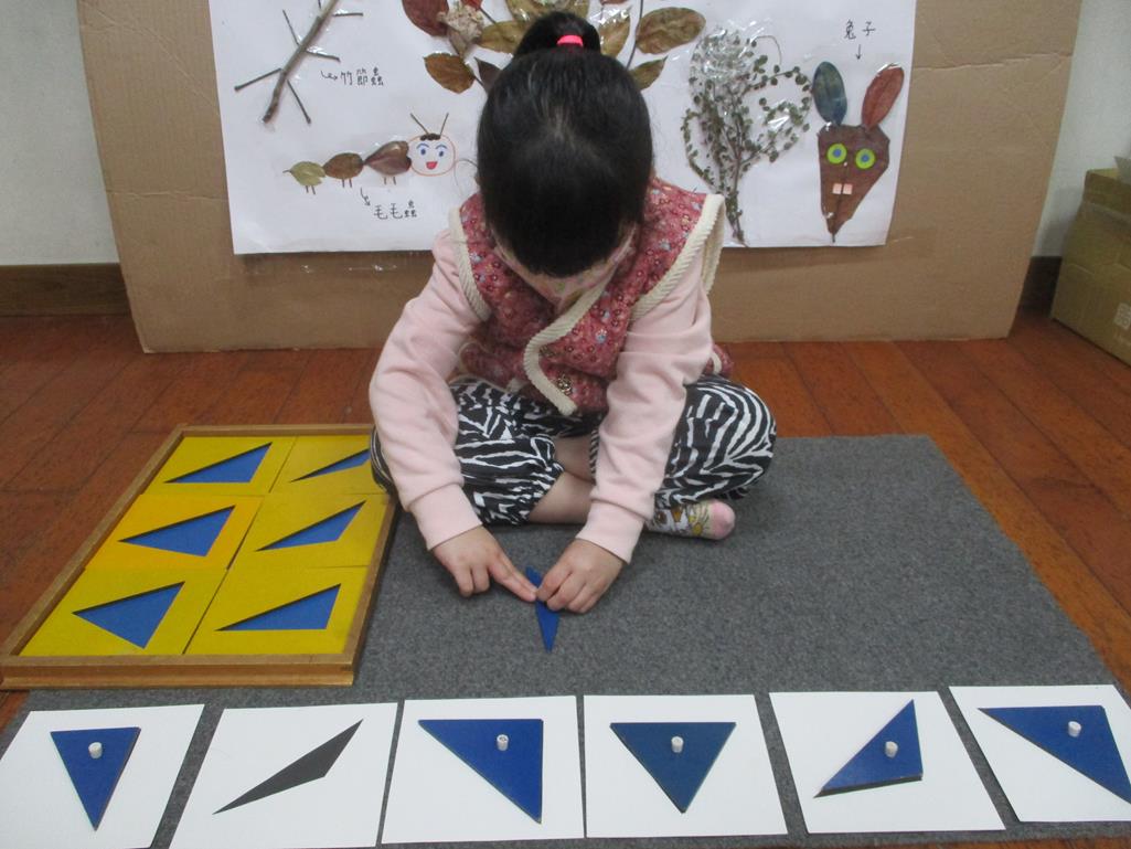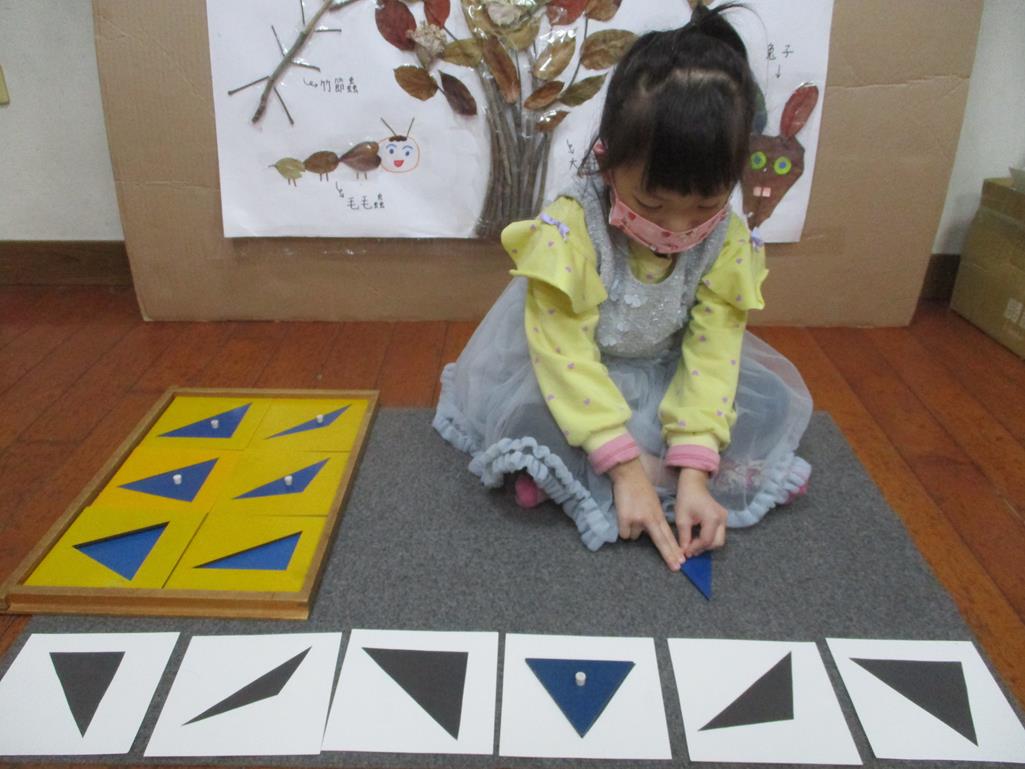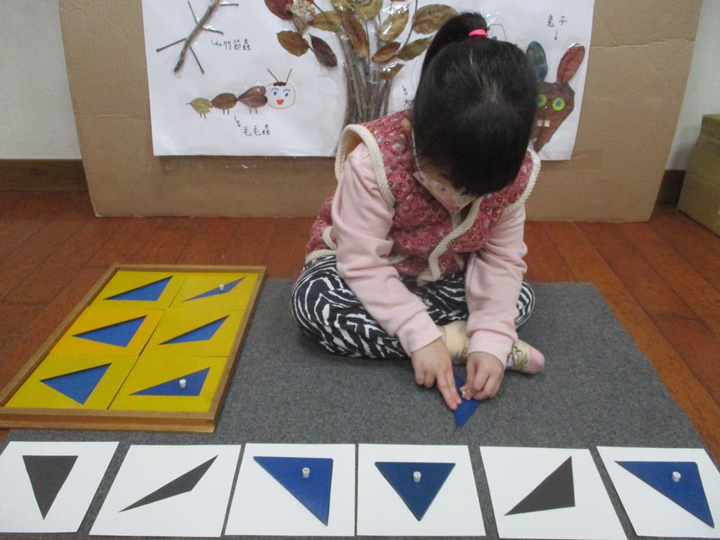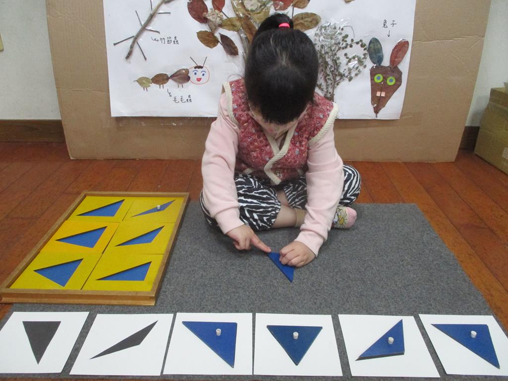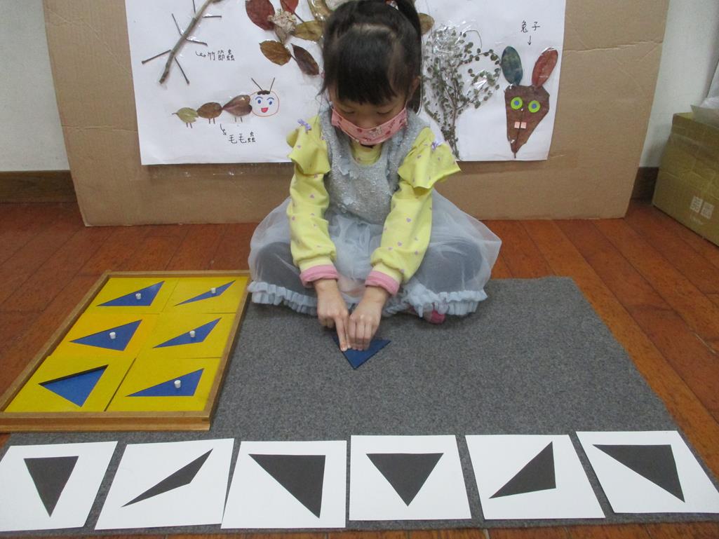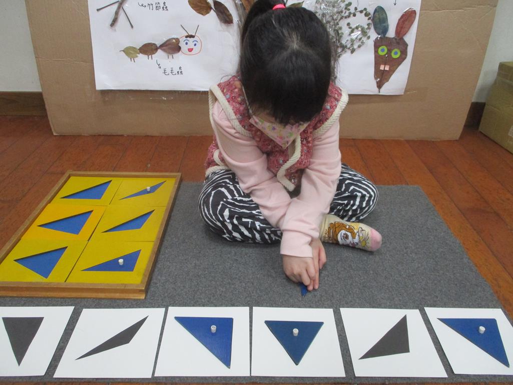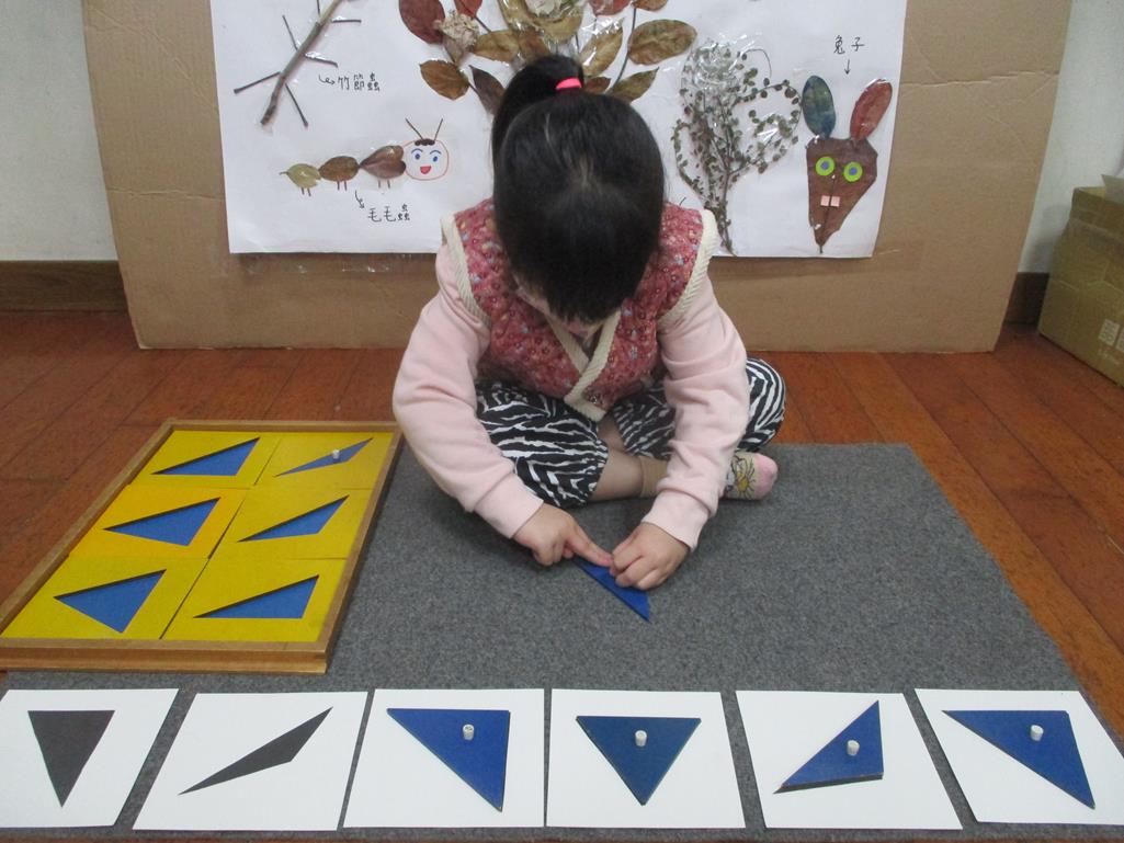 相簿名稱: 茉莉班-蒙特梭利教學(感官教育-幾何拼圖櫥(三角形)+實心卡)