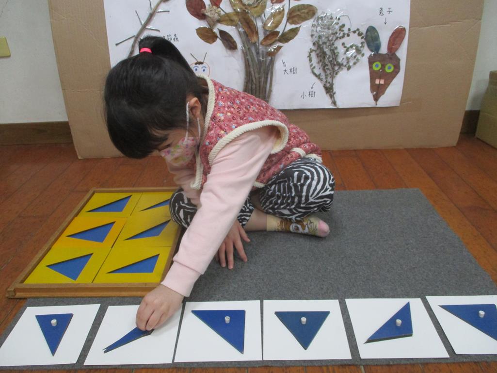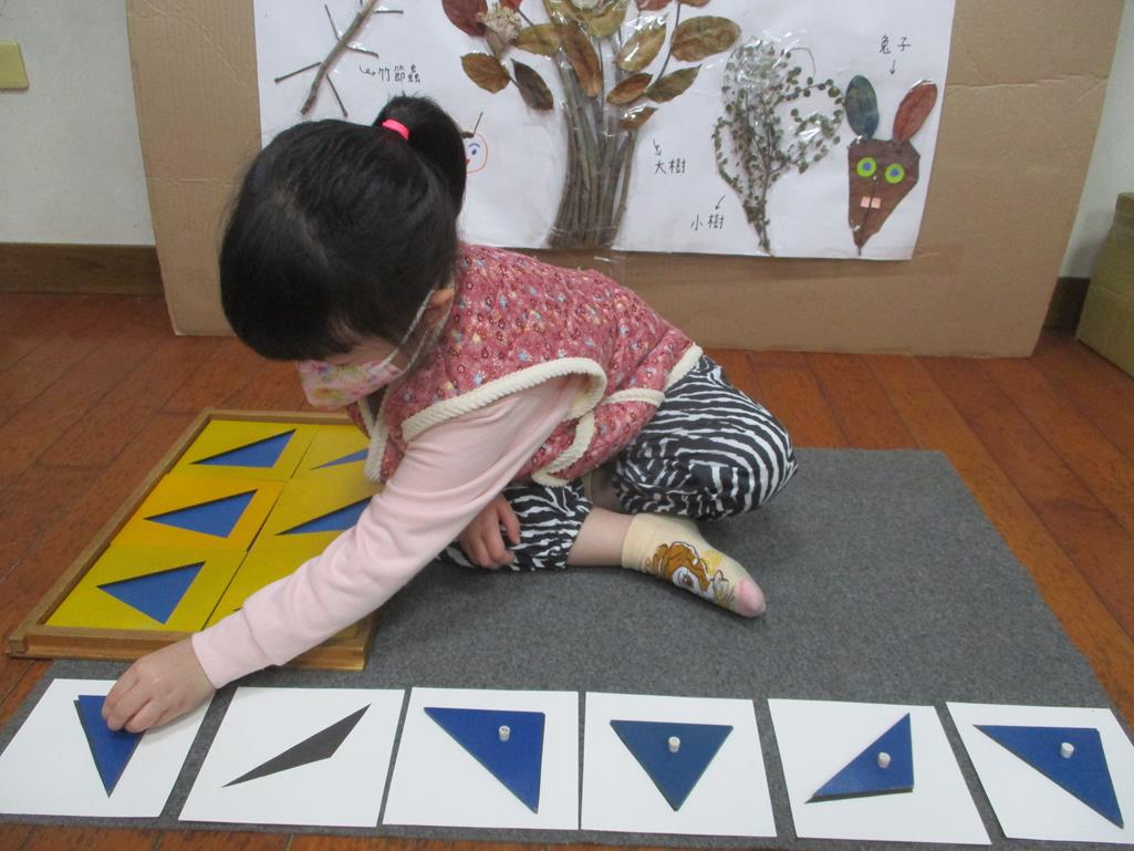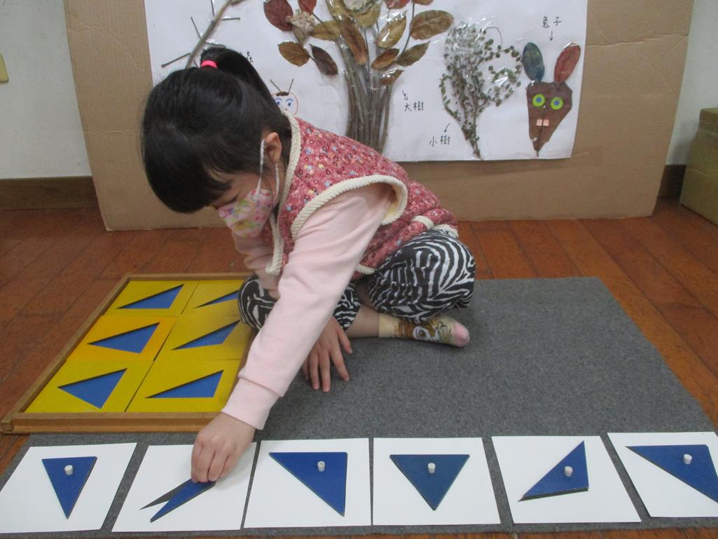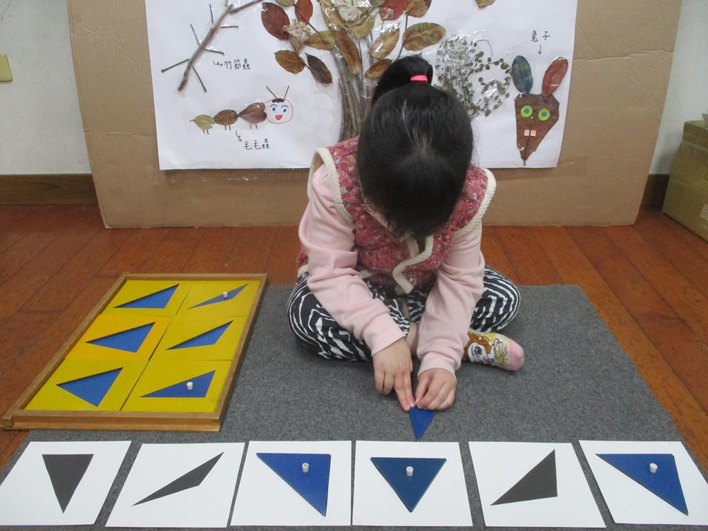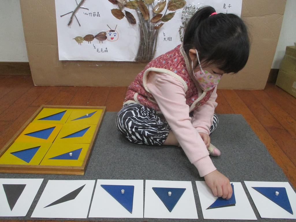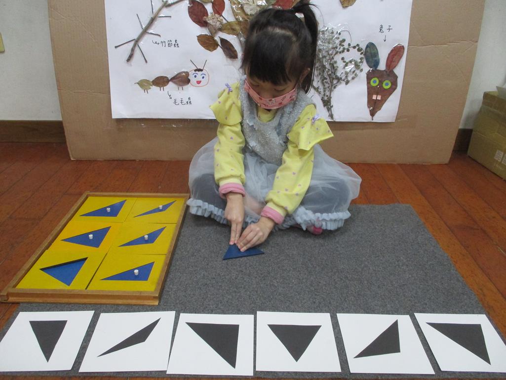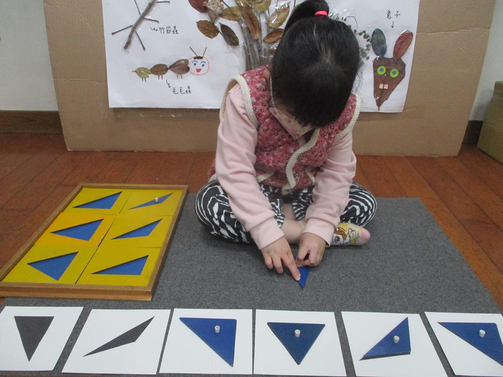 相簿名稱: 茉莉班-蒙特梭利教學(感官教育-幾何拼圖櫥(三角形)+實心卡)