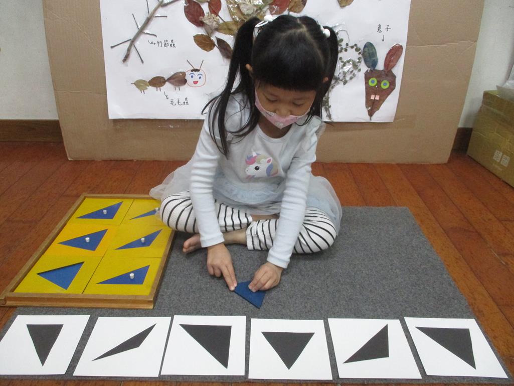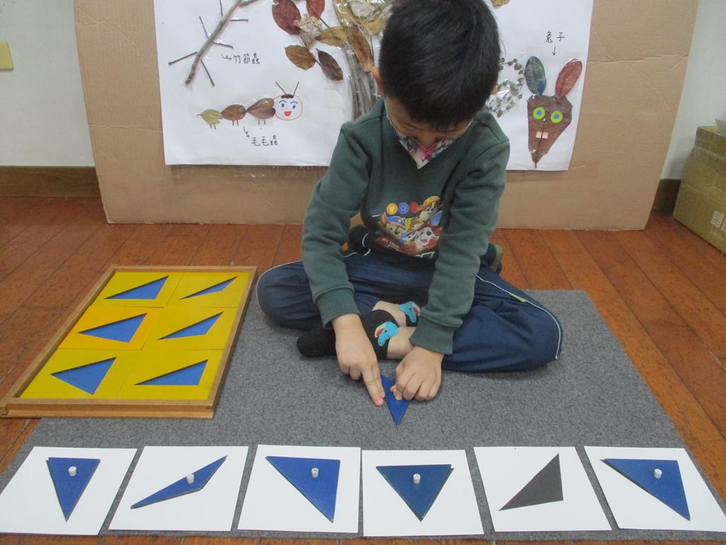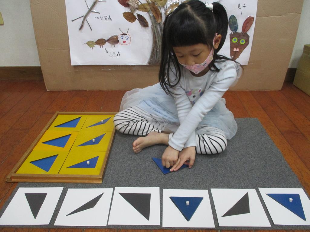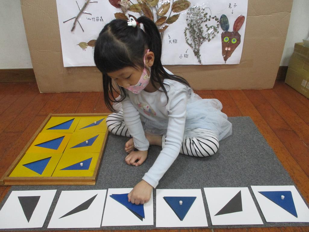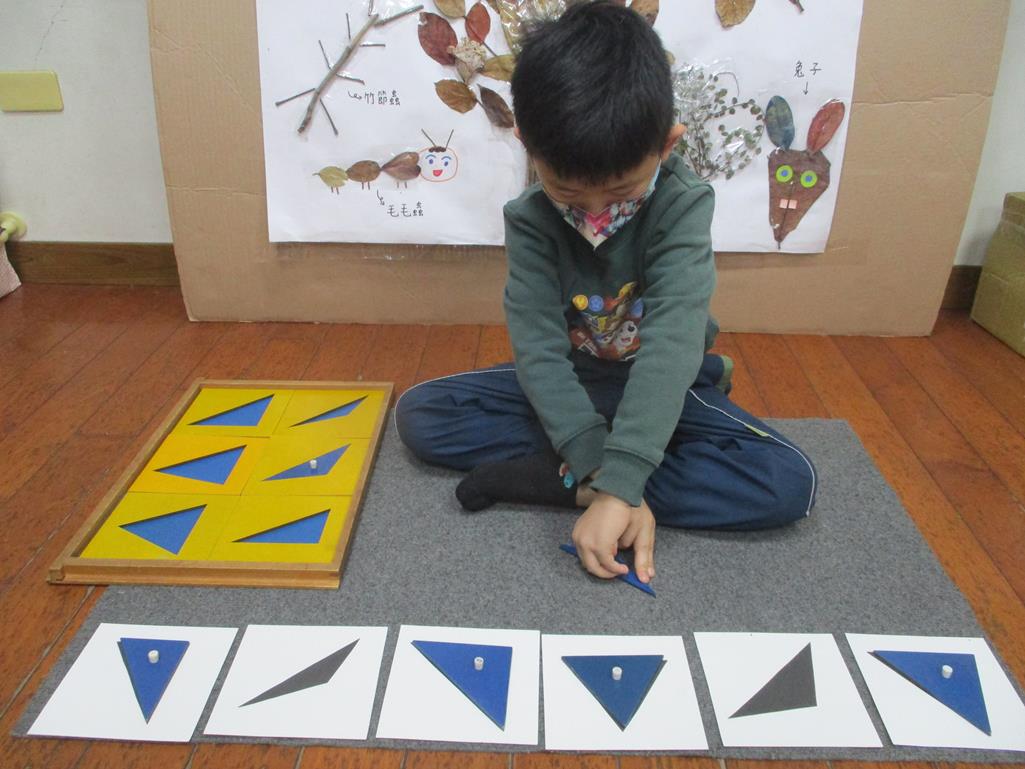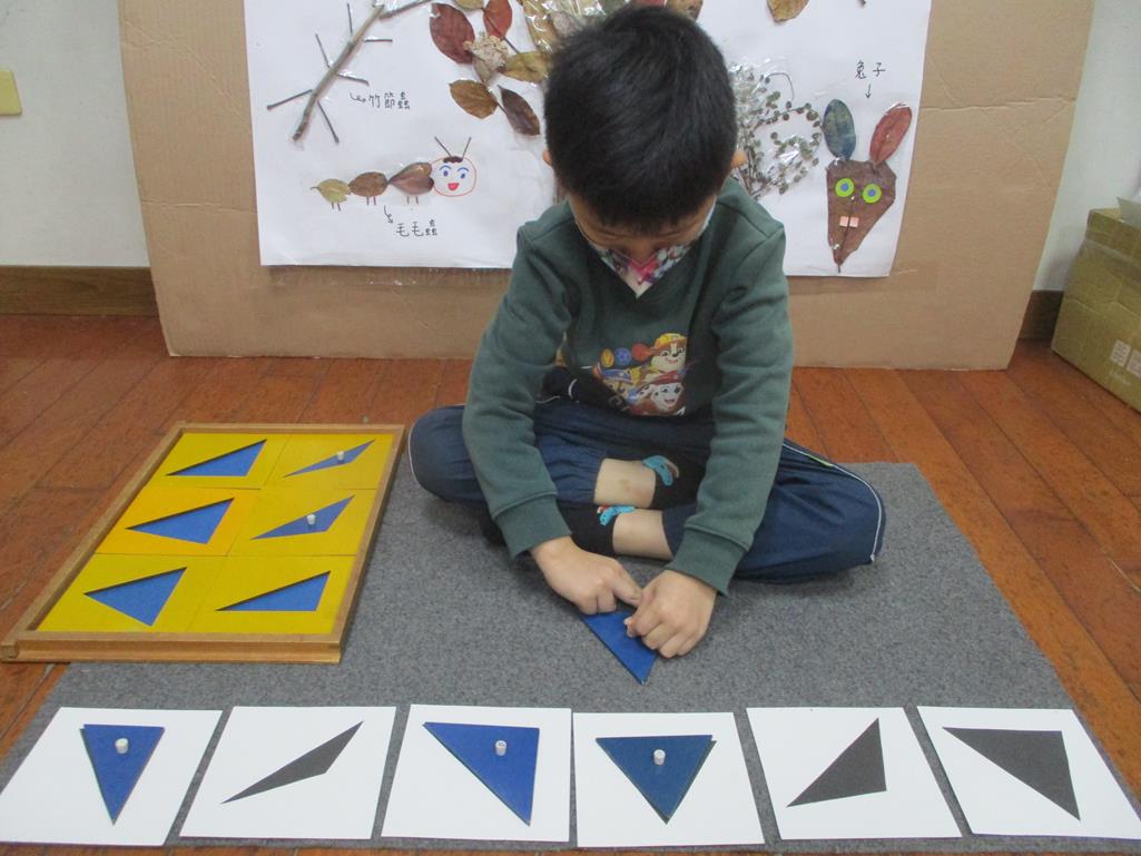 相簿名稱: 茉莉班-蒙特梭利教學(感官教育-幾何拼圖櫥(三角形)+實心卡)