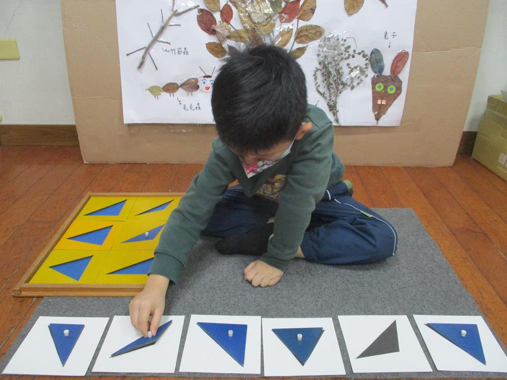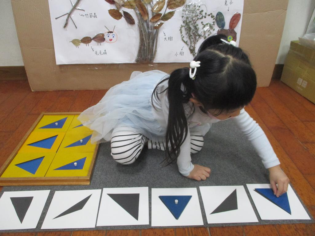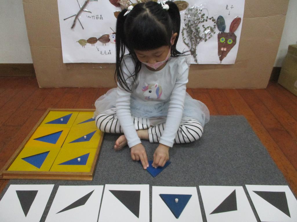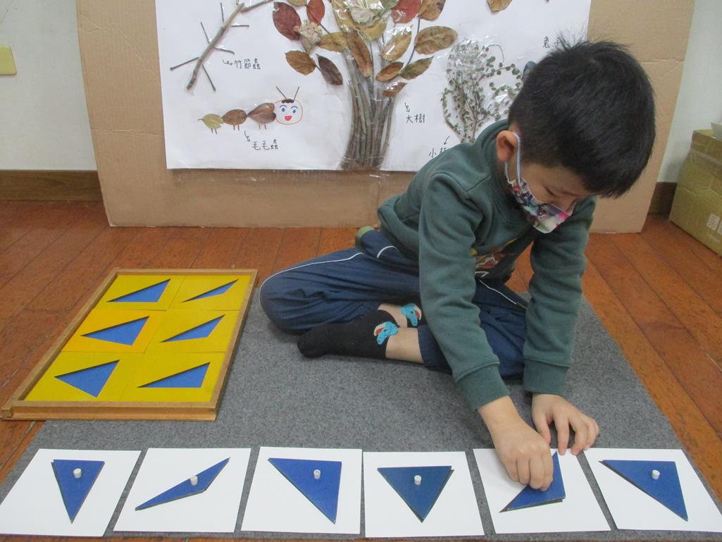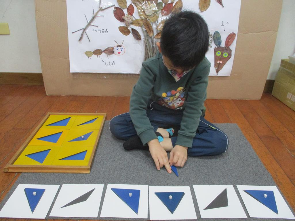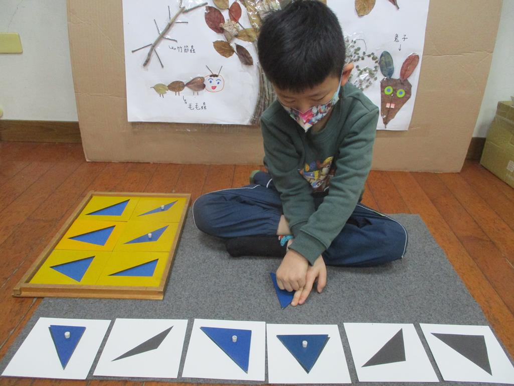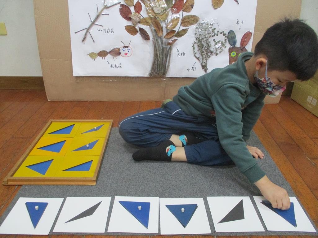 相簿名稱: 茉莉班-蒙特梭利教學(感官教育-幾何拼圖櫥(三角形)+實心卡)