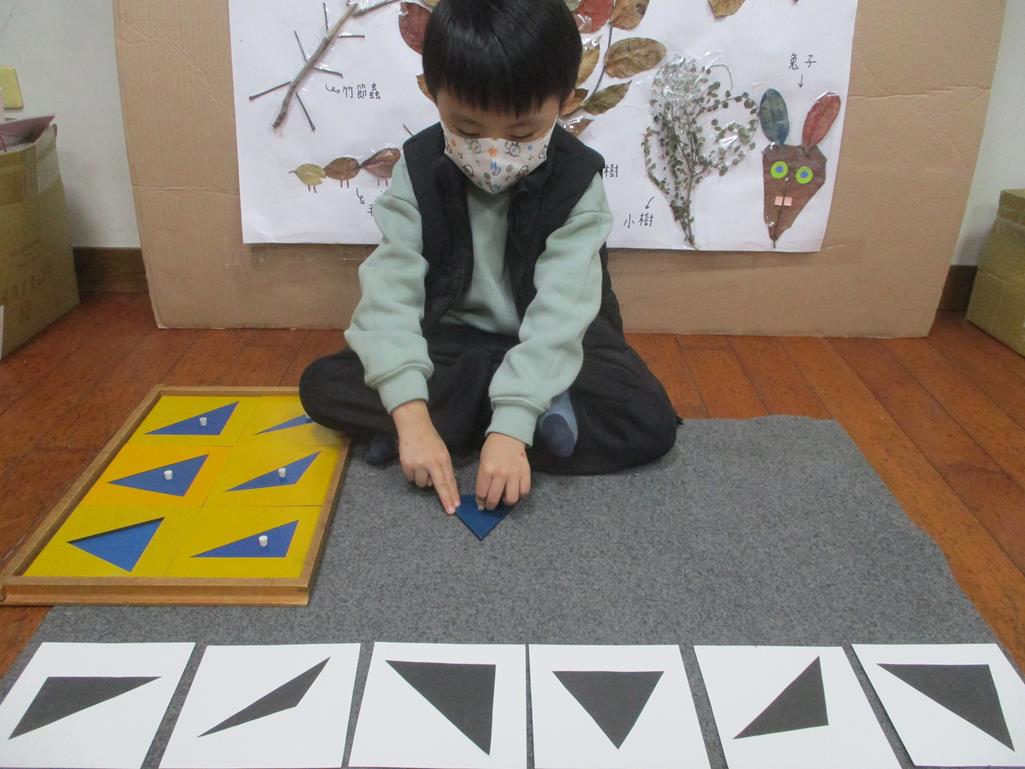 相簿名稱: 茉莉班-蒙特梭利教學(感官教育-幾何拼圖櫥(三角形)+實心卡)