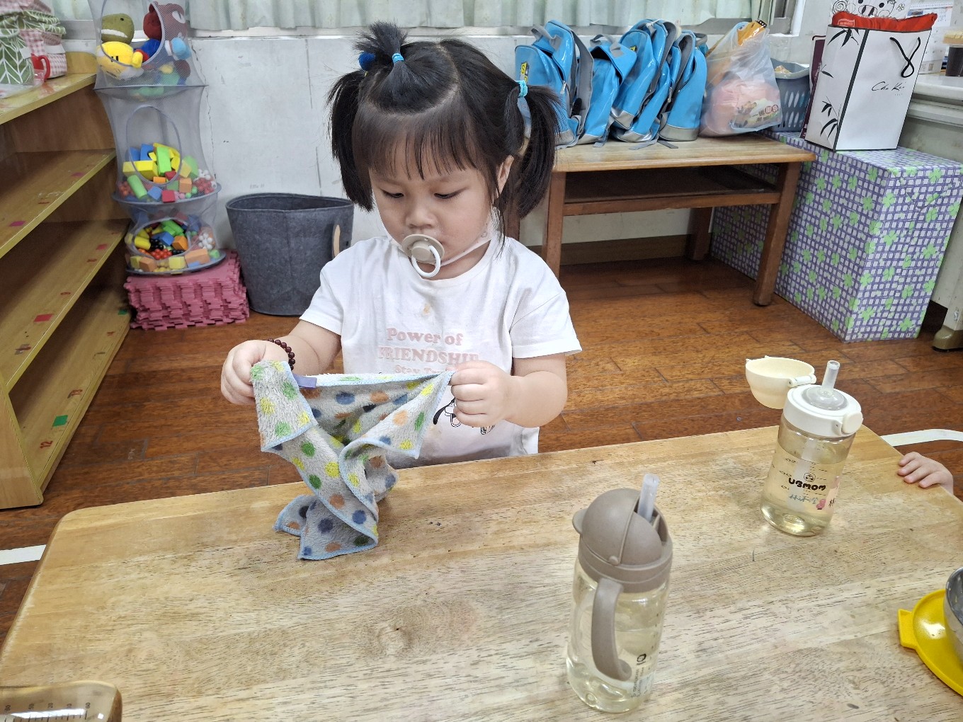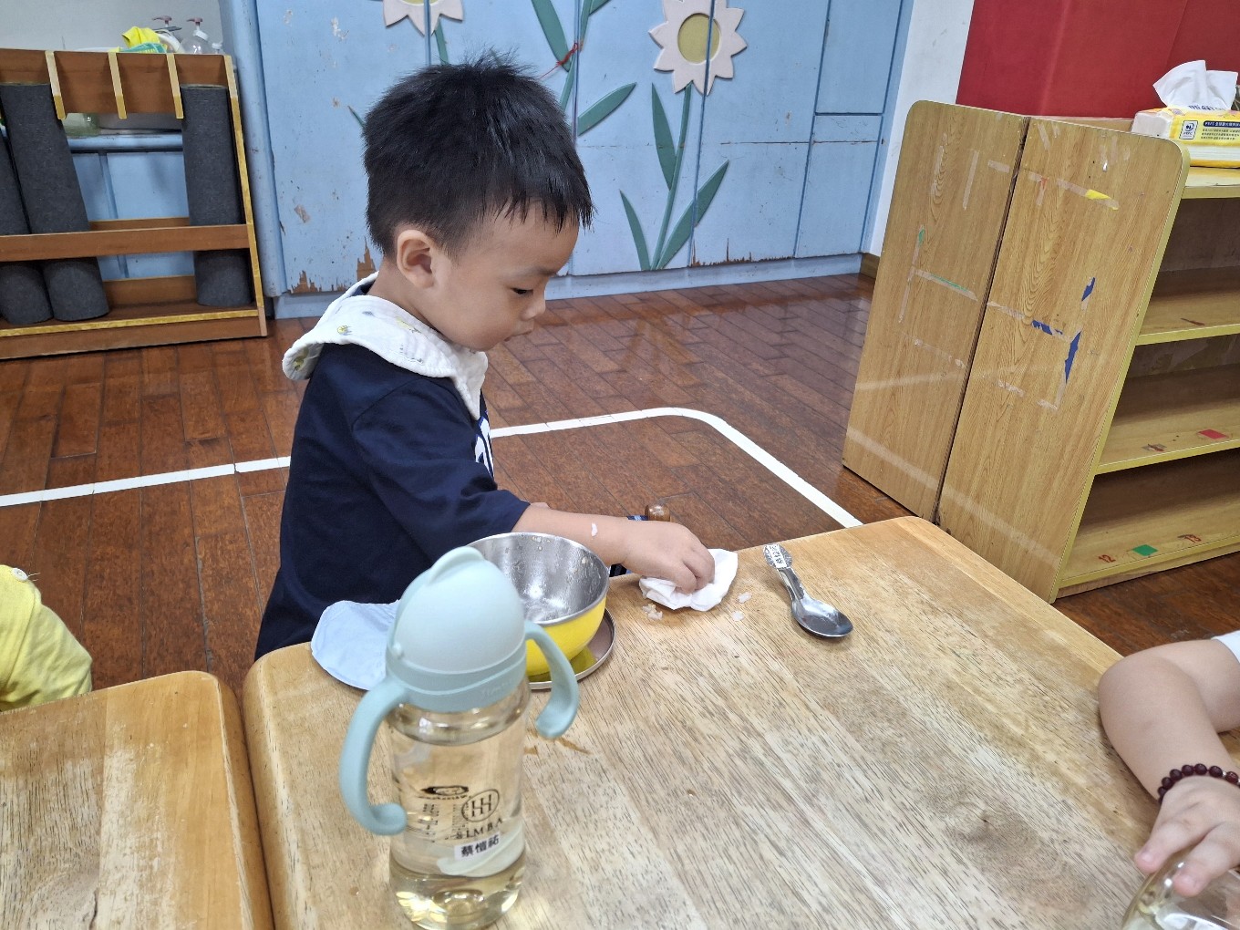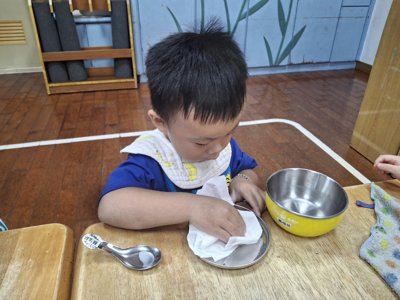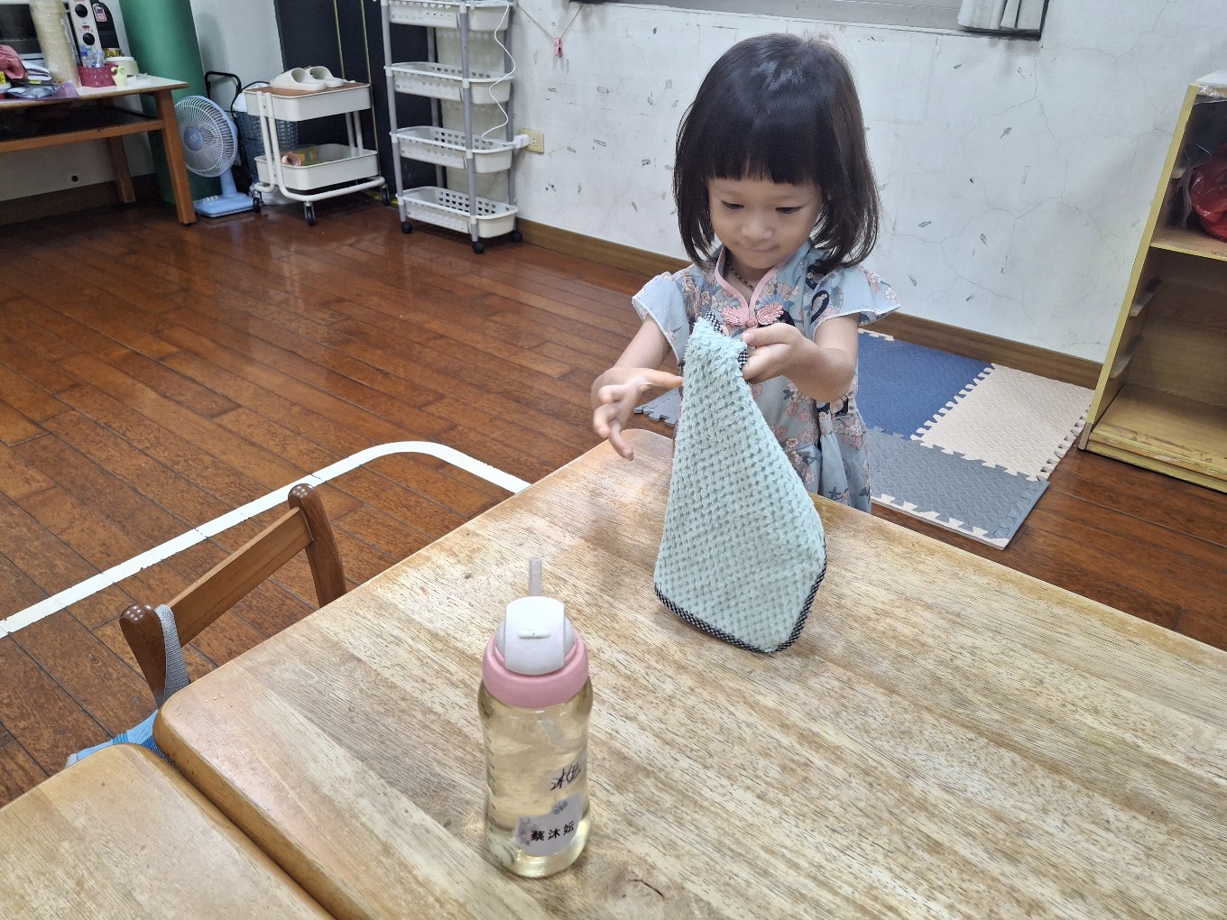 我們現在每天都有練習自己擦碗還有收碗喔!也會幫忙擦擦桌子喔!