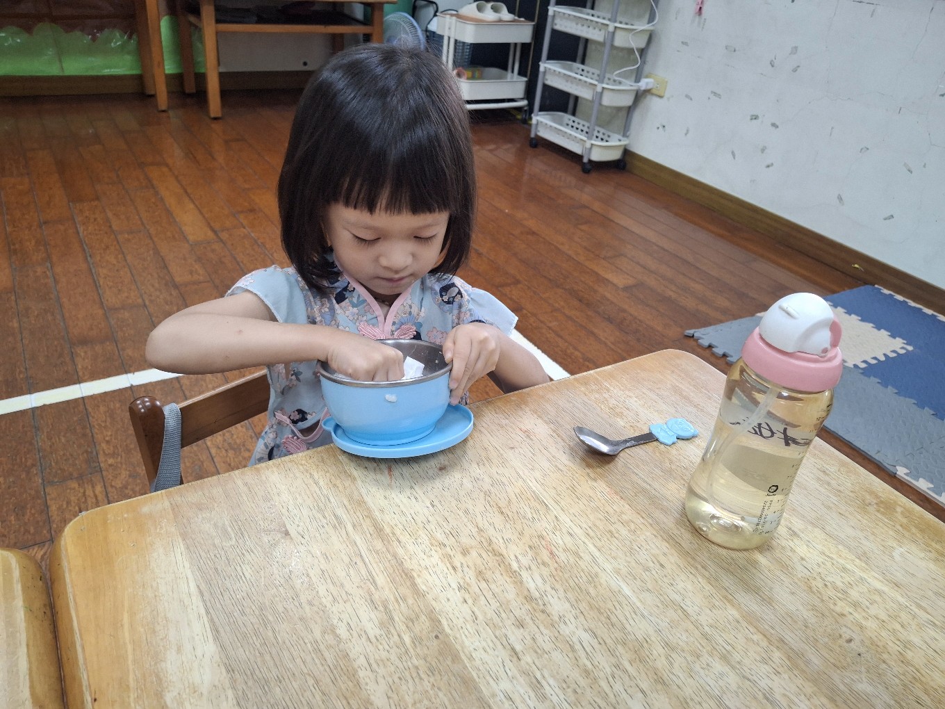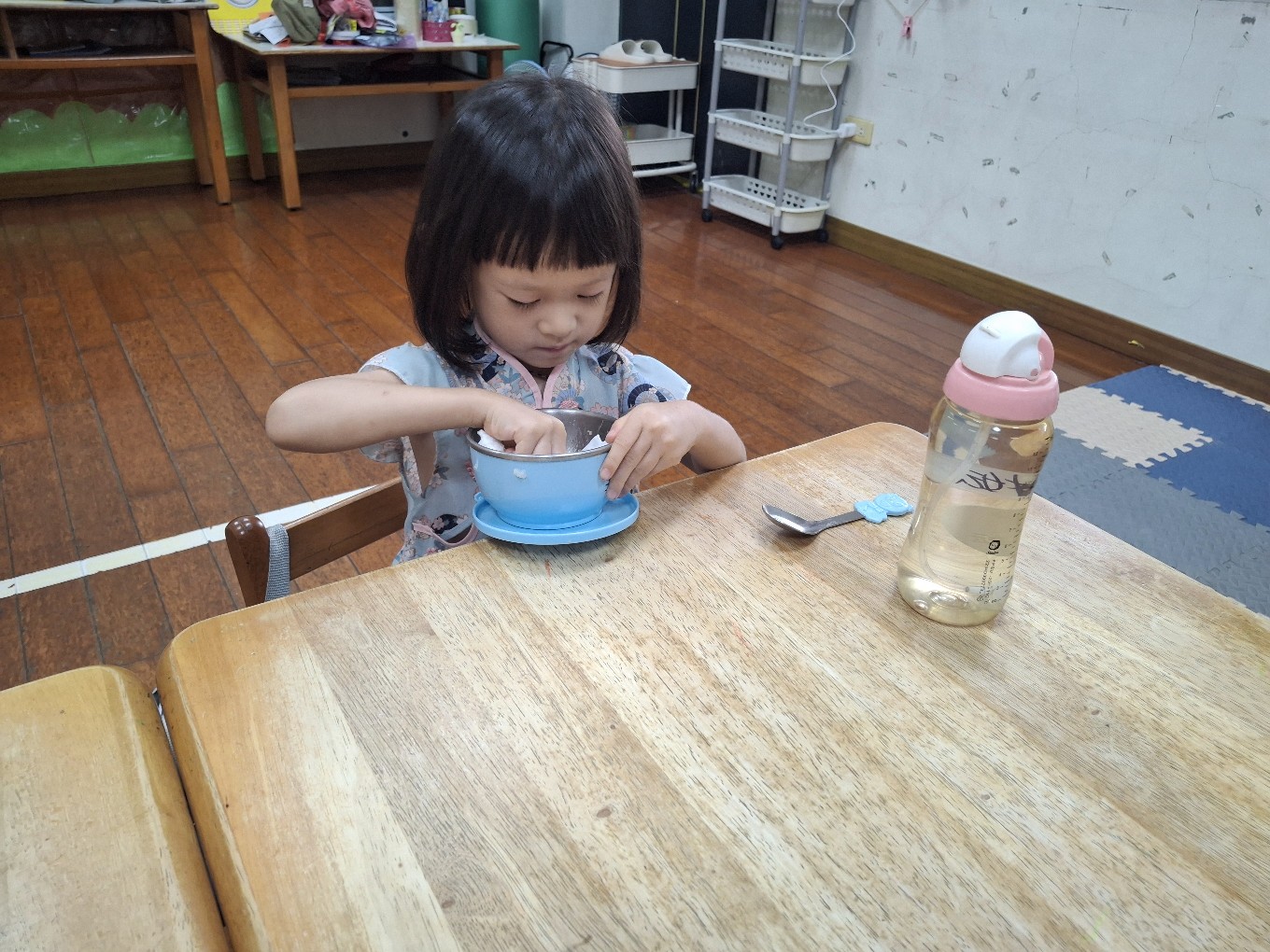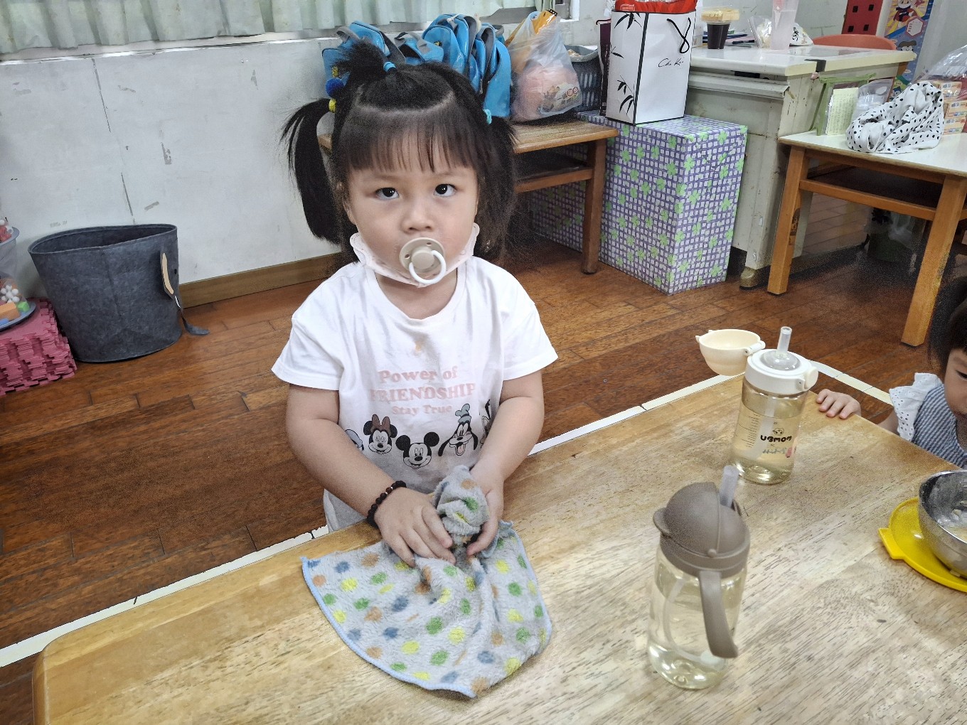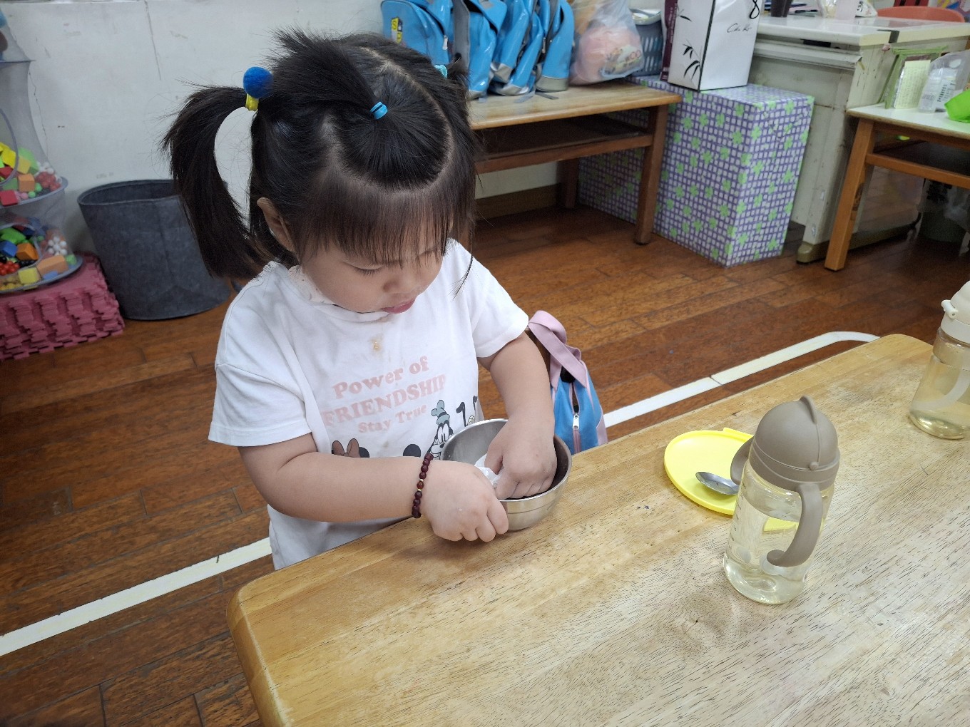 我們現在每天都有練習自己擦碗還有收碗喔!也會幫忙擦擦桌子喔!