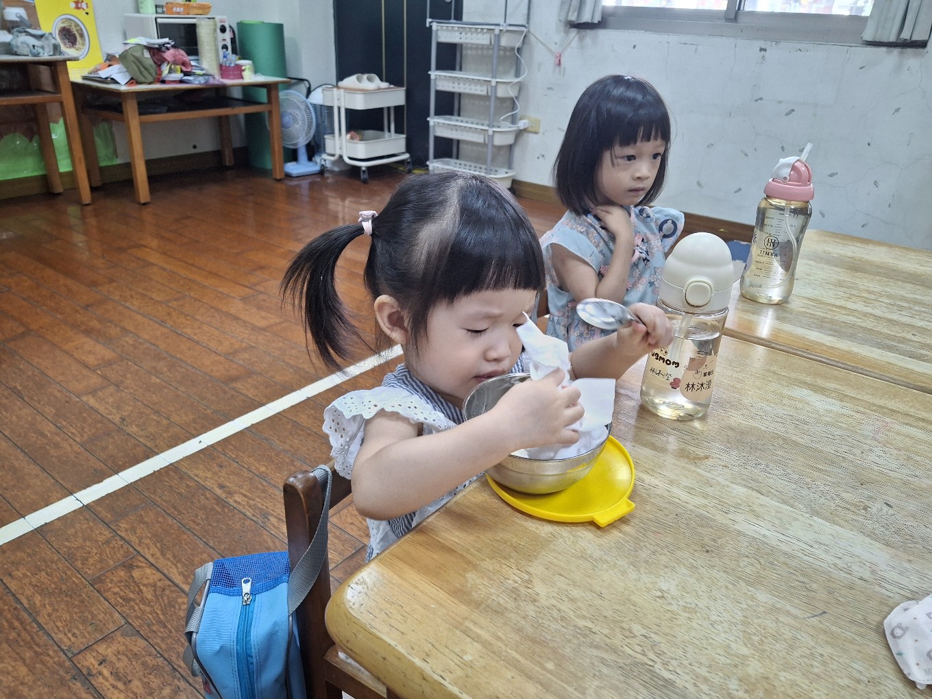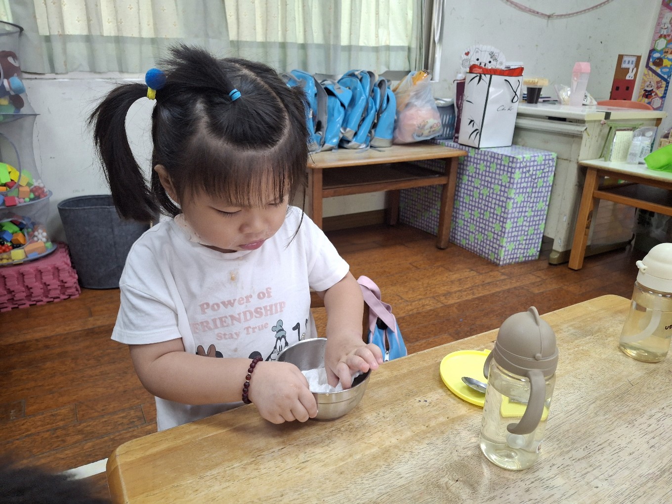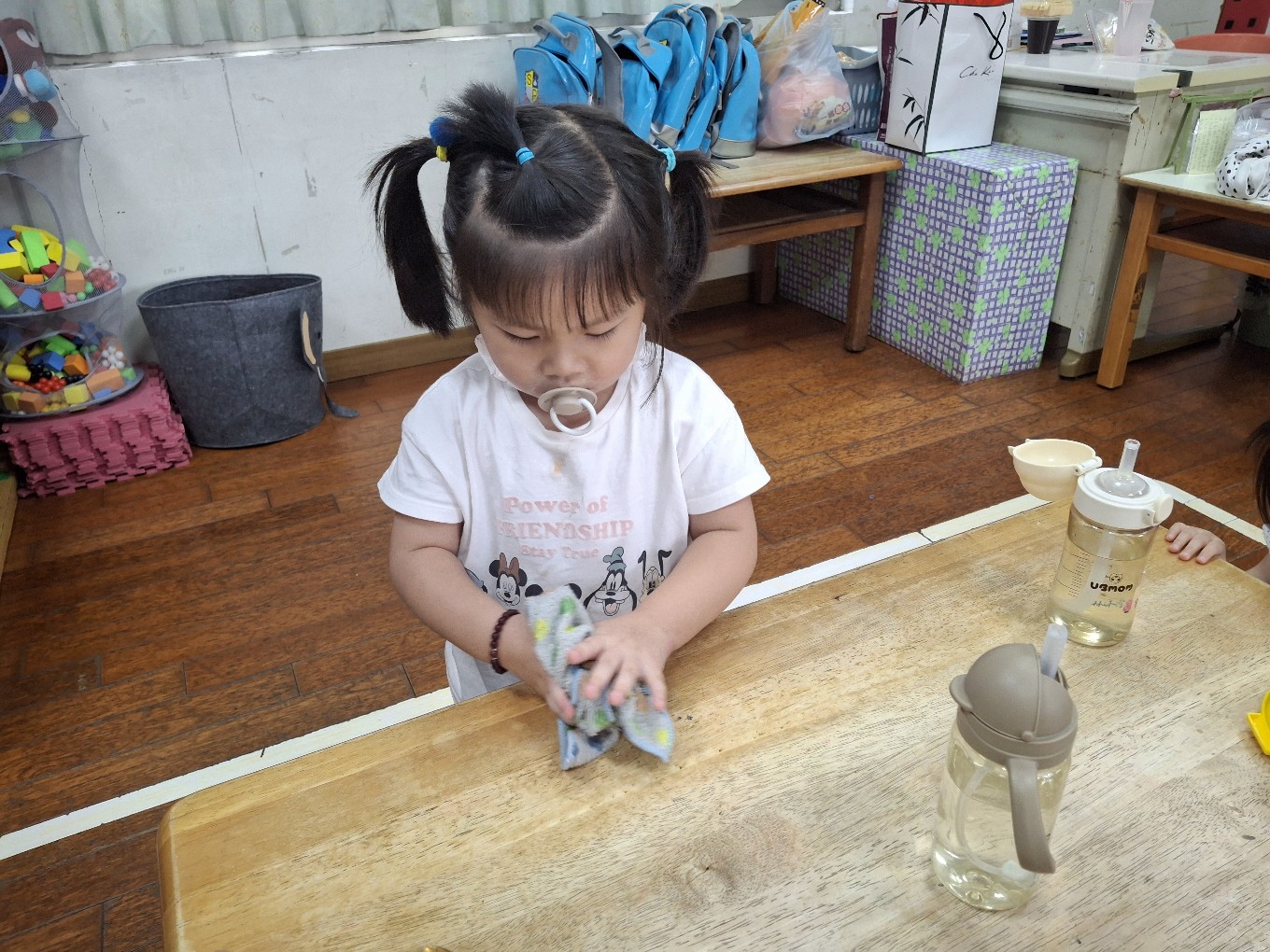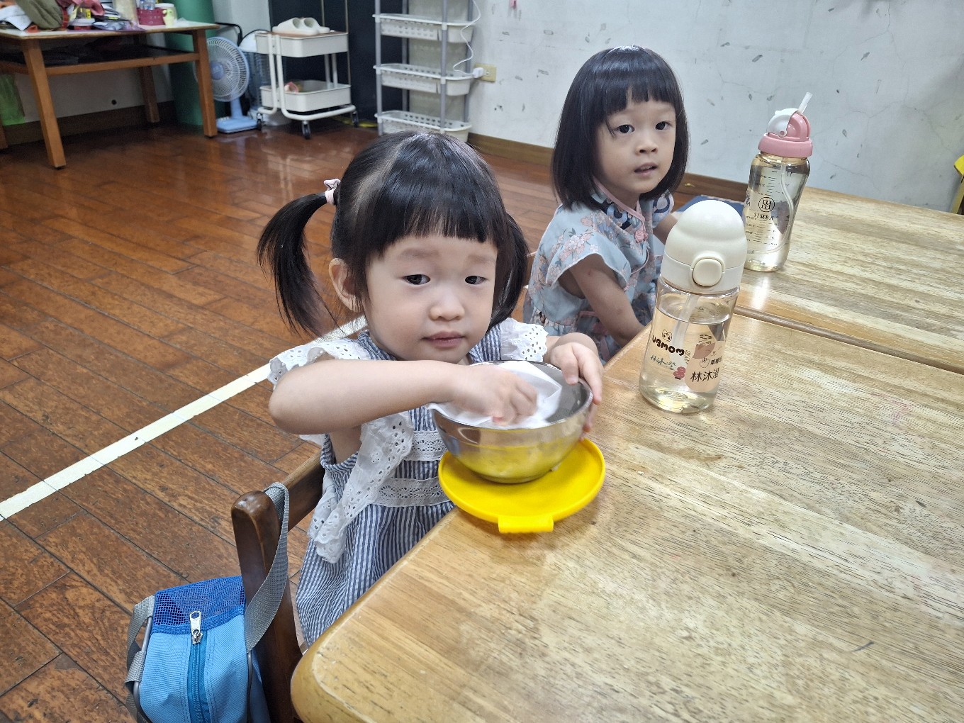我們現在每天都有練習自己擦碗還有收碗喔!也會幫忙擦擦桌子喔!