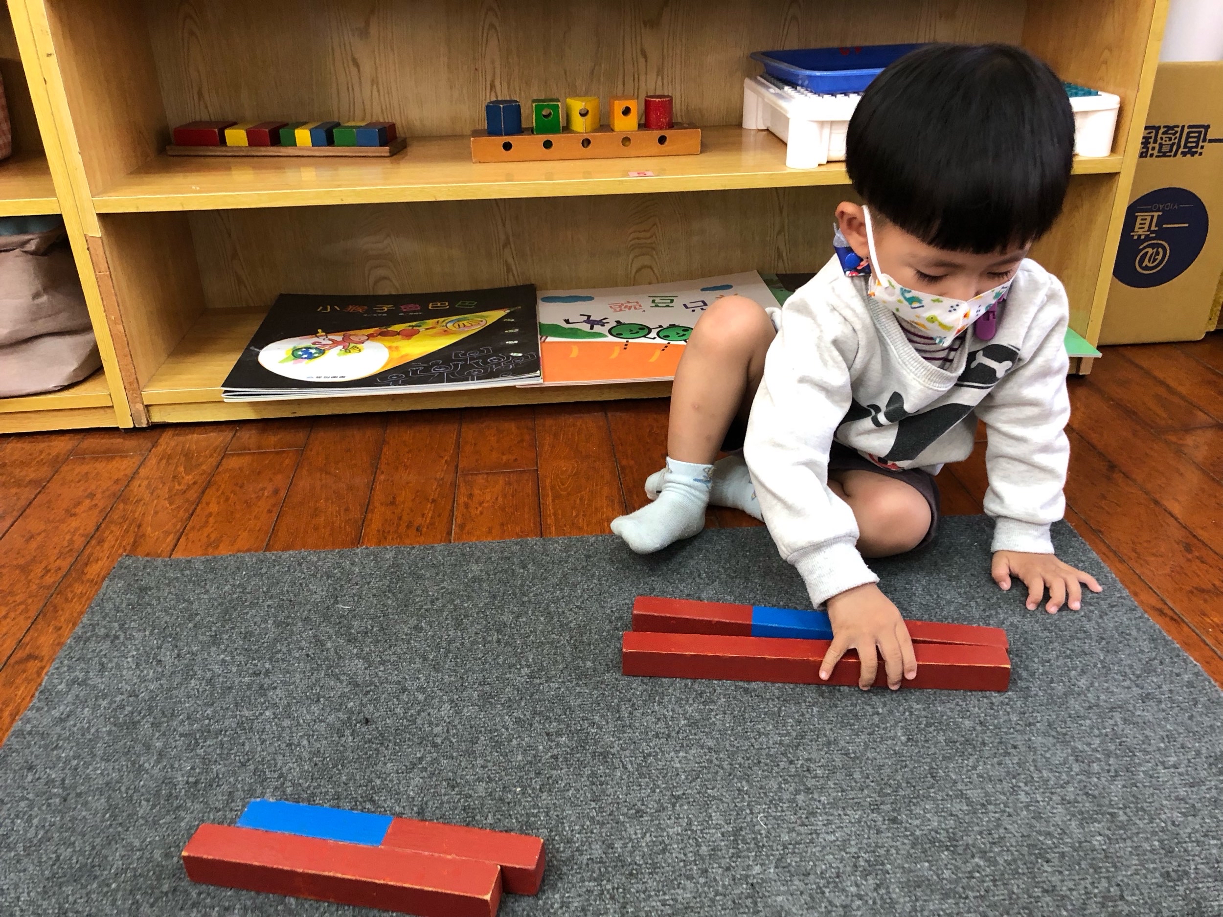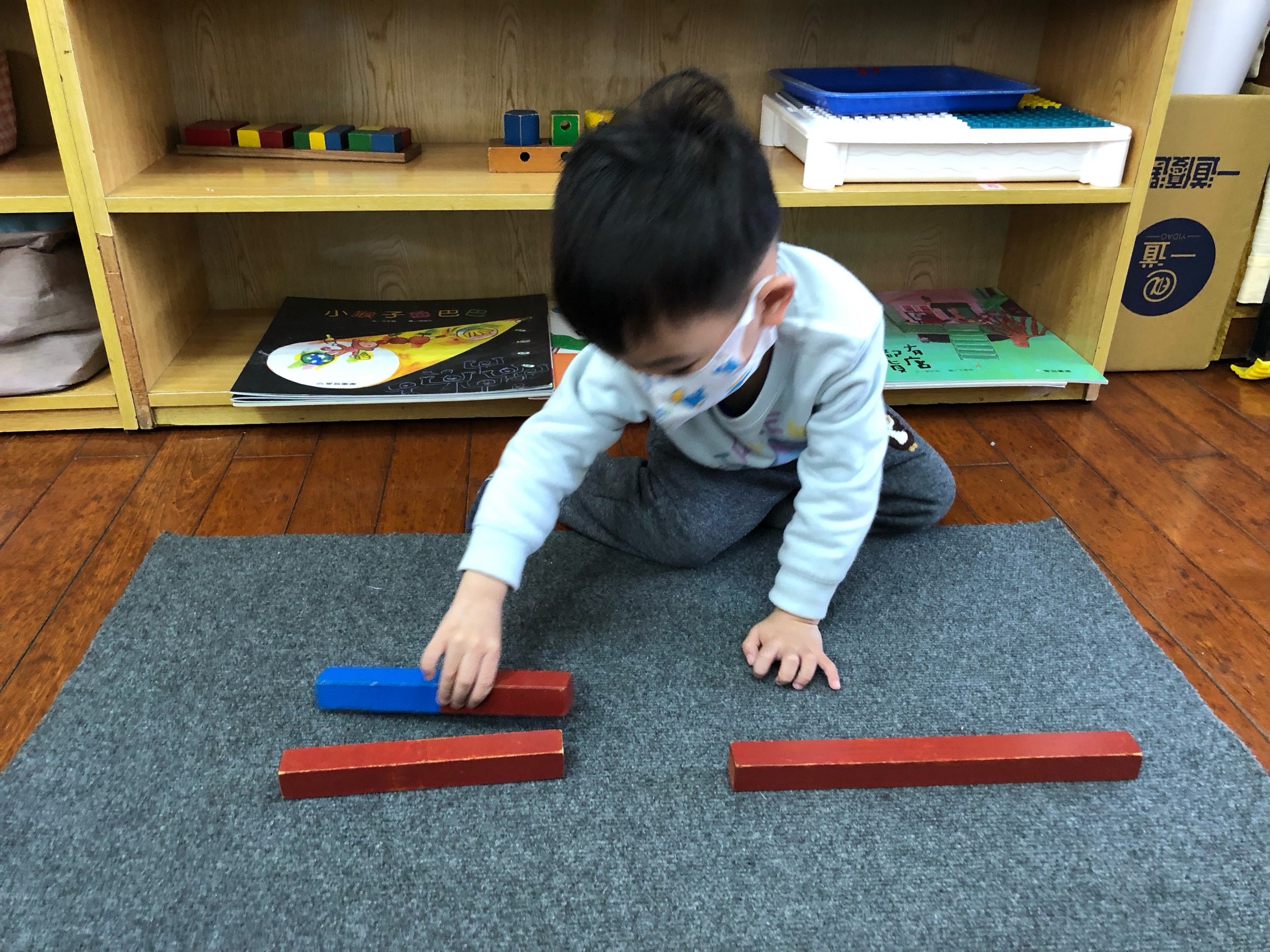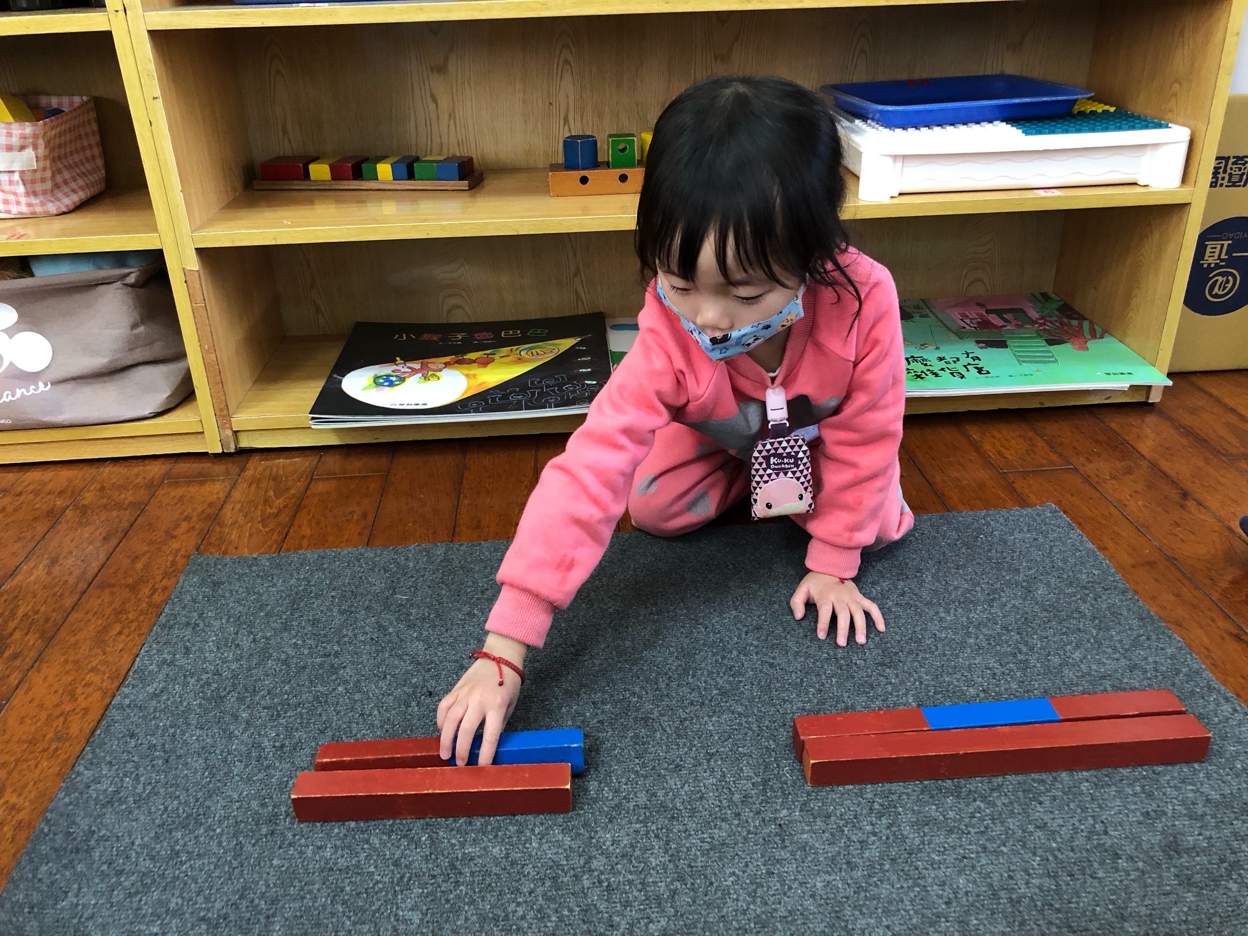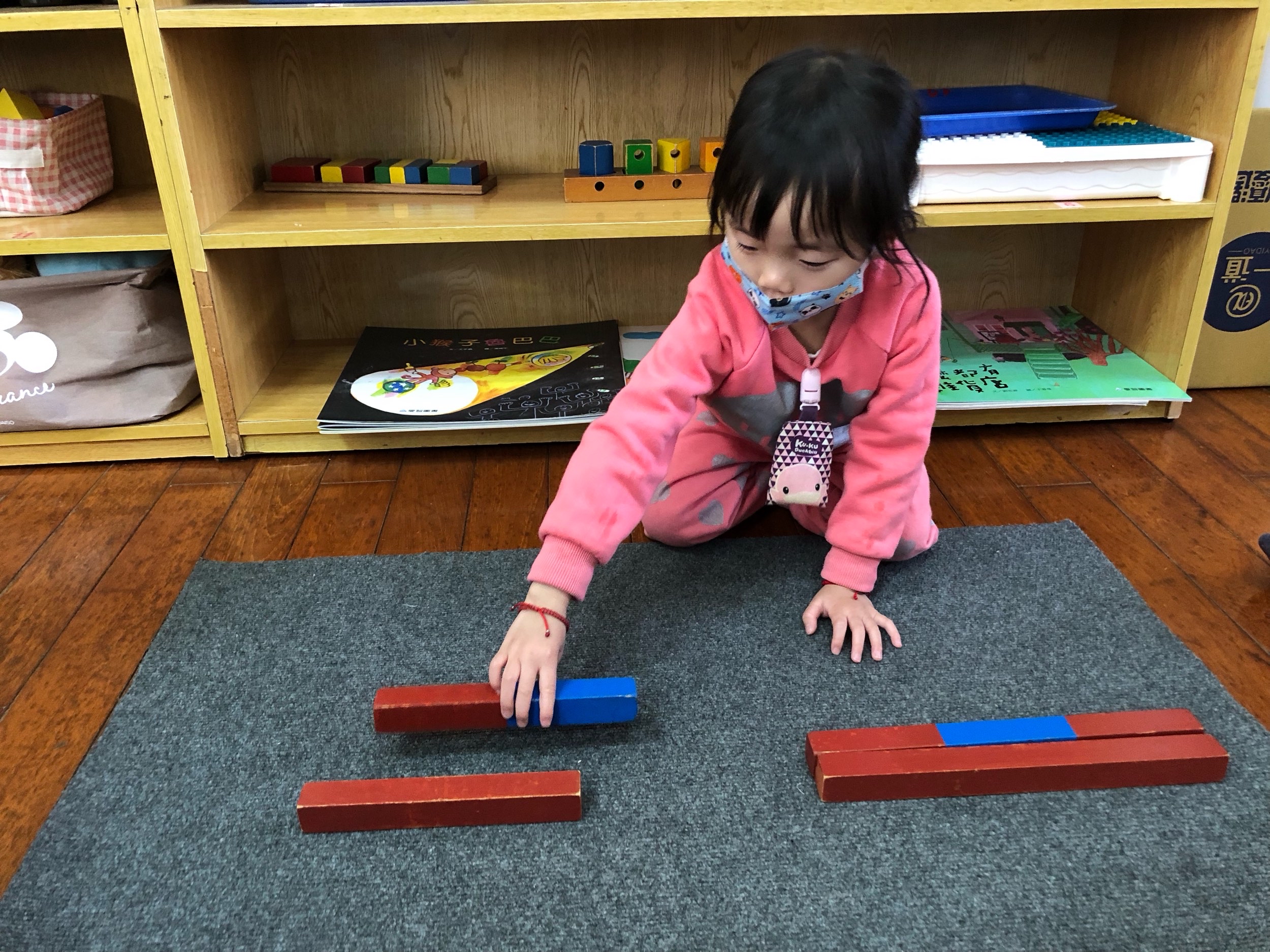 相簿名稱: 草莓班-蒙特梭利教學(數學教育-數棒+長棒「長短」配對)