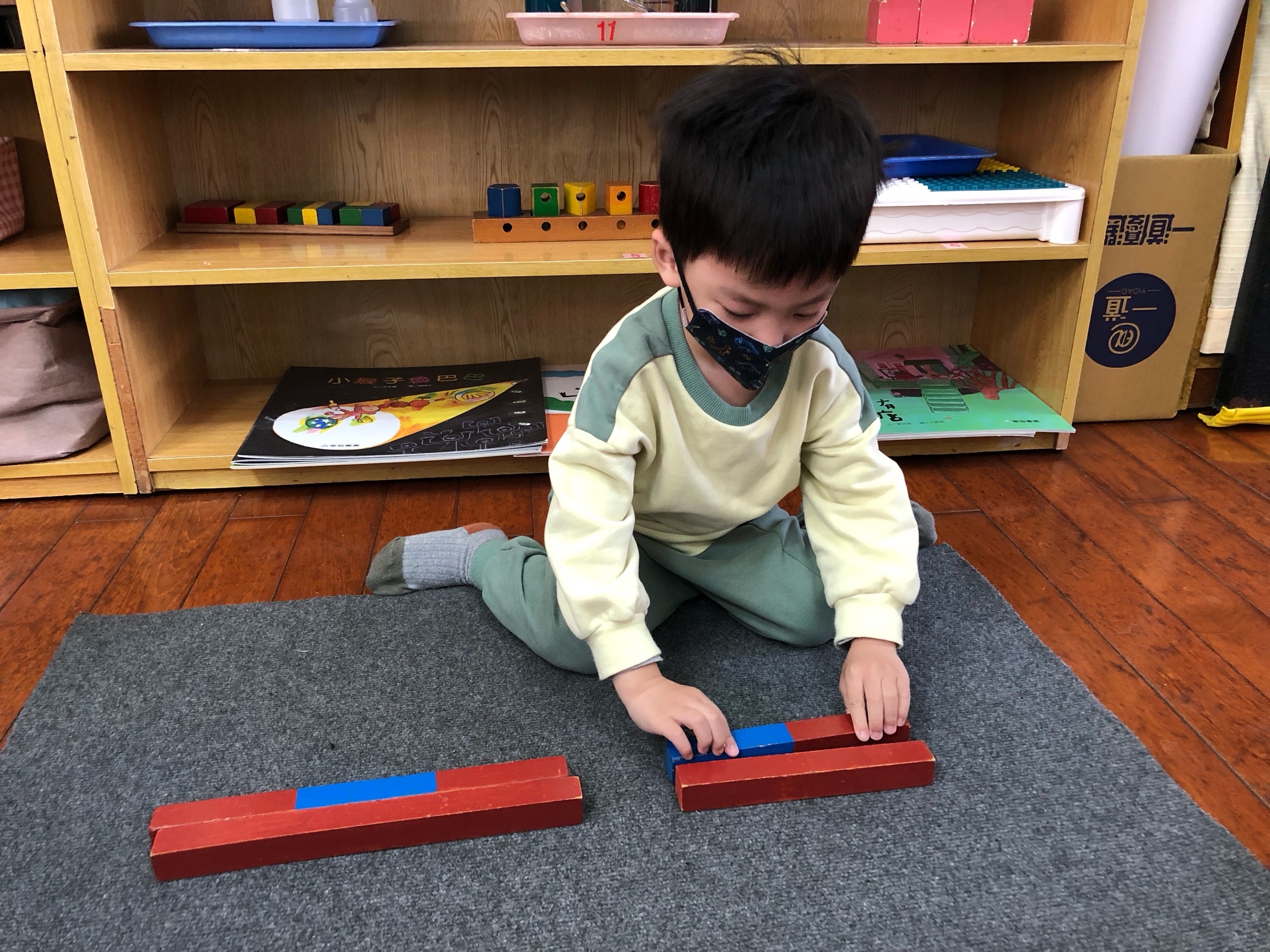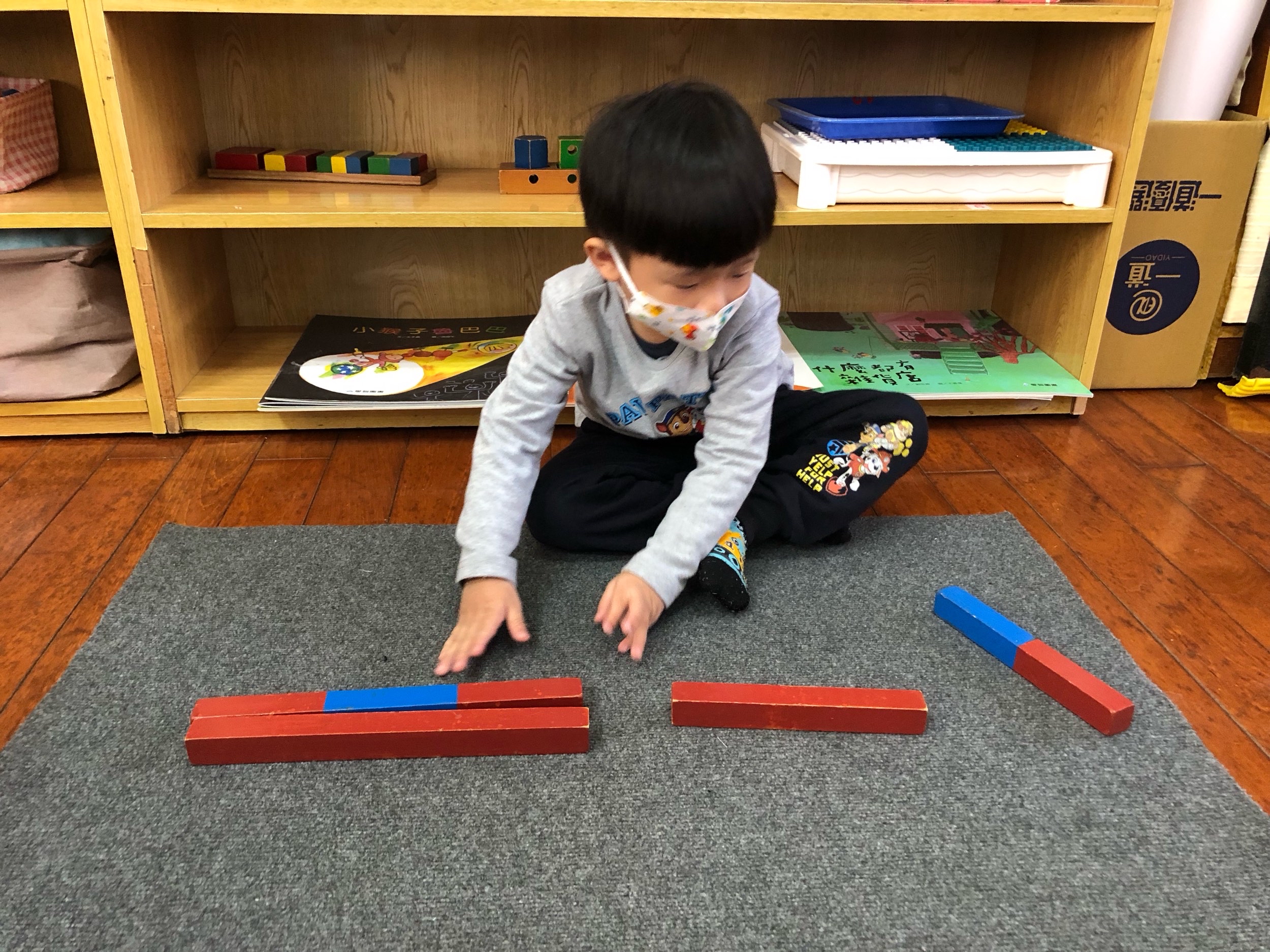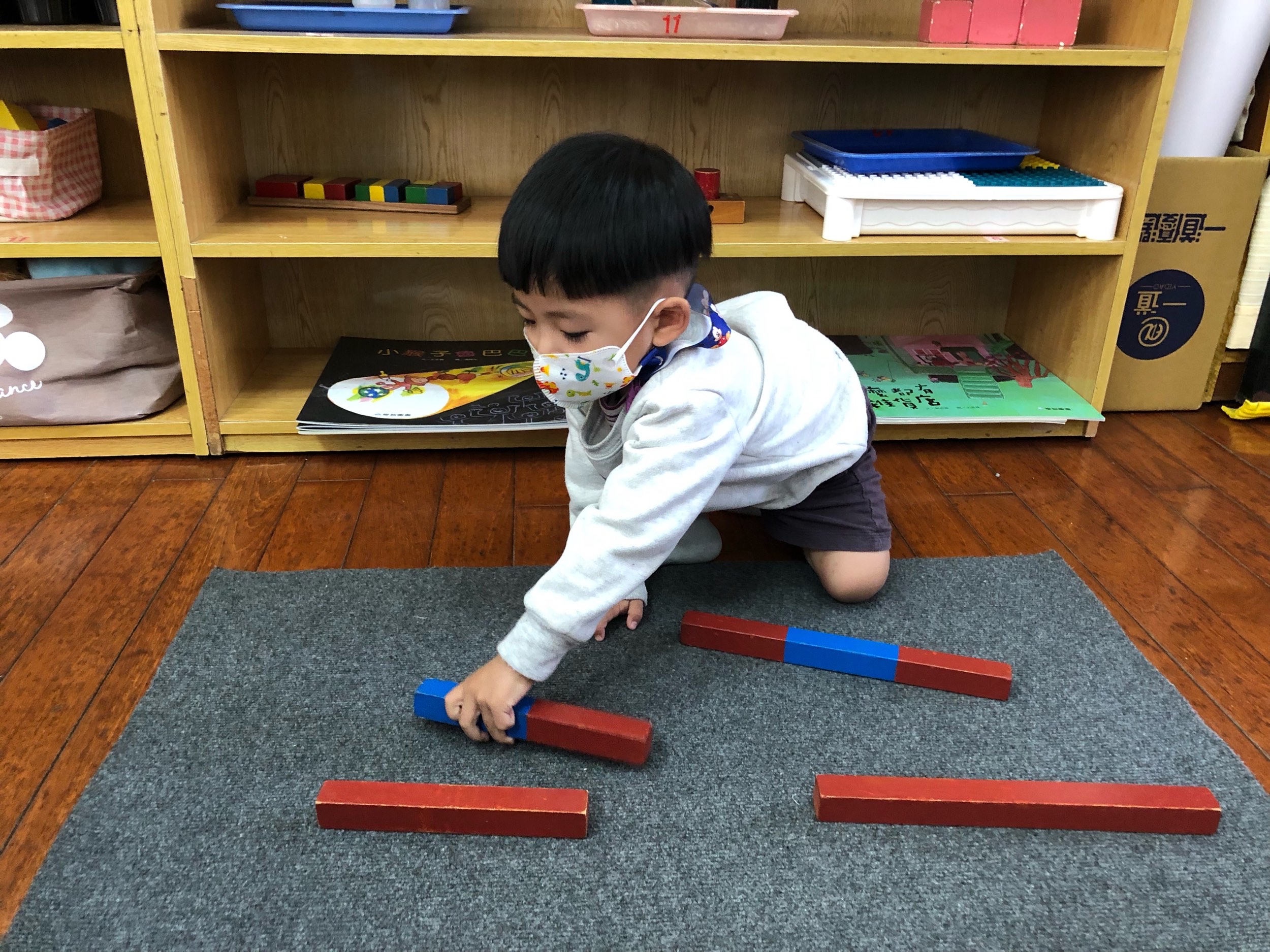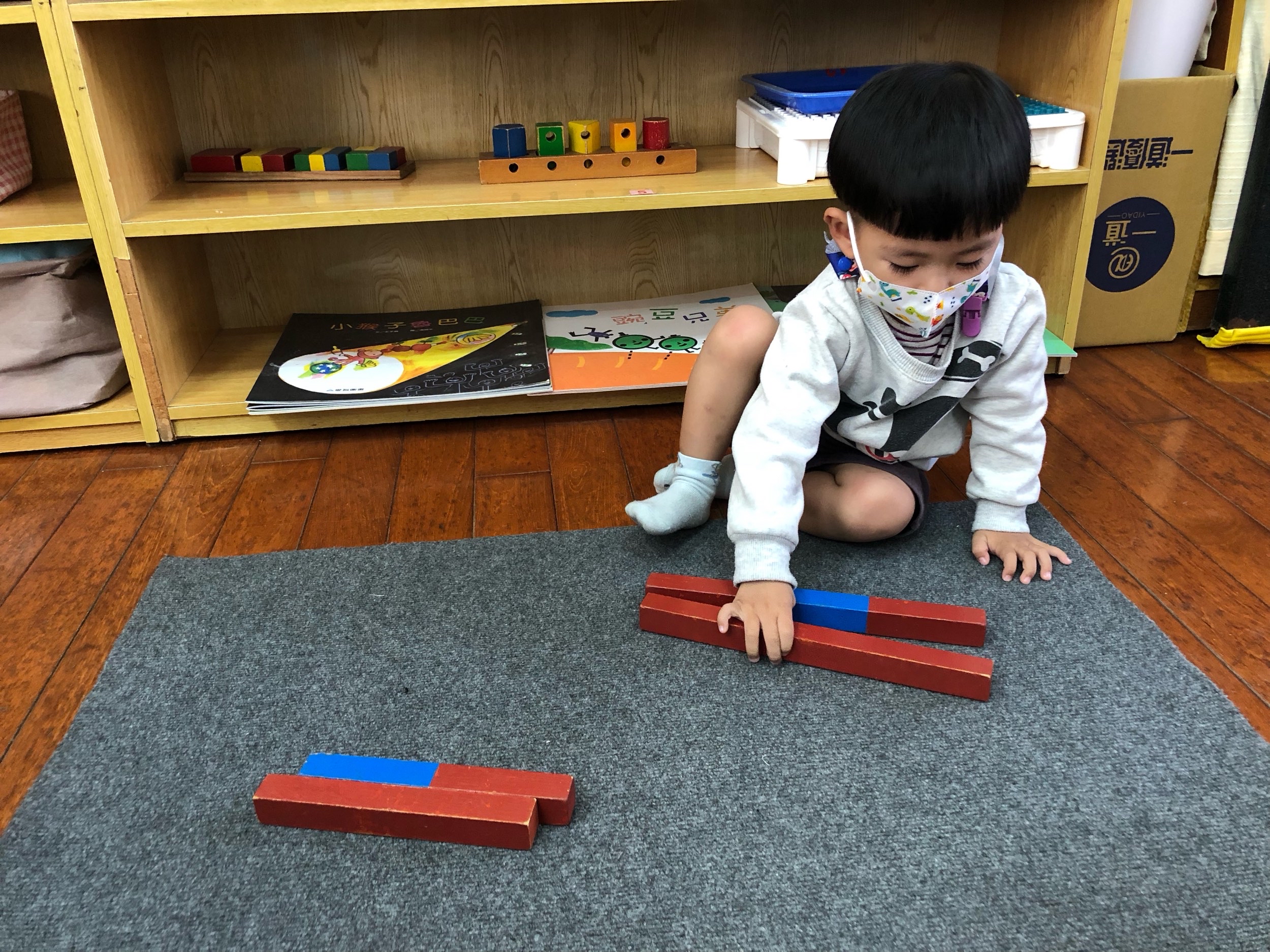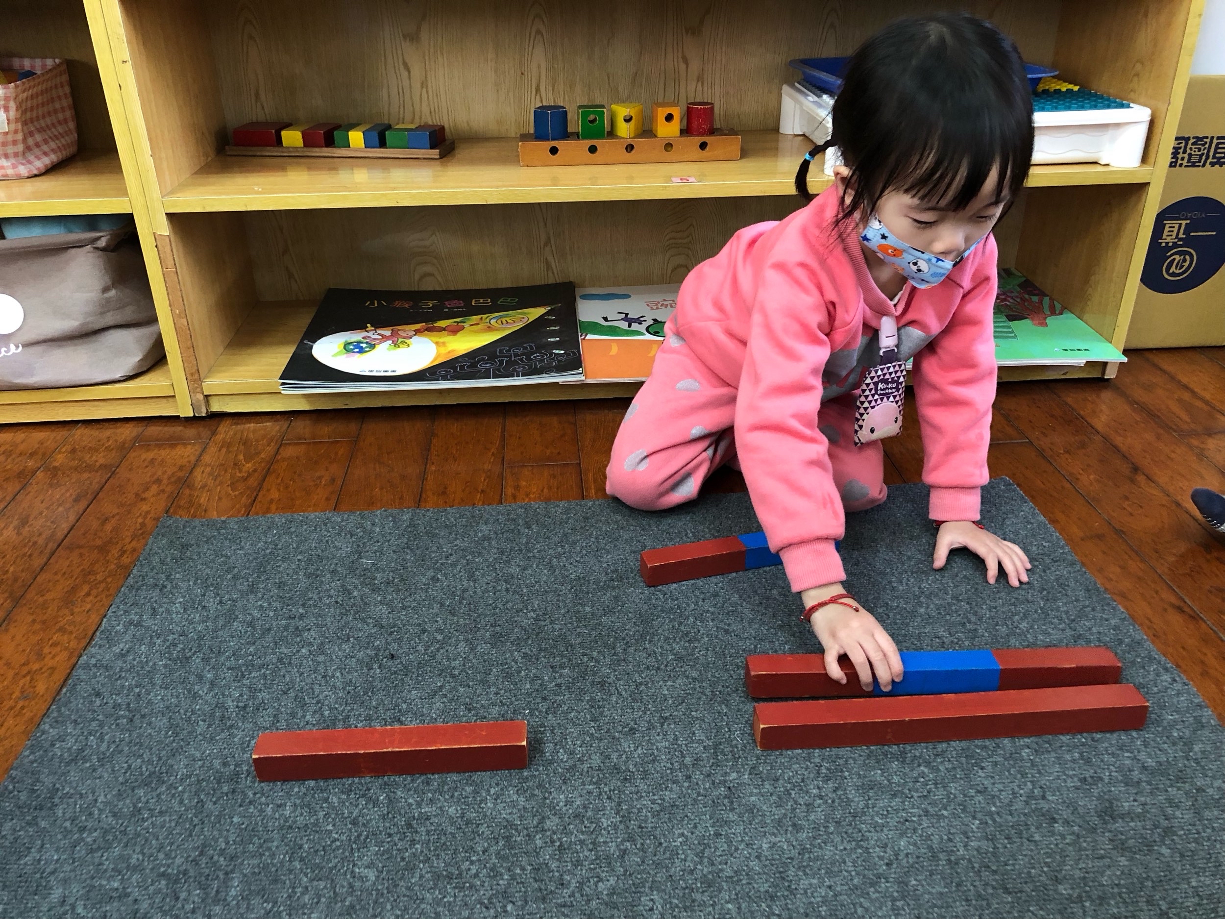 相簿名稱: 草莓班-蒙特梭利教學(數學教育-數棒+長棒「長短」配對)