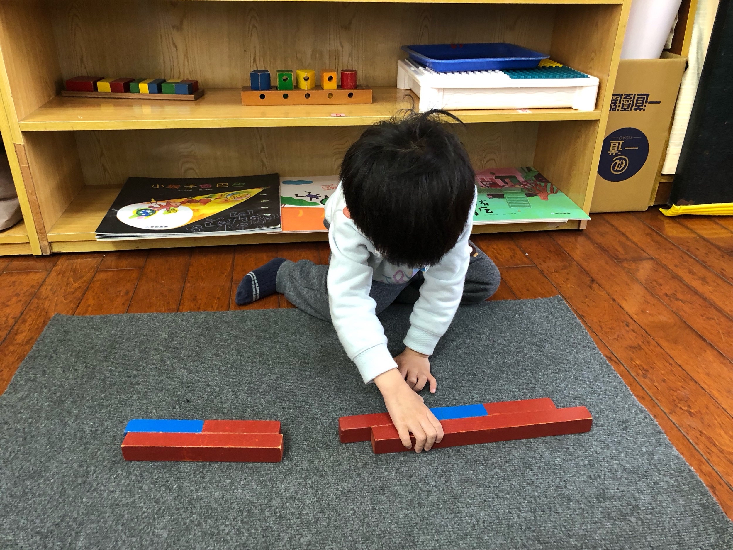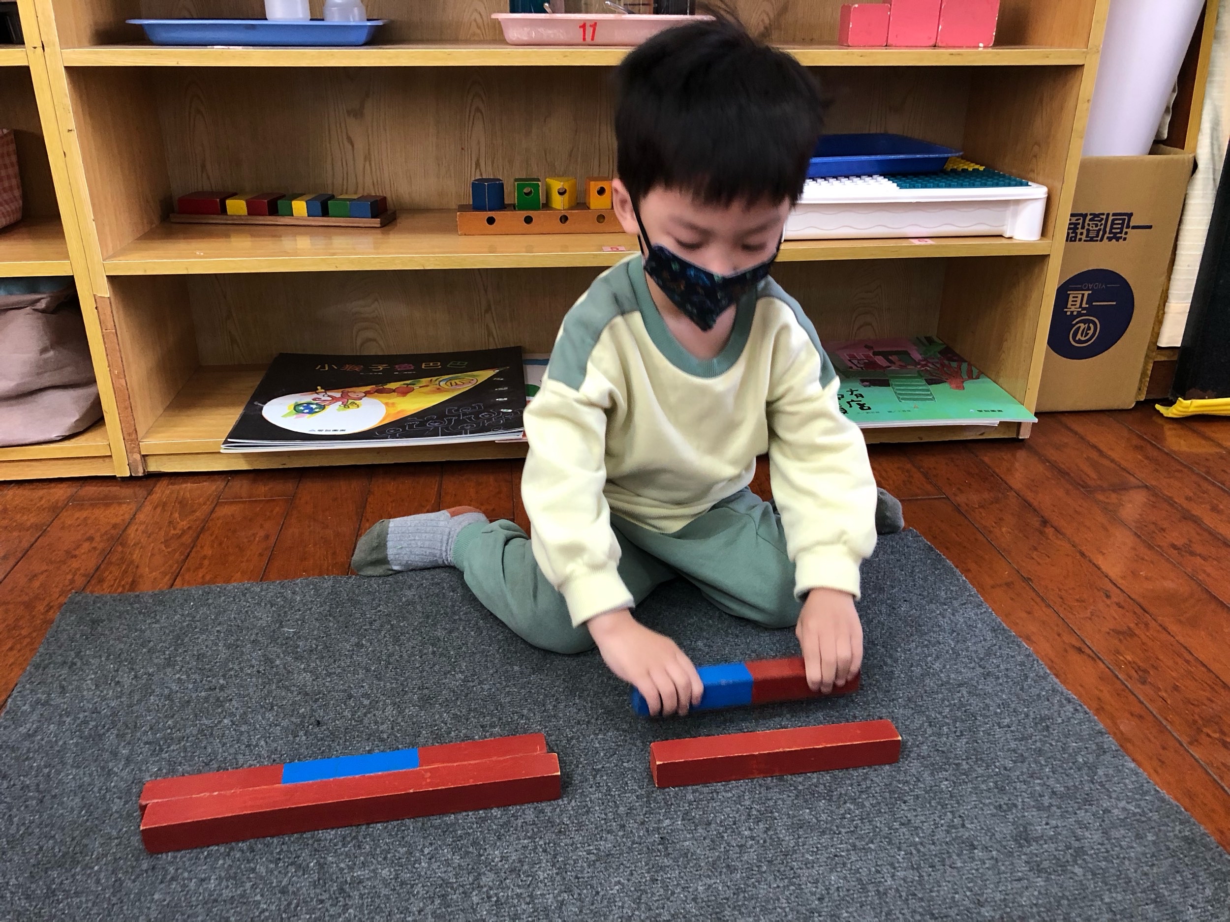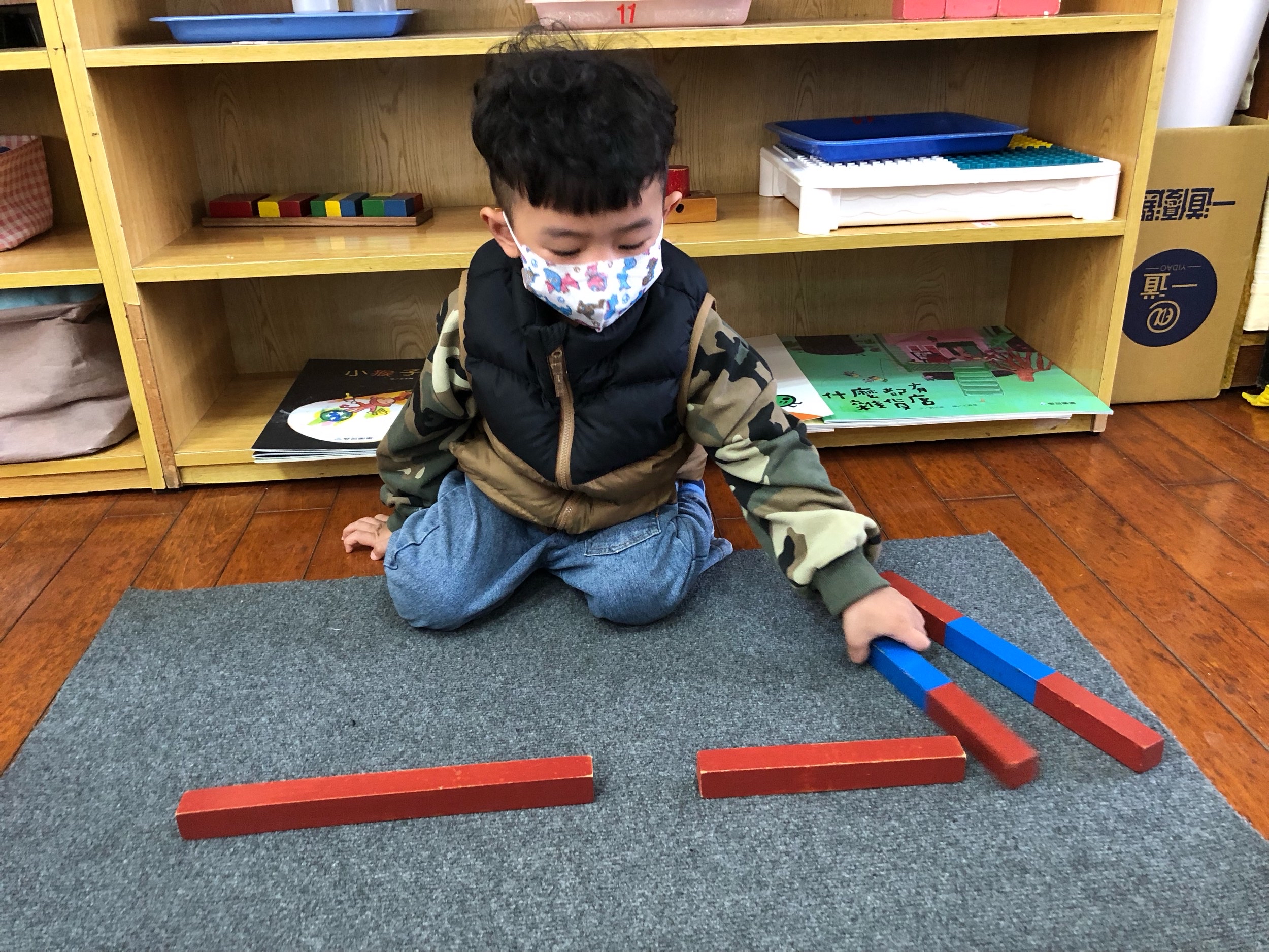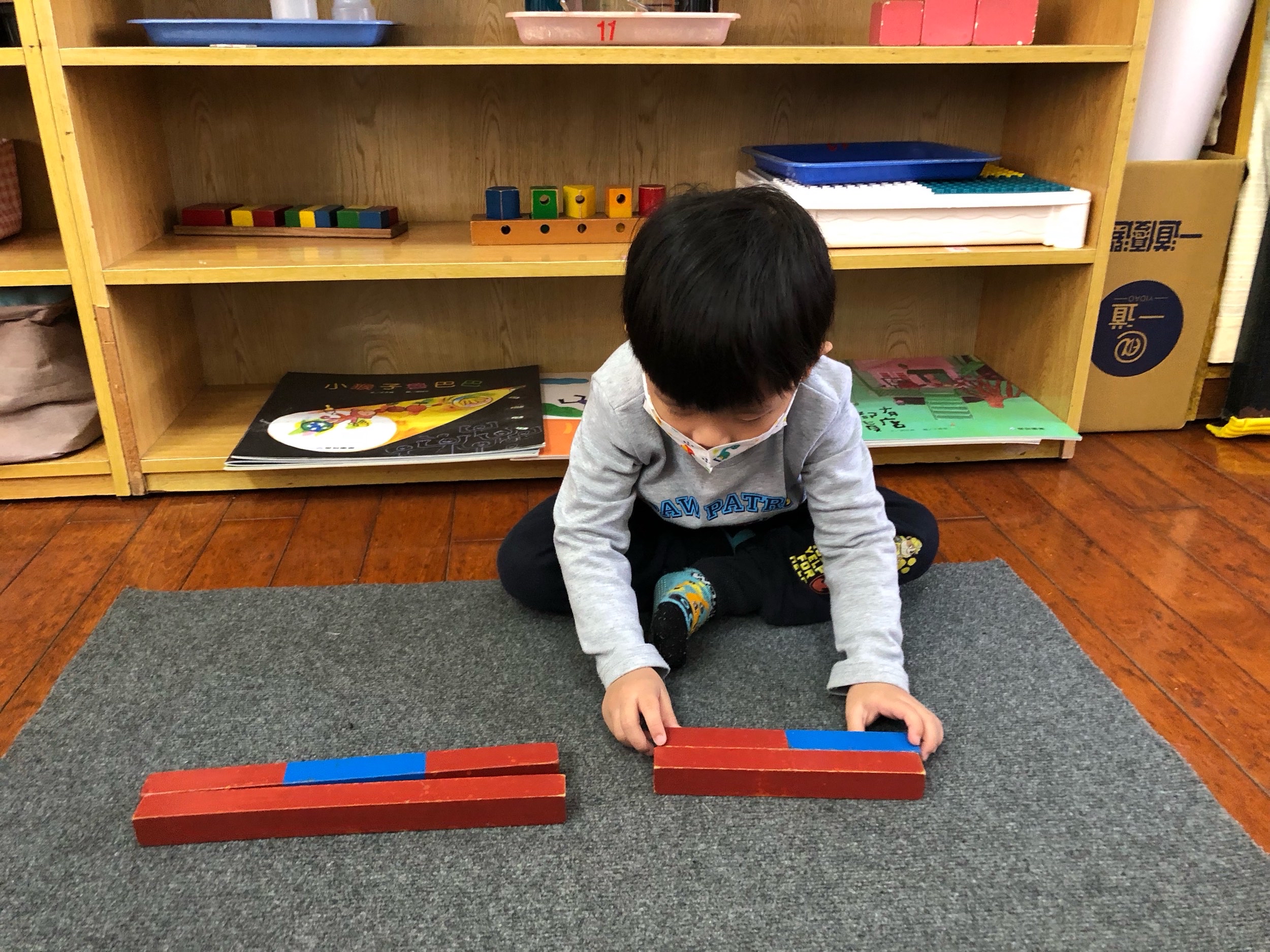 相簿名稱: 草莓班-蒙特梭利教學(數學教育-數棒+長棒「長短」配對)
