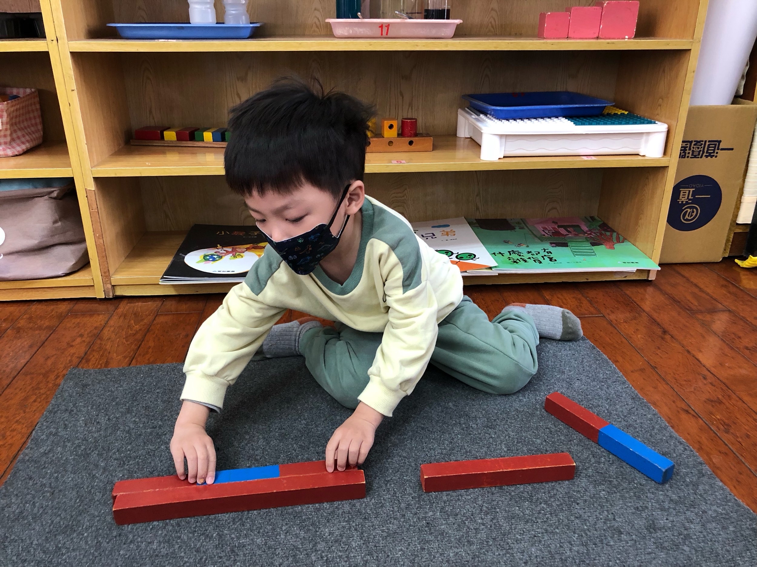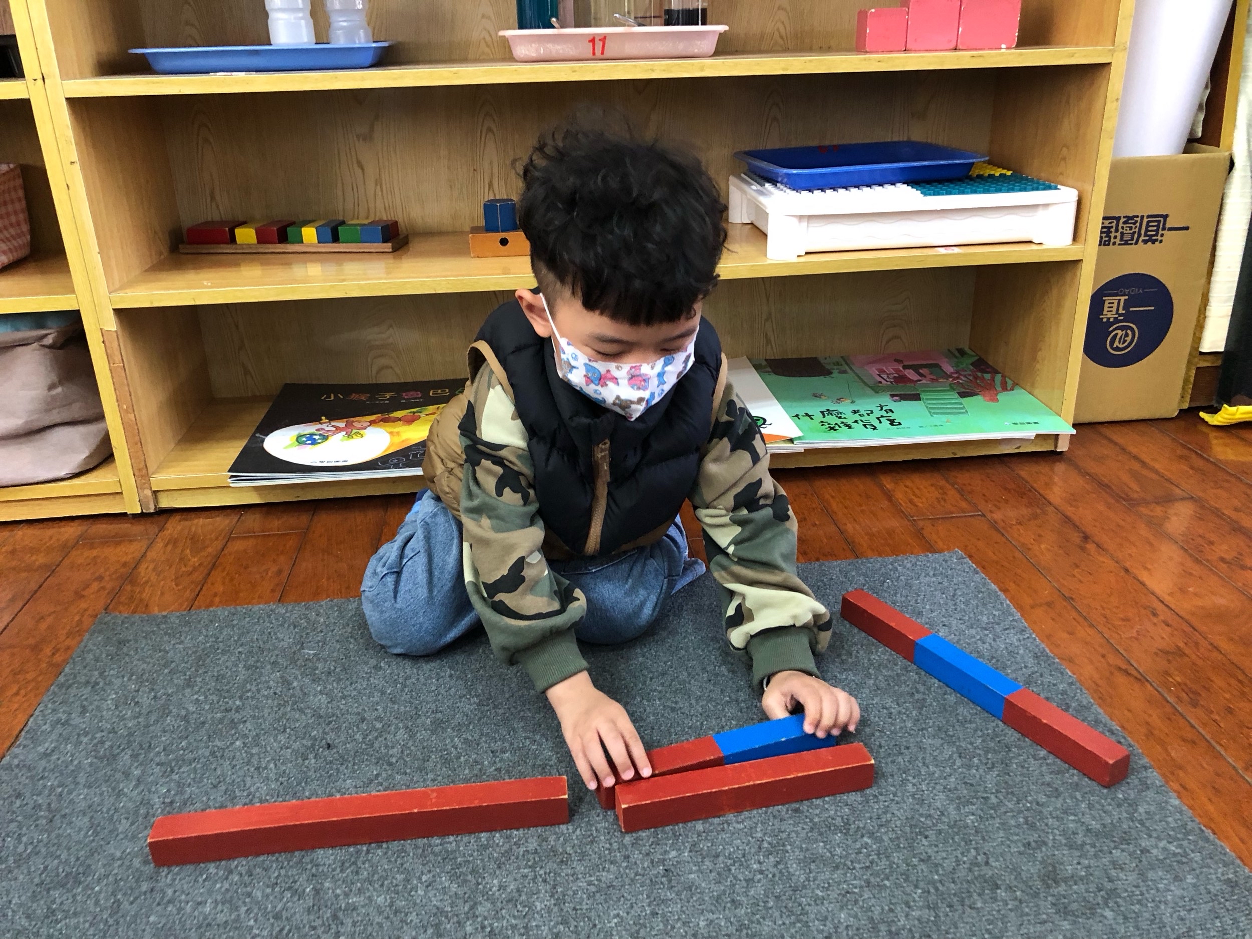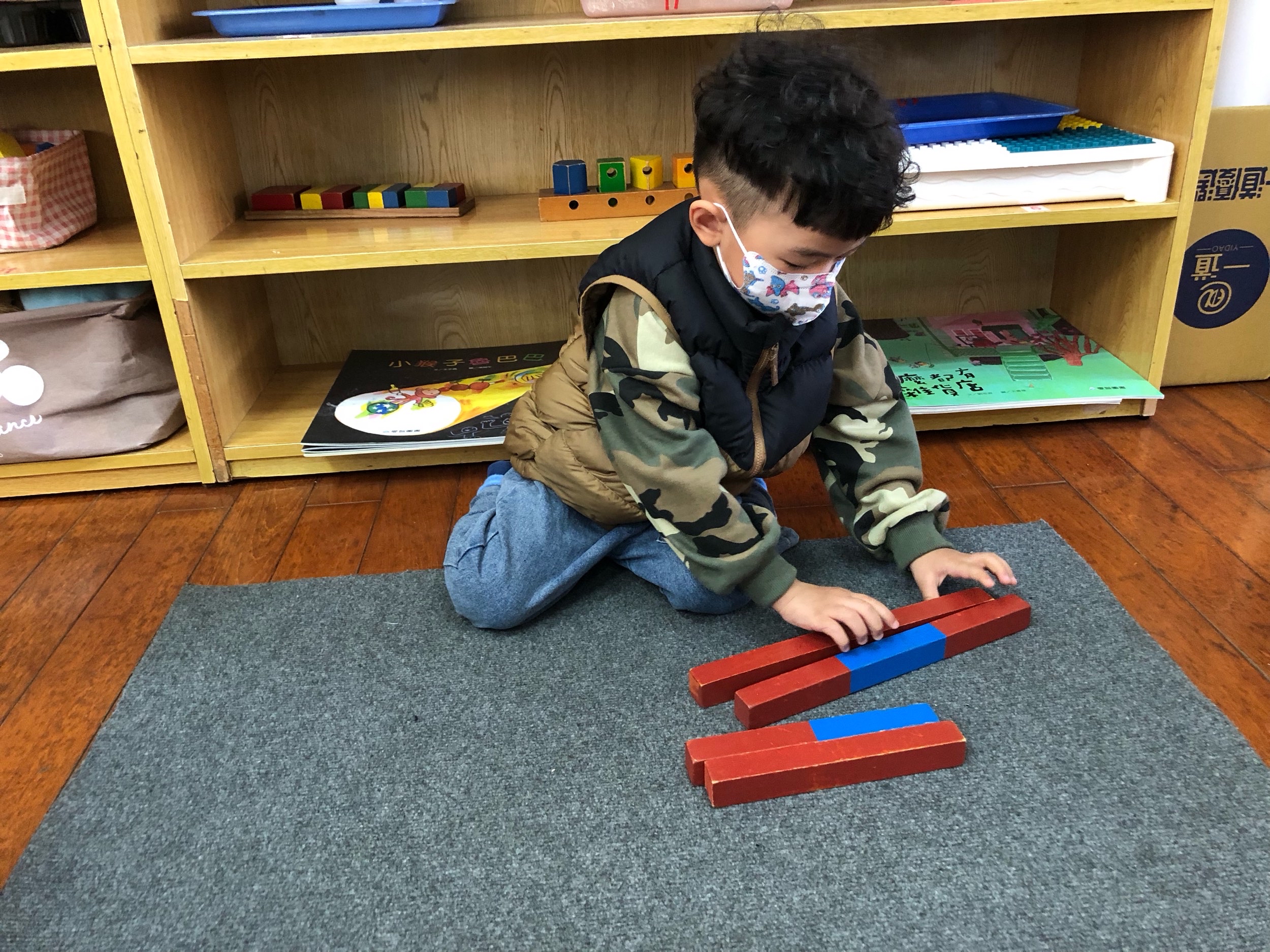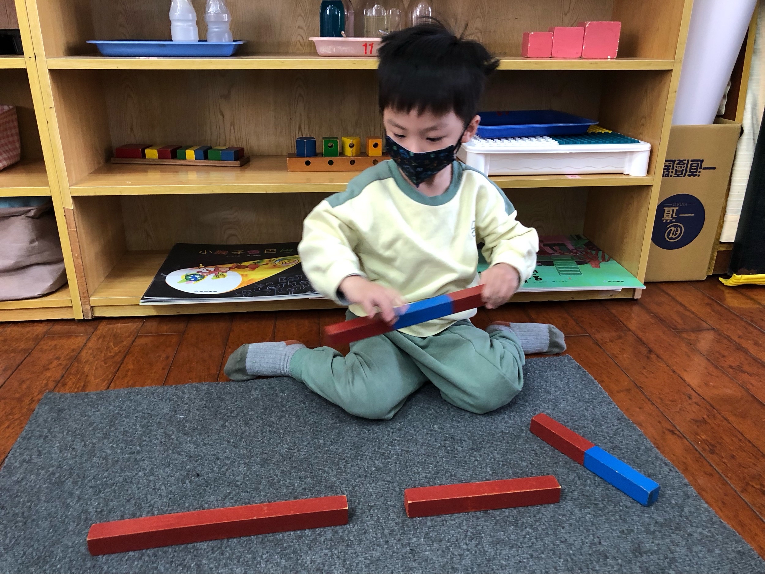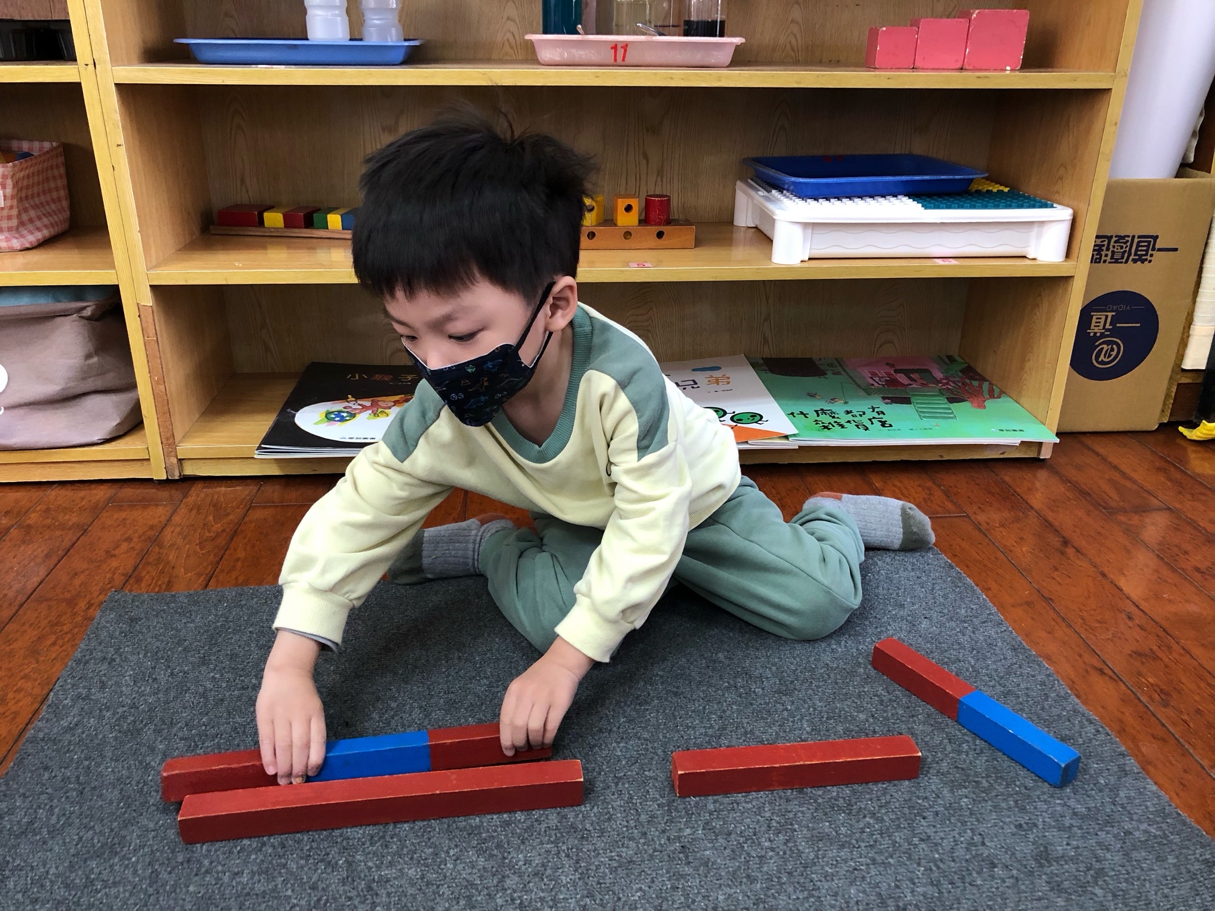 相簿名稱: 草莓班-蒙特梭利教學(數學教育-數棒+長棒「長短」配對)
