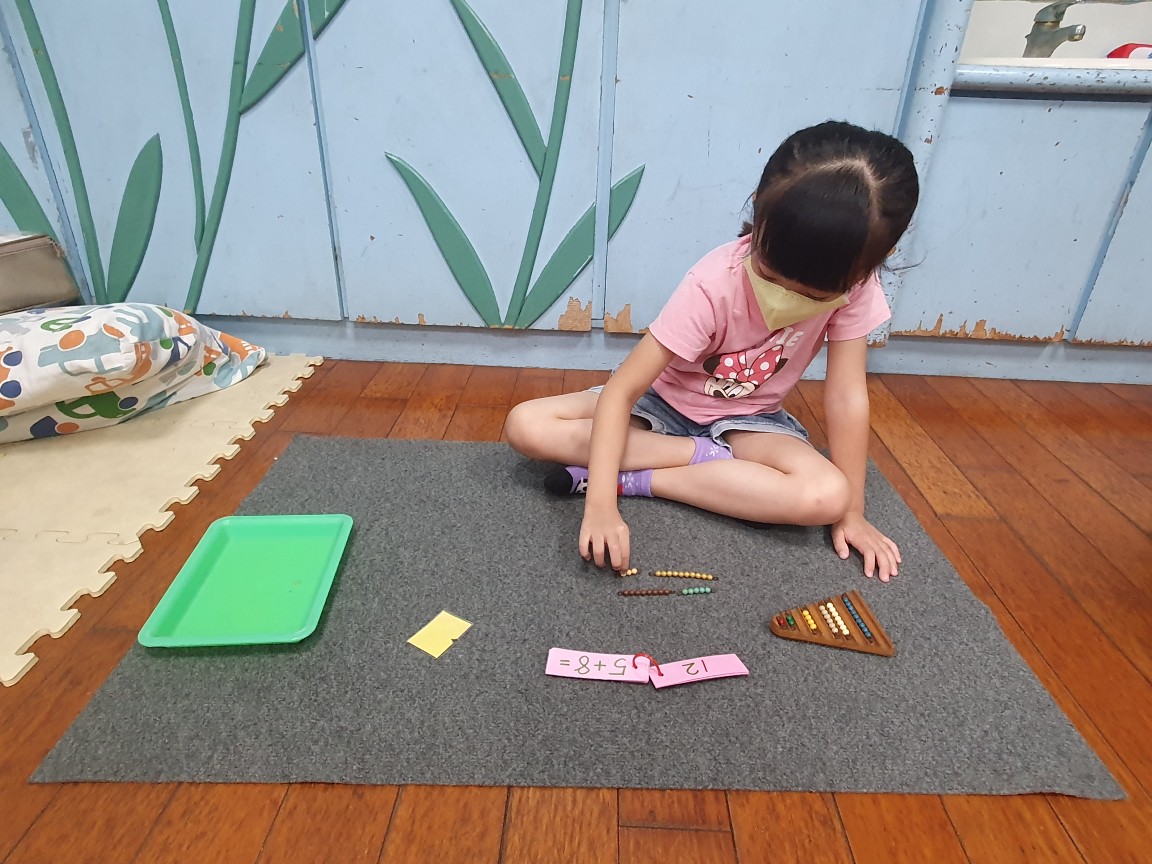 相簿名稱: 鬱金香班-蒙特梭利教學(數學教育-彩色串珠接龍遊戲(十進法一交換))