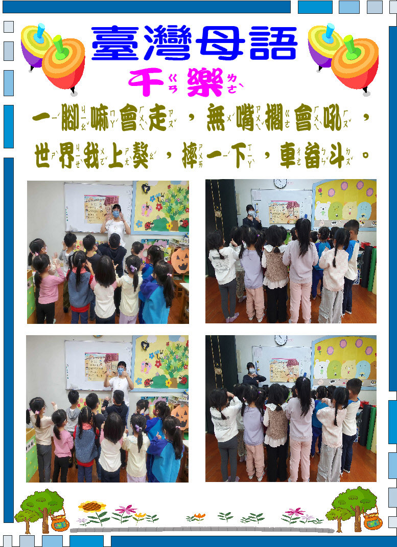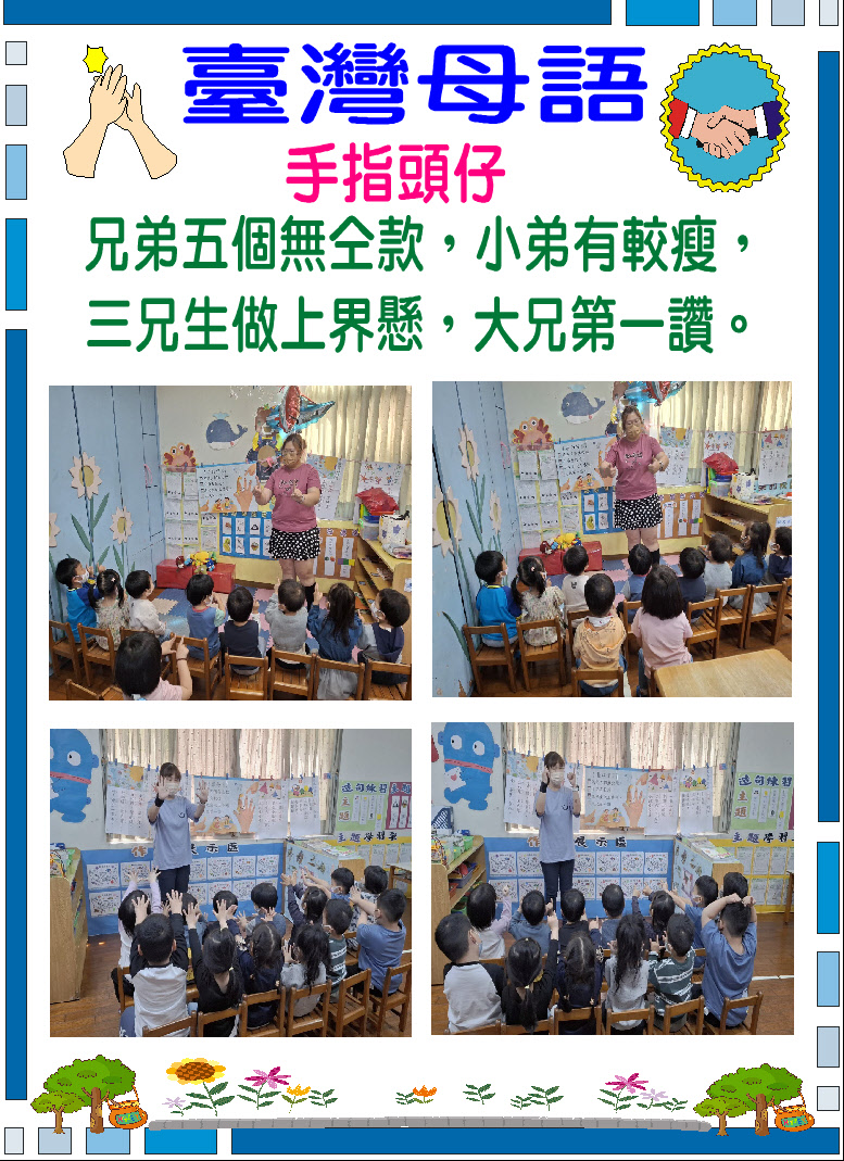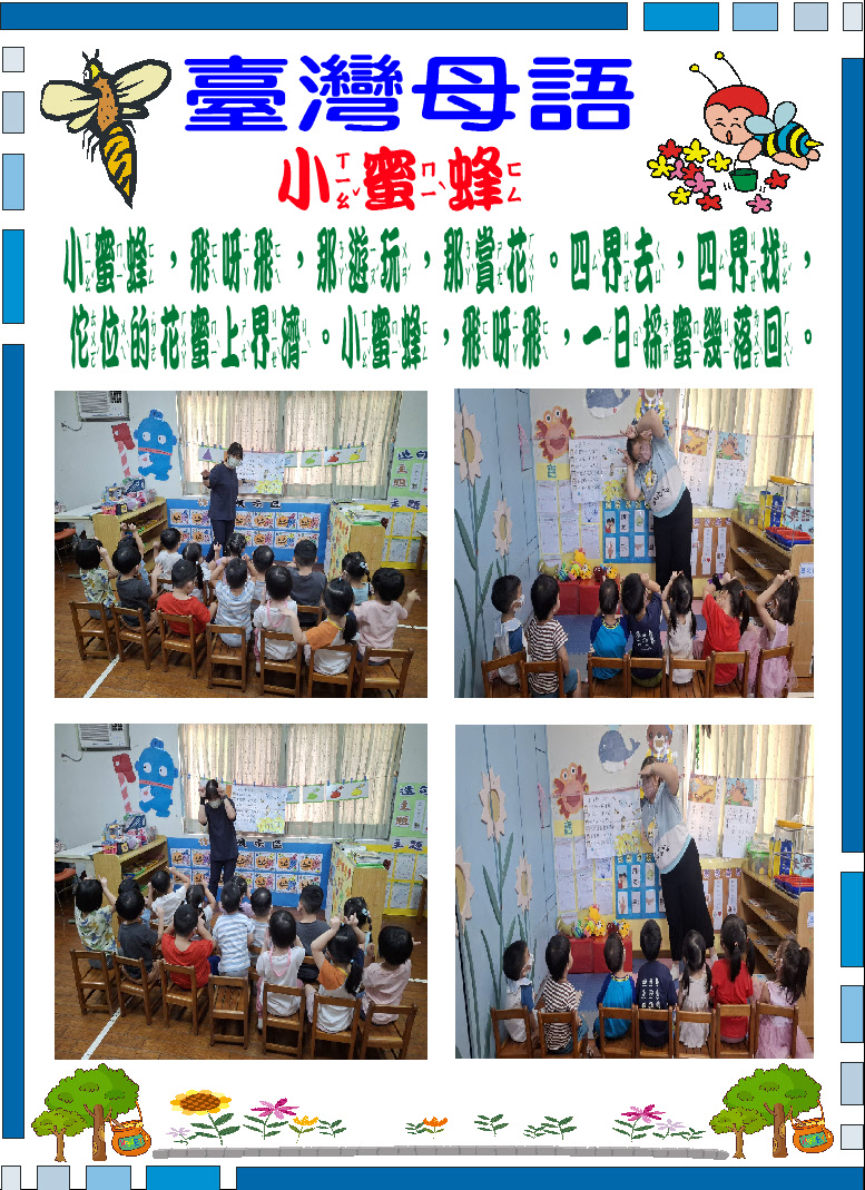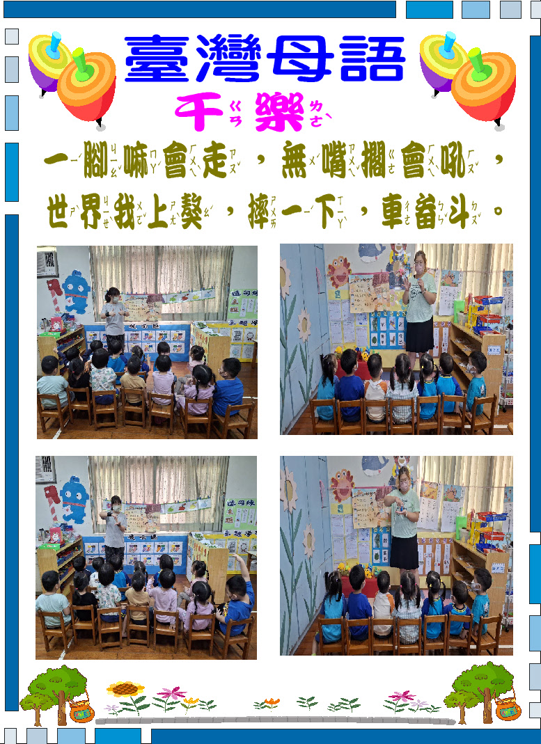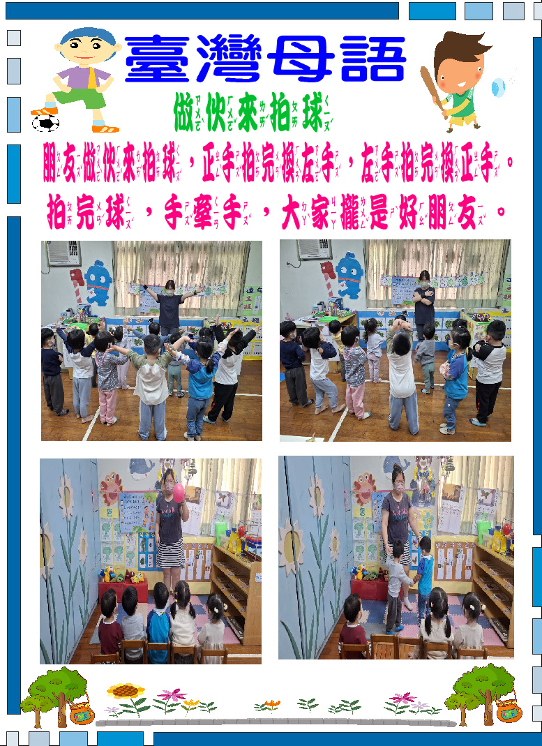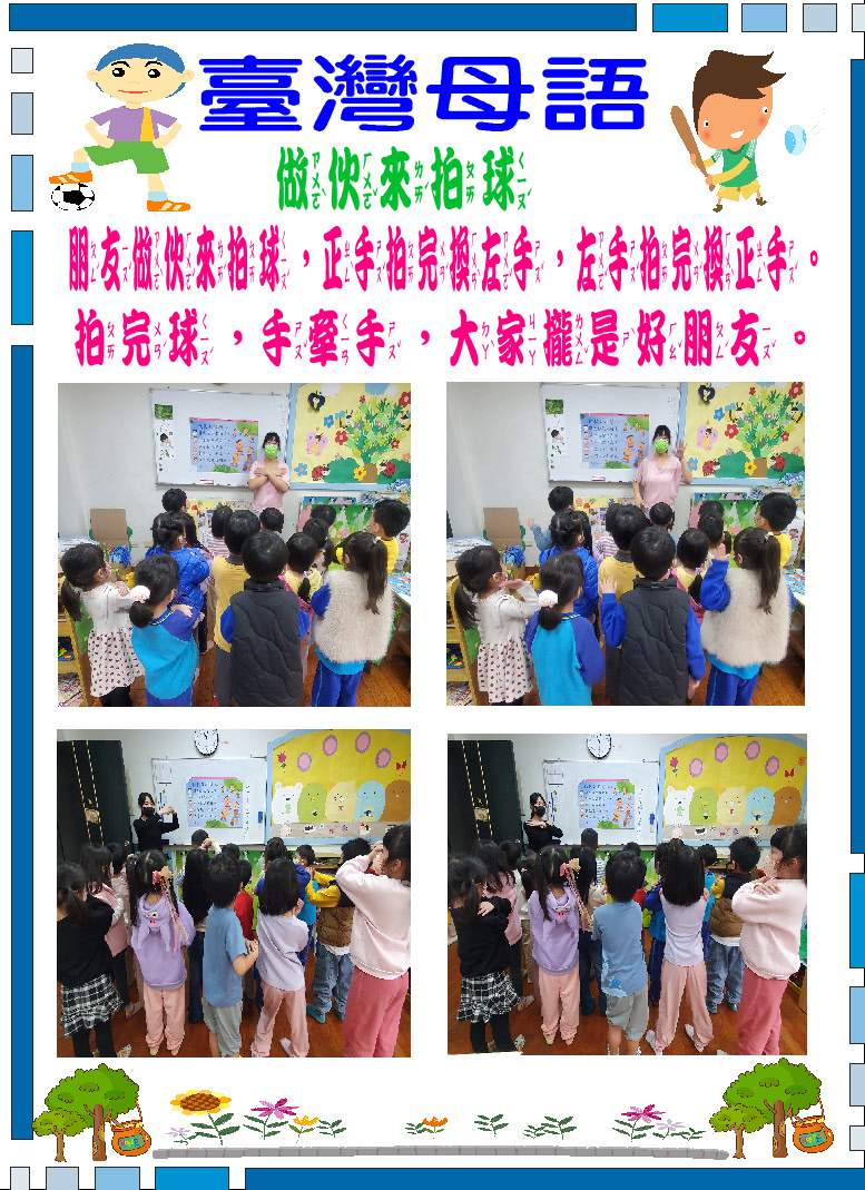 台灣母語活動計畫 | 一、 台灣母語佈告欄:台語俗諺、俚語、兒歌……等。 二、 台灣兒歌、律動歌曲教唱:利用每週一或週五的朝會活動時, 由老師輪流教唱、唸台語兒歌或律動歌曲。 三、 台灣俗諺:每週三的母語時間,由值週老師教唸台灣俗諺並講解字意。 四、 台灣母語兒歌欣賞:利用早上或下午幼兒在遊戲區遊玩的時 間、午休起床時間播放台灣母語歌謠,讓幼兒聆聽欣賞進而會朗朗上口達到學習的目的。 五、 隨機教學及互動:鼓勵全園師生於園內任何時間、任何場所都可以隨機與園長、老師、同學…用台灣母語做日常生活對話.並與國語去做雙向互動。 |