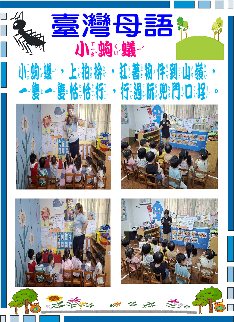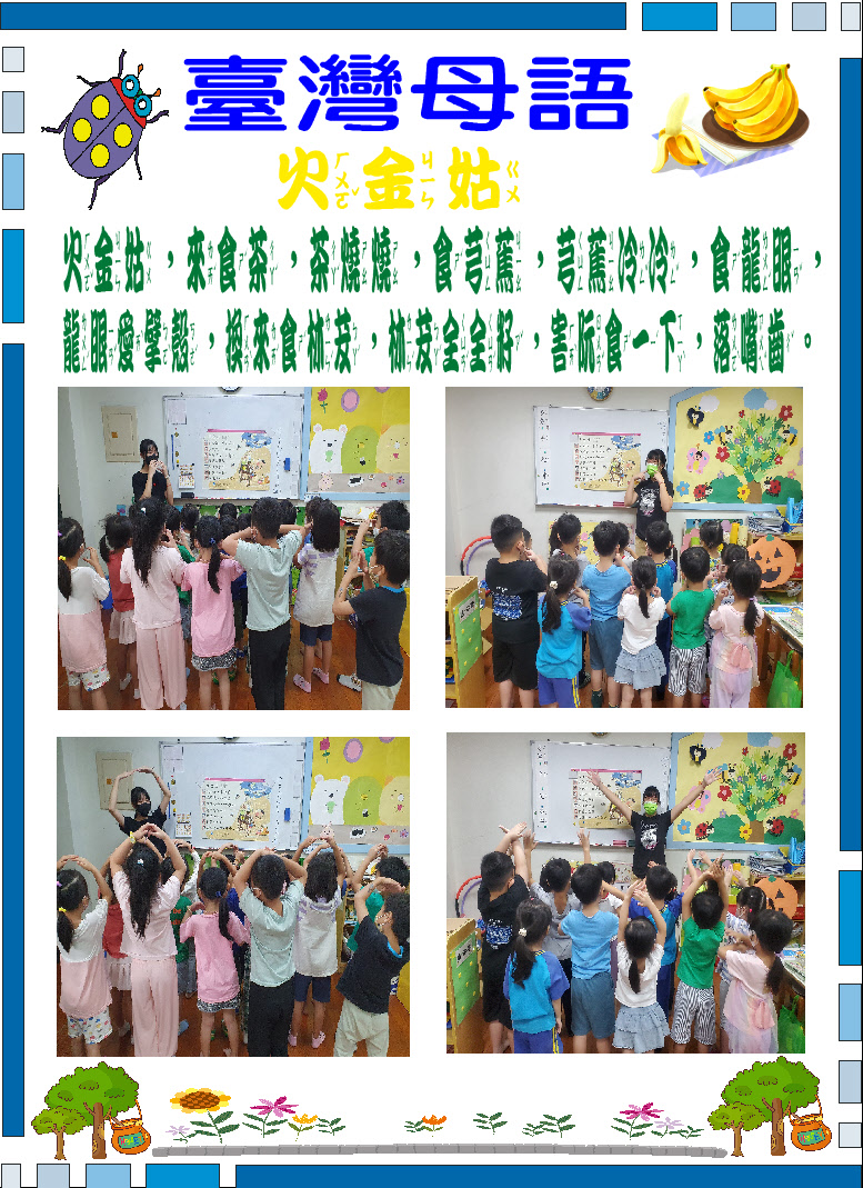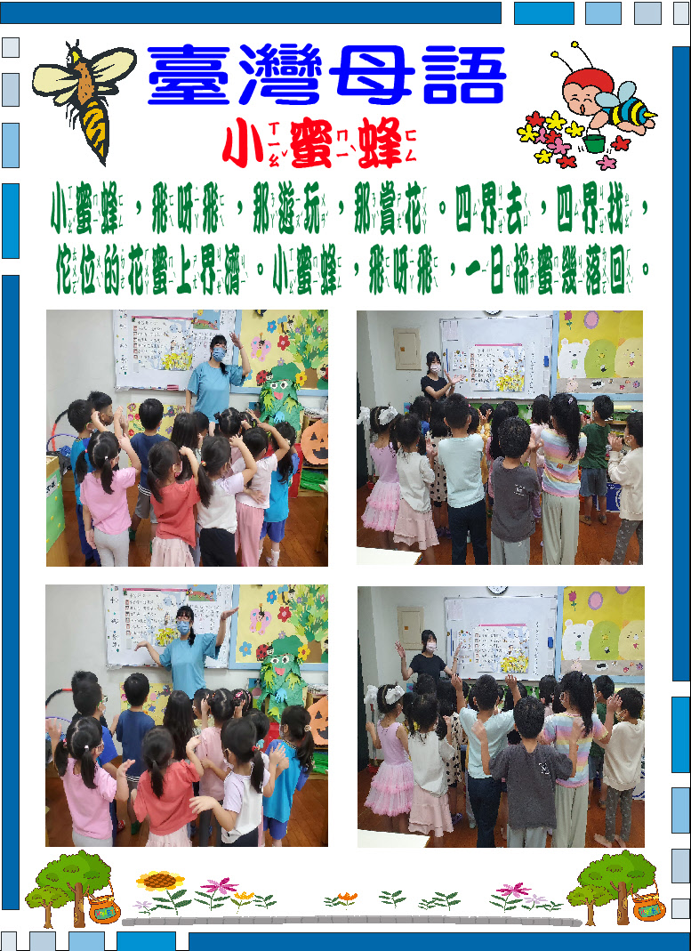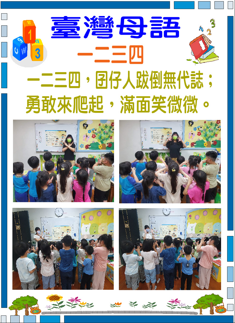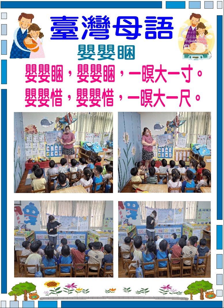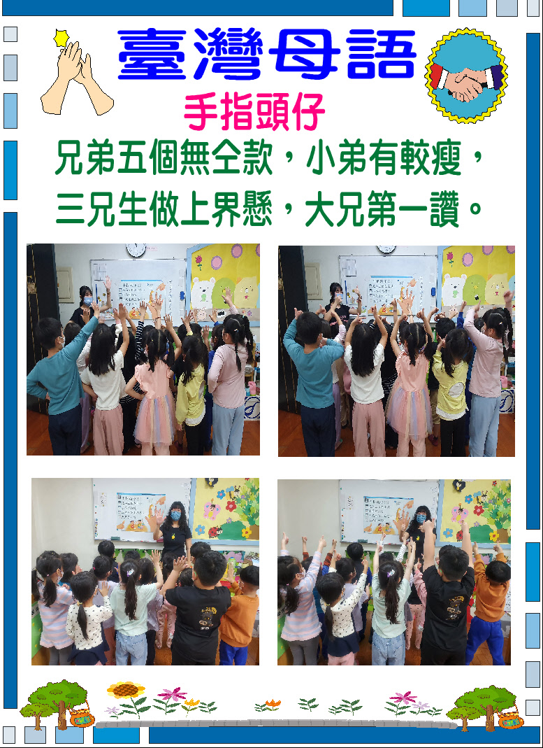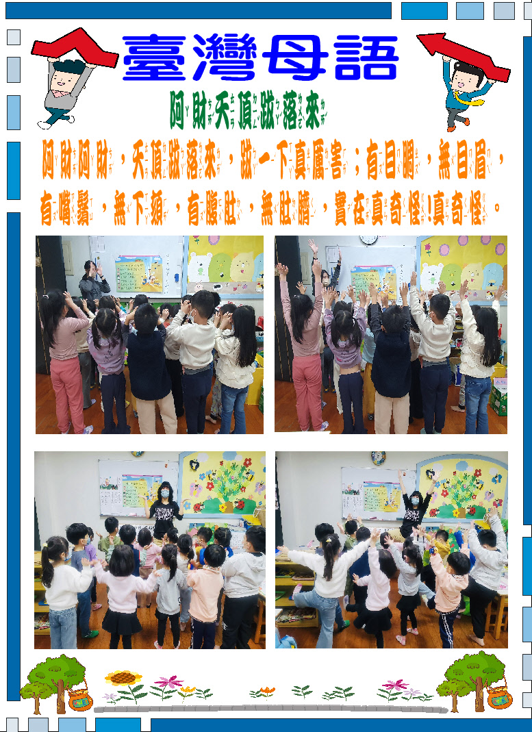 台灣母語活動計畫 | 一、 台灣母語佈告欄:台語俗諺、俚語、兒歌……等。 二、 台灣兒歌、律動歌曲教唱:利用每週一或週五的朝會活動時, 由老師輪流教唱、唸台語兒歌或律動歌曲。 三、 台灣俗諺:每週三的母語時間,由值週老師教唸台灣俗諺並講解字意。 四、 台灣母語兒歌欣賞:利用早上或下午幼兒在遊戲區遊玩的時 間、午休起床時間播放台灣母語歌謠,讓幼兒聆聽欣賞進而會朗朗上口達到學習的目的。 五、 隨機教學及互動:鼓勵全園師生於園內任何時間、任何場所都可以隨機與園長、老師、同學…用台灣母語做日常生活對話.並與國語去做雙向互動。 |