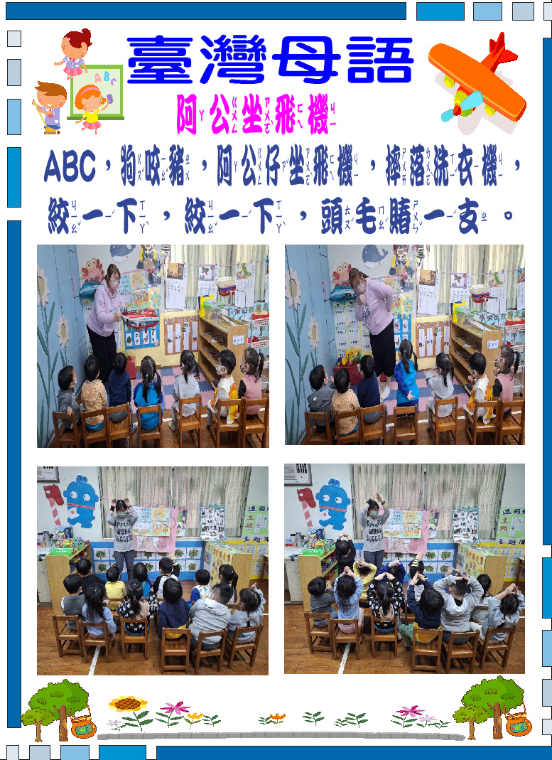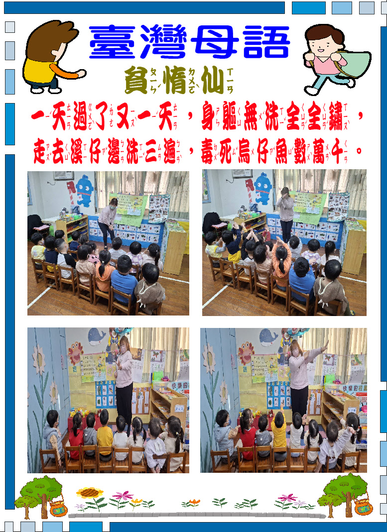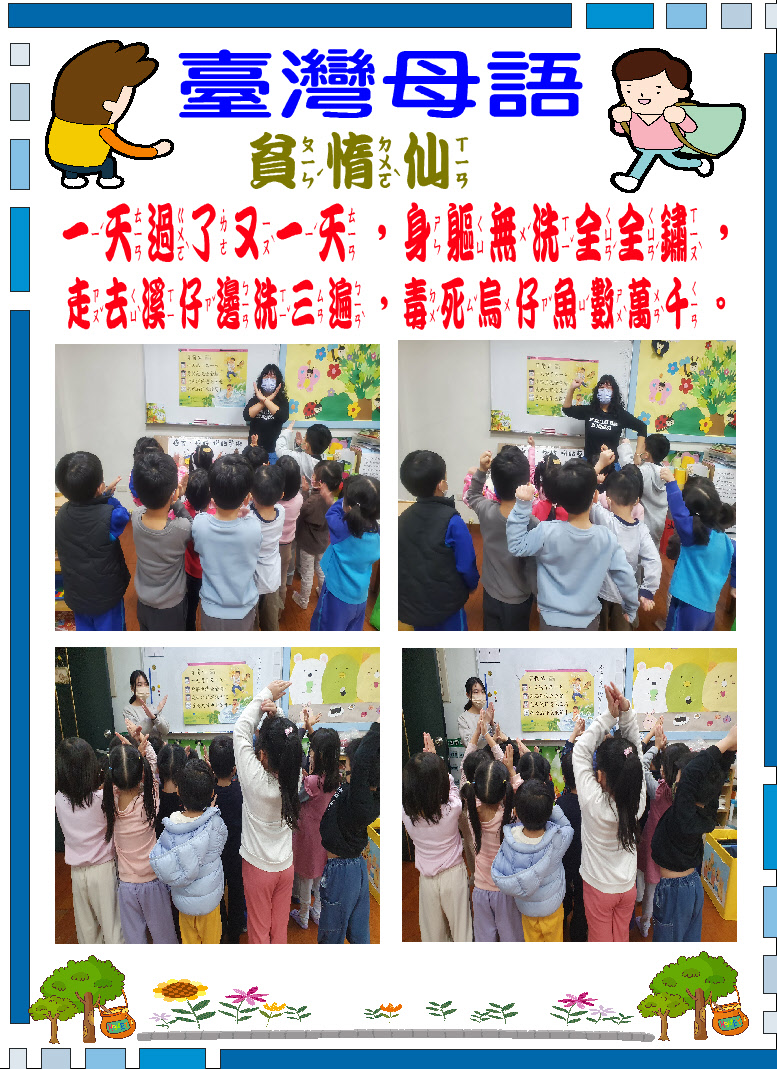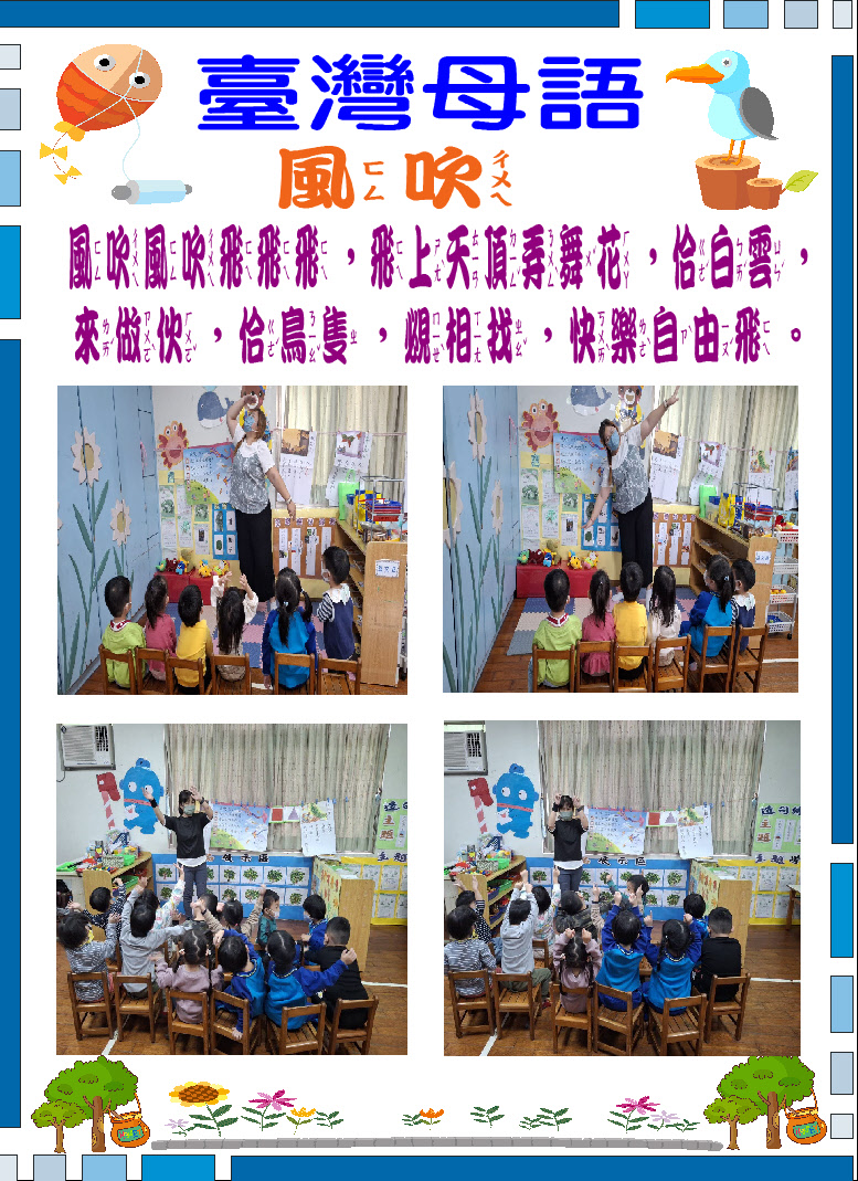 4.整合規劃幼兒鄉土語言課程聽、說、讀能力,並融合新課綱各領域課程,落實以臺灣為主體之本土化教學,讓幼兒皆能在臺灣母語日活動中做深度學習,深刻感受鄉土語言之美,進而建立愛護鄉土、關懷社會與自然之人本情懷。