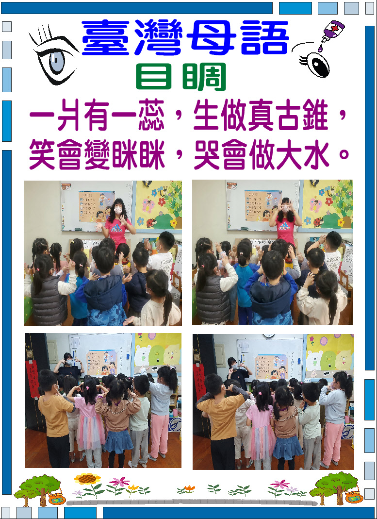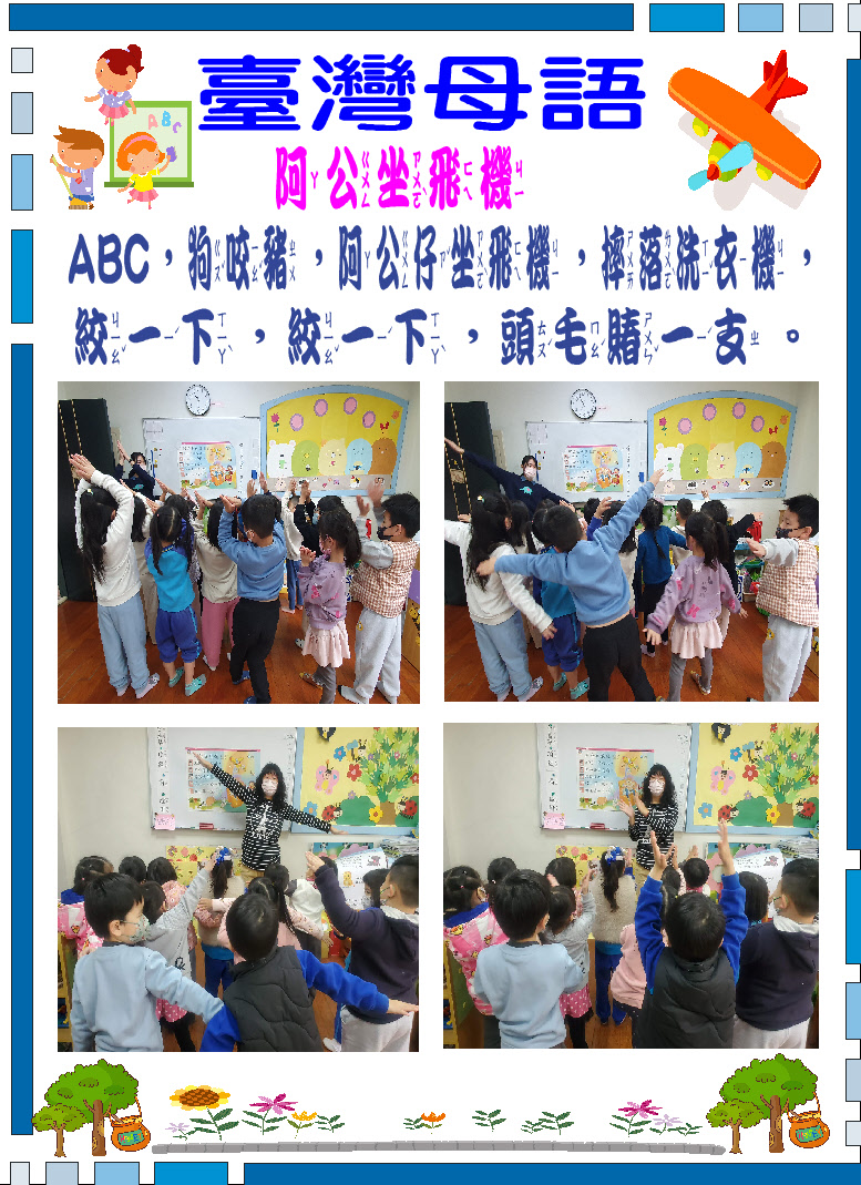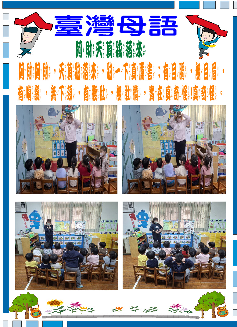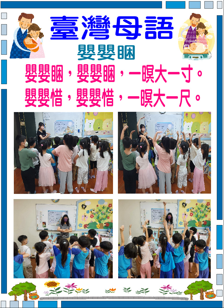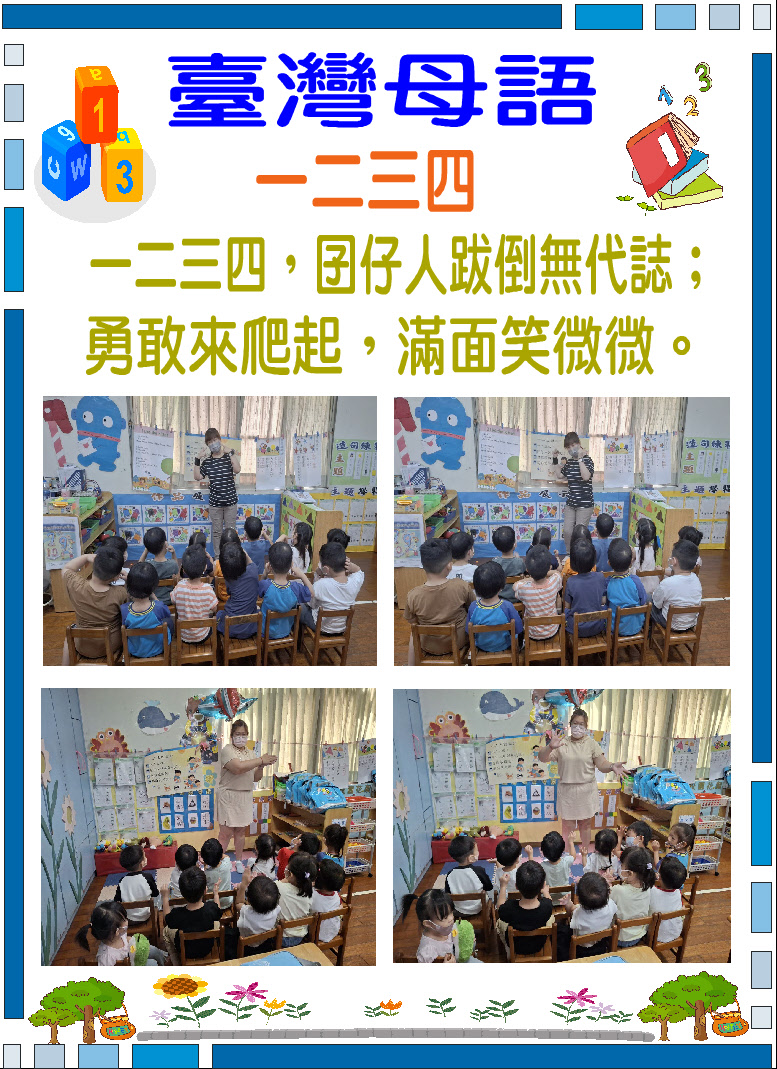 4.整合規劃幼兒鄉土語言課程聽、說、讀能力,並融合新課綱各領域課程,落實以臺灣為主體之本土化教學,讓幼兒皆能在臺灣母語日活動中做深度學習,深刻感受鄉土語言之美,進而建立愛護鄉土、關懷社會與自然之人本情懷。