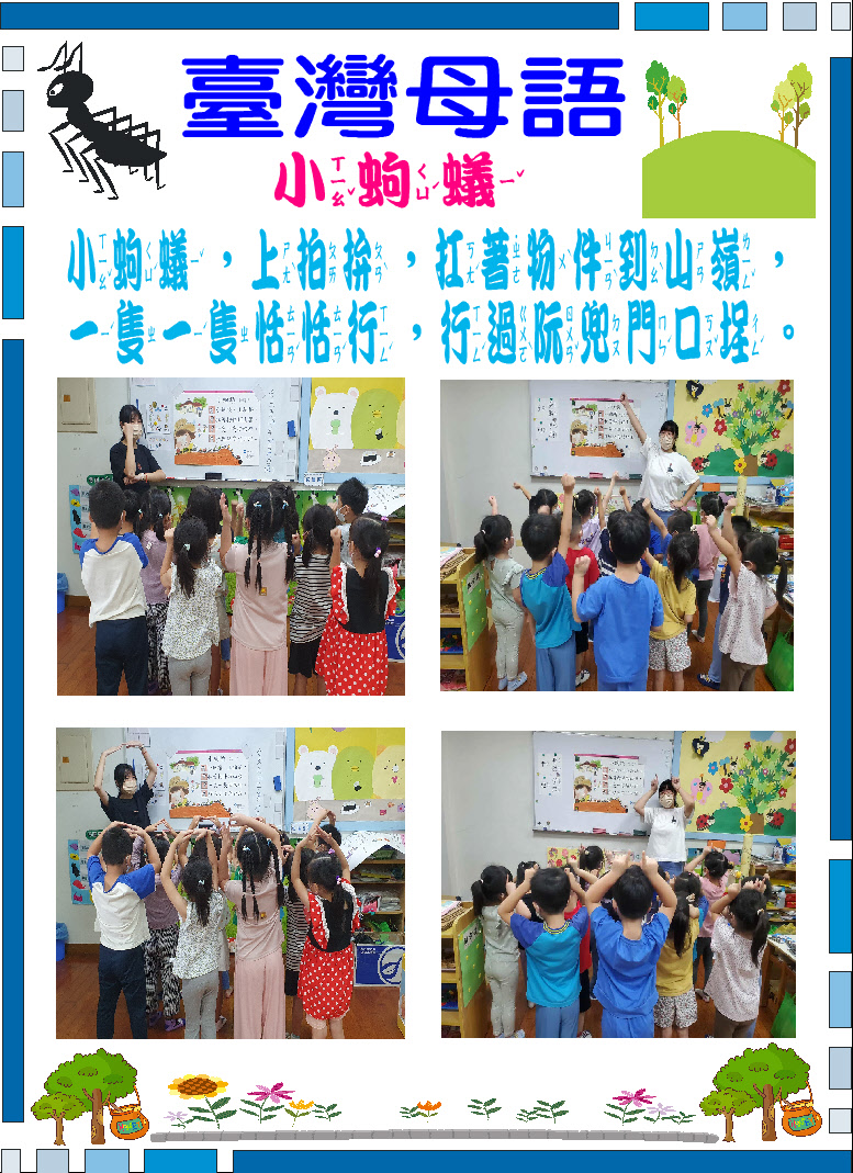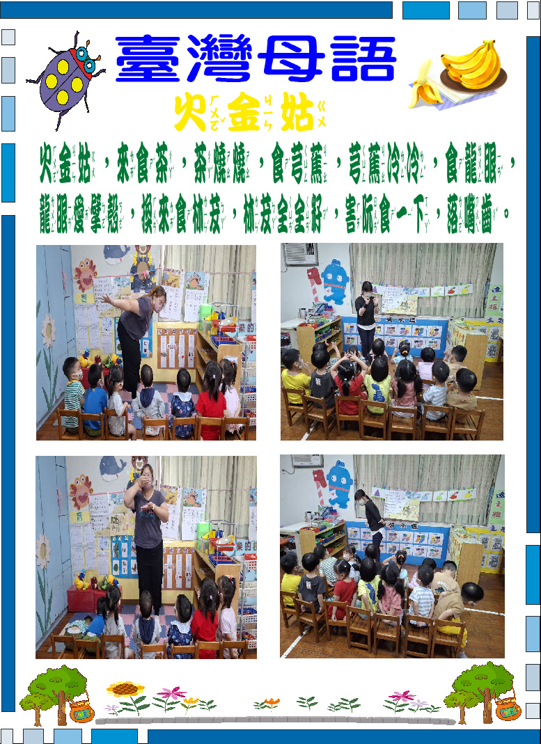 一、透過生動活潑的母語的教學,提昇幼兒對母語的喜愛並能運用流利順暢的母語與人互為溝通。